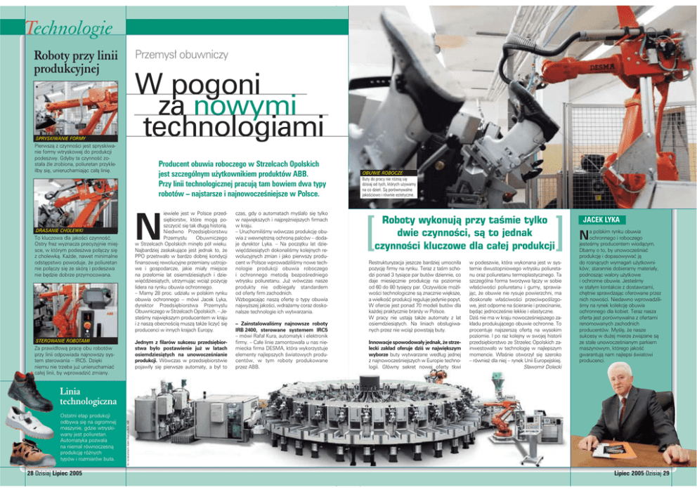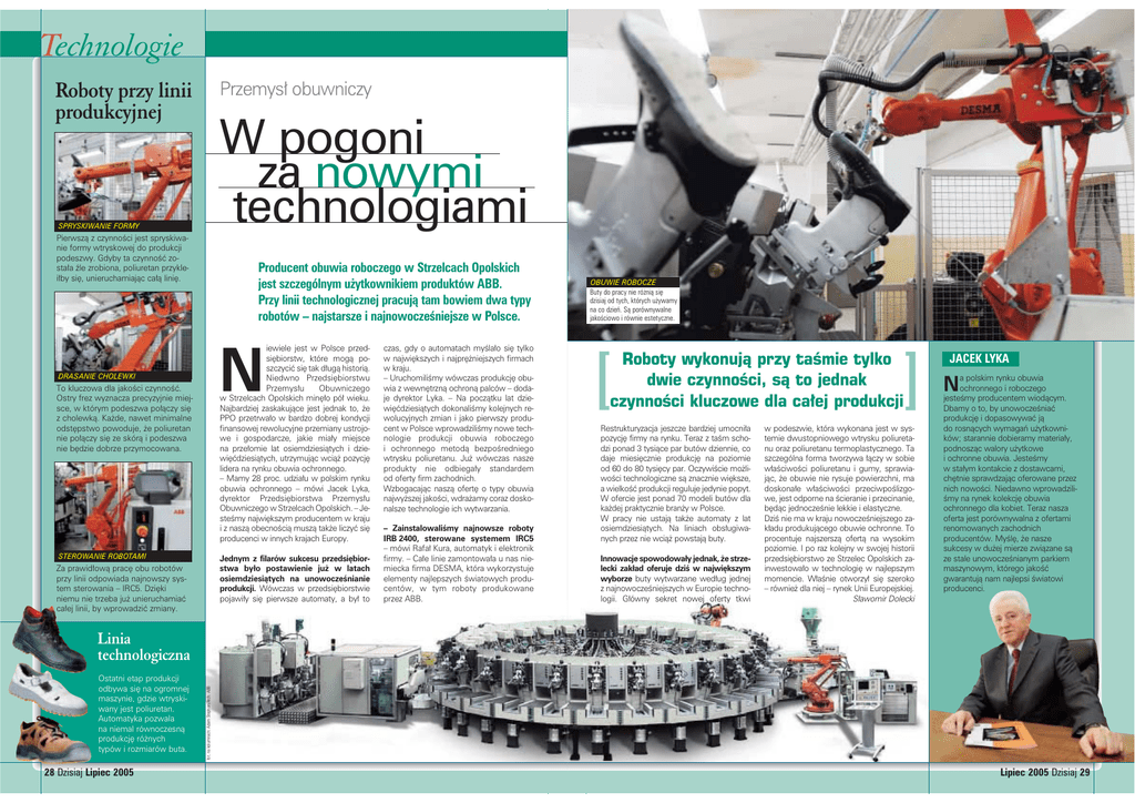 Technologie Przemys∏ obuwniczy Roboty przy linii produkcyjnej W pogoni za nowymi technologiami SPRYSKIWANIE FORMY Pierwszà z czynnoÊci jest spryskiwanie formy wtryskowej do produkcji podeszwy. Gdyby ta czynnoÊç zosta∏a êle zrobiona, poliuretan przyklei∏by si´, unieruchamiajàc ca∏à lini´. Producent obuwia roboczego w Strzelcach Opolskich jest szczególnym u˝ytkownikiem produktów ABB. Przy linii technologicznej pracujà tam bowiem dwa typy robotów – najstarsze i najnowoczeÊniejsze w Polsce. iewiele jest w Polsce przedsi´biorstw, które mogà poszczyciç si´ tak d∏ugà historià. Niedwno Przedsi´biorstwu Przemys∏u Obuwniczego w Strzelcach Opolskich min´∏o pó∏ wieku. Najbardziej zaskakujàce jest jednak to, ˝e PPO przetrwa∏o w bardzo dobrej kondycji finansowej rewolucyjne przemiany ustrojowe i gospodarcze, jakie mia∏y miejsce na prze∏omie lat osiemdziesiàtych i dziewi´çdziesiàtych, utrzymujàc wcià˝ pozycj´ lidera na rynku obuwia ochronnego. – Mamy 28 proc. udzia∏u w polskim rynku obuwia ochronnego – mówi Jacek Lyka, dyrektor Przedsi´biorstwa Przemys∏u Obuwniczego w Strzelcach Opolskich. – JesteÊmy najwi´kszym producentem w kraju i z naszà obecnoÊcià muszà tak˝e liczyç si´ producenci w innych krajach Europy. N DRASANIE CHOLEWKI To kluczowa dla jakoÊci czynnoÊç. Ostry frez wyznacza precyzyjnie miejsce, w którym podeszwa po∏àczy si´ z cholewkà. Ka˝de, nawet minimalne odst´pstwo powoduje, ˝e poliuretan nie po∏àczy si´ ze skórà i podeszwa nie b´dzie dobrze przymocowana. STEROWANIE ROBOTAMI Jednym z filarów sukcesu przedsiębiorstwa było postawienie już w latach osiemdziesiątych na unowocześnianie produkcji. Wówczas w przedsi´biorstwie pojawi∏y si´ pierwsze automaty, a by∏ to Za prawid∏owà prac´ obu robotów przy linii odpowiada najnowszy system sterowania – IRC5. Dzi´ki niemu nie trzeba ju˝ unieruchamiaç ca∏ej linii, by wprowadziç zmiany. czas, gdy o automatach myÊla∏o si´ tylko w najwi´kszych i najpr´˝niejszych firmach w kraju. – UruchomiliÊmy wówczas produkcj´ obuwia z wewn´trznà ochronà palców – dodaje dyrektor Lyka. – Na poczàtku lat dziewi´çdziesiàtych dokonaliÊmy kolejnych rewolucyjnych zmian i jako pierwszy producent w Polsce wprowadziliÊmy nowe technologie produkcji obuwia roboczego i ochronnego metodà bezpoÊredniego wtrysku poliuretanu. Ju˝ wówczas nasze produkty nie odbiega∏y standardem od oferty firm zachodnich. Wzbogacajàc naszà ofert´ o typy obuwia najwy˝szej jakoÊci, wdra˝amy coraz doskonalsze technologie ich wytwarzania. – Zainstalowaliśmy najnowsze roboty IRB 2400, sterowane systemem IRC5 – mówi Rafa∏ Kura, automatyk i elektronik firmy. – Ca∏e linie zamontowa∏a u nas niemiecka firma DESMA, która wykorzystuje elementy najlepszych Êwiatowych producentów, w tym roboty produkowane przez ABB. OBUWIE ROBOCZE Buty do pracy nie ró˝nià si´ dzisiaj od tych, których u˝ywamy na co dzieƒ. Sà porównywalne jakoÊciowo i równie estetyczne. Roboty wykonujà przy taÊmie tylko dwie czynnoÊci, sà to jednak czynnoÊci kluczowe dla ca∏ej produkcji Restrukturyzacja jeszcze bardziej umocni∏a pozycj´ firmy na rynku. Teraz z taÊm schodzi ponad 3 tysiàce par butów dziennie, co daje miesi´cznie produkcj´ na poziomie od 60 do 80 tysi´cy par. OczywiÊcie mo˝liwoÊci technologiczne sà znacznie wi´ksze, a wielkoÊç produkcji reguluje jedynie popyt. W ofercie jest ponad 70 modeli butów dla ka˝dej praktycznie bran˝y w Polsce. W pracy nie ustajà tak˝e automaty z lat osiemdziesiàtych. Na liniach obs∏ugiwanych przez nie wcià˝ powstajà buty. Innowacje spowodowały jednak, że strzelecki zakład oferuje dziś w największym wyborze buty wytwarzane wed∏ug jednej z najnowoczeÊniejszych w Europie technologii. G∏ówny sekret nowej oferty tkwi w podeszwie, która wykonana jest w systemie dwustopniowego wtrysku poliuretanu oraz poliuretanu termoplastycznego. Ta szczególna forma tworzywa ∏àczy w sobie w∏aÊciwoÊci poliuretanu i gumy, sprawiajàc, ˝e obuwie nie rysuje powierzchni, ma doskona∏e w∏aÊciwoÊci przeciwpoÊlizgowe, jest odporne na Êcieranie i przecinanie, b´dàc jednoczeÊnie lekkie i elastyczne. DziÊ nie ma w kraju nowoczeÊniejszego zak∏adu produkujàcego obuwie ochronne. To procentuje najszerszà ofertà na wysokim poziomie. I po raz kolejny w swojej historii przedsi´biorstwo ze Strzelec Opolskich zainwestowa∏o w technologi´ w najlepszym momencie. W∏aÊnie otworzy∏ si´ szeroko – równie˝ dla niej – rynek Unii Europejskiej. S∏awomir Dolecki JACEK LYKA a polskim rynku obuwia N ochronnego i roboczego jesteÊmy producentem wiodàcym. Dbamy o to, by unowoczeÊniaç produkcj´ i dopasowywaç jà do rosnàcych wymagaƒ u˝ytkowników; starannie dobieramy materia∏y, podnoszàc walory u˝ytkowe i ochronne obuwia. JesteÊmy w sta∏ym kontakcie z dostawcami, ch´tnie sprawdzajàc oferowane przez nich nowoÊci. Niedawno wprowadziliÊmy na rynek kolekcj´ obuwia ochronnego dla kobiet. Teraz nasza oferta jest porównywalna z ofertami renomowanych zachodnich producentów. MyÊl´, ˝e nasze sukcesy w du˝ej mierze zwiàzane sà ze stale unowoczeÊnianym parkiem maszynowym, którego jakoÊç gwarantujà nam najlepsi Êwiatowi producenci. Ostatni etap produkcji odbywa si´ na ogromnej maszynie, gdzie wtryskiwany jest poliuretan. Automatyka pozwala na niemal równoczesnà produkcj´ ró˝nych typów i rozmiarów buta. 28 Dzisiaj Lipiec 2005 fot. na kolumnach: Adam Stephan/Arch. ABB Linia technologiczna Lipiec 2005 Dzisiaj 29