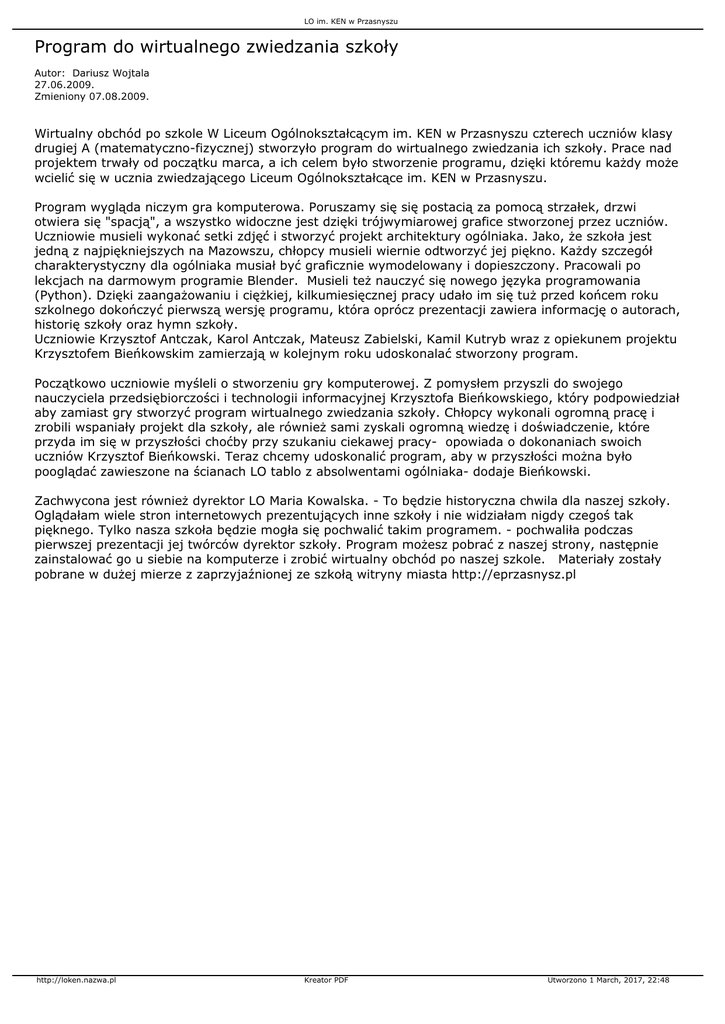 LO im. KEN w Przasnyszu Program do wirtualnego zwiedzania szkoły Autor: Dariusz Wojtala 27.06.2009. Zmieniony 07.08.2009. Wirtualny obchód po szkole W Liceum Ogólnokształcącym im. KEN w Przasnyszu czterech uczniów klasy drugiej A (matematyczno-fizycznej) stworzyło program do wirtualnego zwiedzania ich szkoły. Prace nad projektem trwały od początku marca, a ich celem było stworzenie programu, dzięki któremu każdy może wcielić się w ucznia zwiedzającego Liceum Ogólnokształcące im. KEN w Przasnyszu. Program wygląda niczym gra komputerowa. Poruszamy się się postacią za pomocą strzałek, drzwi otwiera się "spacją", a wszystko widoczne jest dzięki trójwymiarowej grafice stworzonej przez uczniów. Uczniowie musieli wykonać setki zdjęć i stworzyć projekt architektury ogólniaka. Jako, że szkoła jest jedną z najpiękniejszych na Mazowszu, chłopcy musieli wiernie odtworzyć jej piękno. Każdy szczegół charakterystyczny dla ogólniaka musiał być graficznie wymodelowany i dopieszczony. Pracowali po lekcjach na darmowym programie Blender. Musieli też nauczyć się nowego języka programowania (Python). Dzięki zaangażowaniu i ciężkiej, kilkumiesięcznej pracy udało im się tuż przed końcem roku szkolnego dokończyć pierwszą wersję programu, która oprócz prezentacji zawiera informację o autorach, historię szkoły oraz hymn szkoły. Uczniowie Krzysztof Antczak, Karol Antczak, Mateusz Zabielski, Kamil Kutryb wraz z opiekunem projektu Krzysztofem Bieńkowskim zamierzają w kolejnym roku udoskonalać stworzony program. Początkowo uczniowie myśleli o stworzeniu gry komputerowej. Z pomysłem przyszli do swojego nauczyciela przedsiębiorczości i technologii informacyjnej Krzysztofa Bieńkowskiego, który podpowiedział aby zamiast gry stworzyć program wirtualnego zwiedzania szkoły. Chłopcy wykonali ogromną pracę i zrobili wspaniały projekt dla szkoły, ale również sami zyskali ogromną wiedzę i doświadczenie, które przyda im się w przyszłości choćby przy szukaniu ciekawej pracy- opowiada o dokonaniach swoich uczniów Krzysztof Bieńkowski. Teraz chcemy udoskonalić program, aby w przyszłości można było pooglądać zawieszone na ścianach LO tablo z absolwentami ogólniaka- dodaje Bieńkowski. Zachwycona jest również dyrektor LO Maria Kowalska. - To będzie historyczna chwila dla naszej szkoły. Oglądałam wiele stron internetowych prezentujących inne szkoły i nie widziałam nigdy czegoś tak pięknego. Tylko nasza szkoła będzie mogła się pochwalić takim programem. - pochwaliła podczas pierwszej prezentacji jej twórców dyrektor szkoły. Program możesz pobrać z naszej strony, następnie zainstalować go u siebie na komputerze i zrobić wirtualny obchód po naszej szkole. Materiały zostały pobrane w dużej mierze z zaprzyjaźnionej ze szkołą witryny miasta http://eprzasnysz.pl http://loken.nazwa.pl Kreator PDF Utworzono 1 March, 2017, 22:48