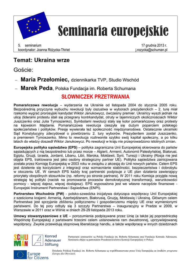 Seminaria europejskie 5. seminarium koordynator: Joanna Różycka-Thiriet 17 grudnia 2013 r. [email protected] Temat: Ukraina wrze Goście: Maria Przełomiec, dziennikarka TVP, Studio Wschód Marek Peda, Polska Fundacja im. Roberta Schumana SŁOWNICZEK PRZETRWANIA Pomarańczowa rewolucja – wydarzenia na Ukrainie od listopada 2004 do stycznia 2005 roku. Bezpośrednią przyczyna wybuchu rewolucji były oszustwa w wyborach prezydenckich – 2. turę miał rzekomo wygrać prorosyjski kandydat Wiktor Janukowycz, ówczesny premier. Ukraińcy wyszli jednak na ulicę (liderami protestu stali się przegrany kontrkandydat, otruty w tajemniczych okolicznościach Wiktor Juszczenko oraz Julia Tymoszenko). Symbolami rewolucji stały się kolor pomarańczowy oraz protesty na kijowskim Majdanie. Pomarańczowa rewolucja cieszyła się dużym poparciem polskiego społeczeństwa i polityków. Presję wywierała też społeczność międzynarodowa. Ostatecznie ukraiński Sąd Konstytucyjny zdecydował o powtórzeniu 2. tury wyborów. Prezydentem został Juszczenko, a premierem Tymoszenko. Mimo to rewolucja roztrwoniła szybko swój kapitał społeczny, a po kilku latach do władzy doszedł Wiktor Janukowycz. Po rewolucji w kraju nie przeprowadzono istotnych zmian. Europejska polityka sąsiedztwa (EPS) – polityka zagraniczna Unii Europejskiej skierowana do państw sąsiadujących z nią bezpośrednio lub przez morze – Algierii, Armenii, Autonomii Palestyńskiej, Białorusi, Egiptu, Gruzji, Izraela, Jordanii, Libanu, Libii, Maroka, Mołdawii, Syrii, Tunezji i Ukrainy (Rosja nie jest objęta EPS, traktowana jest jako osobny strategiczny partner UE). Polityka sąsiedztwa zainicjowana została przez Komisję Europejską w 2003 roku w związku z akcesją do Unii nowych państw. Celem EPS jest dzielenie się korzyściami z integracji oraz wzmacnianie stabilności, bezpieczeństwa i dobrobytu w otoczeniu UE. W ramach EPS każdy kraj partnerski podpisuje z UE plan działania zawierający priorytety obopólnych stosunków (np. reformy po stronie partnera). W 2011 roku Komisja przyjęła nową strategię tej polityki (nacisk na promowanie procesów demokratycznej transformacji, warunkowości pomocy - więcej dajesz, więcej dostajesz). EPS wyposażona jest we własne narzędzie finansowe Europejski Instrument Partnerstwa i Sąsiedztwa (ENPI). Partnerstwo Wschodnie (PW) - polsko-szwedzka inicjatywa dotycząca współpracy Unii Europejskiej z sześcioma krajami: Armenią, Azerbejdżanem, Białorusią, Gruzją, Mołdawią i Ukrainą. Głównym celem Partnerstwa jest sprzyjanie zbliżeniu politycznemu i gospodarczemu między UE oraz wymienionymi państwami. Do tej pory odbyły się 3 szczyty Partnerstwa – inauguracyjny w Pradze w 2009, w Warszawie w 2011 oraz w Wilnie w dniach 29-29 listopada 2013 roku. Umowy stowarzyszeniowe z UE – porozumienia podpisywane przez Unię (a także jej poprzedniczkę Wspólnotę Europejską) z państwami trzecimi celem ustanowienia ram dwustronnej, uprzywilejowanej współpracy. Zwykle przewidują stopniową liberalizację handlu, a także współpracę w innych dziedzinach Partnerami seminariów są Polska Fundacja im. Roberta Schumana oraz Fundacja Konrada Adenauera. Seminaria objęte są patronatem Przedstawicielstwa Komisji Europejskiej w Polsce. Działania Polskiej Fundacji im. Roberta Schumana są współfinansowane przez Unię Europejską ze środków programu Europa dla Obywateli. oraz dwustronne ciała zarządzające tą współpracą. W niektórych przypadkach umowy są przygotowaniem do członkostwa w UE. Pierwsze umowy stowarzyszeniowe podpisano z Grecją w 1961 i Turcją w 1963. Układy stowarzyszeniowe zawarły z UE m.in. kraje śródziemnomorskie. Podczas listopadowego szczytu Partnerstwa Wschodniego takie porozumienia z UE parafowały Gruzja i Mołdawia. Nie doszło jednak do podpisania umowy z Ukrainą. Państwo to podjęło decyzję o tymczasowym zawieszeniu przygotowań do podpisania negocjowanej od 2007 do 2011 roku umowy. DOBRZE POWIEDZIANE – FRAZA DNIA Te brudne machinacje z tekstami ustaw, w które zaangażowani są deputowani partii władzy, nie wystraszą mnie i nie powstrzymają. Żeby uciąć próby rozprawienia się ze mną jako z możliwym kandydatem chcę ogłosić: startuję w wyborach prezydenckich - oznajmił Witalij Kliczko 24 października 2013 roku z trybuny parlamentarnej podczas debaty nad zmianą ustawy podatkowej (od tej pory osobę z prawem pobytu w innym państwie uważa się za osobę, która nie mieszka na Ukrainie, a kandydaci na prezydenta muszą mieszkać na Ukrainie na stałe przez minimum 10 lat; Kliczko by więc tego kryterium nie spełniał). Były bokserski mistrz świata organizacji WBC w wadze ciężkiej, doktor filozofii i lider opozycyjnej partii UDAR wyrasta na lidera opozycji i głównego konkurenta Wiktora Janukowycza w wyborach w 2015 roku. Jest jedną z twarzy aktualnych ukraińskich protestów obok Arsenija Jaceniuka z partii Batkiwszczyna i Oleha Tiahnyboka z partii Swoboda. PORTRETY MNIEJ ZNANYCH MĘŻCZYZN I KOBIET Ur. w 1960 roku Julia Tymoszenko była dwukrotnie premierem Ukrainy - w 2005 roku oraz w latach 2007-20010. Związana jest z prawicową partią Batkiwszczyna (Ojczyzna) oraz koalicją Blokiem Julii Tymoszenko. Z wykształcenia doktor ekonomii. Zanim wypłynęła na szersze polityczne wody dorobiła się pieniędzy w branży energetycznej. W 1996 została po raz pierwszy deputowaną do Rady Najwyższej (jednoizbowego parlamentu), a w 1999 wicepremierem w rządzie Wiktora Juszczenki. W 2004 Tymoszenko popiera kandydaturę Juszczenki na prezydenta. Aktywnie uczestniczy w pomarańczowej rewolucji, stając się jedną z jej twarzy. W styczniu 2005 roku zostaje premierem, ale po konflikcie z obozem prezydenckim zostaje zdymisjonowana. Po przedterminowych wyborach w 2007 Blok Julii Tymoszenko i Nasza Ukraina-Ludowa Samoobrona Juszczenki tworzą koalicję rządową. Jednak kłótnie liderów pomarańczowej opozyc