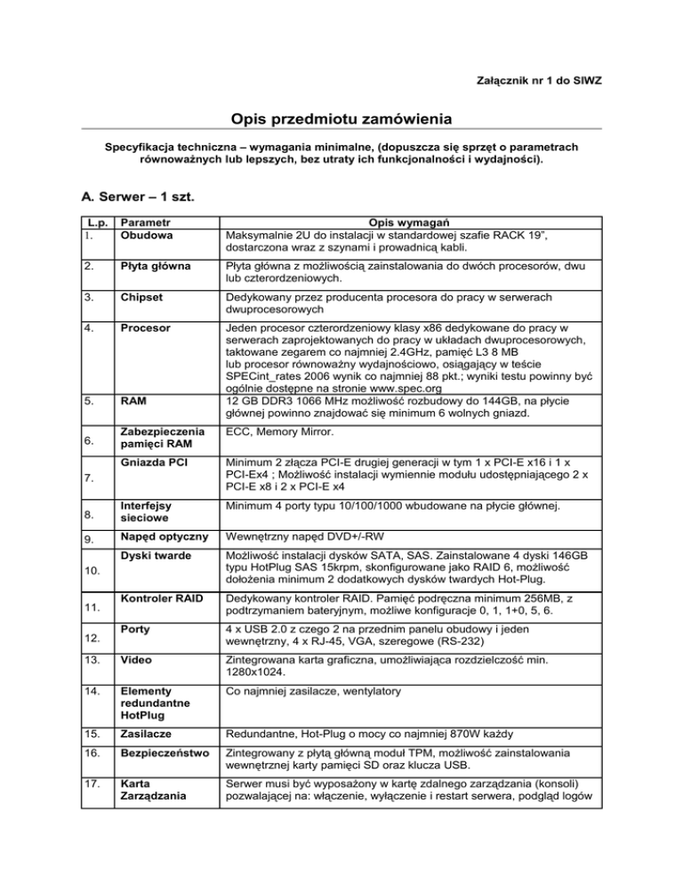 Załącznik nr 1 do SIWZ Opis przedmiotu zamówienia Specyfikacja techniczna – wymagania minimalne, (dopuszcza się sprzęt o parametrach równoważnych lub lepszych, bez utraty ich funkcjonalności i wydajności). A. Serwer – 1 szt. L.p. 1. Parametr Obudowa Opis wymagań Maksymalnie 2U do instalacji w standardowej szafie RACK 19”, dostarczona wraz z szynami i prowadnicą kabli. 2. Płyta główna Płyta główna z możliwością zainstalowania do dwóch procesorów, dwu lub czterordzeniowych. 3. Chipset Dedykowany przez producenta procesora do pracy w serwerach dwuprocesorowych 4. Procesor 5. RAM Jeden procesor czterordzeniowy klasy x86 dedykowane do pracy w serwerach zaprojektowanych do pracy w układach dwuprocesorowych, taktowane zegarem co najmniej 2.4GHz, pamięć L3 8 MB lub procesor równoważny wydajnościowo, osiągający w teście SPECint_rates 2006 wynik co najmniej 88 pkt.; wyniki testu powinny być ogólnie dostępne na stronie www.spec.org 12 GB DDR3 1066 MHz możliwość rozbudowy do 144GB, na płycie głównej powinno znajdować się minimum 6 wolnych gniazd. 6. Zabezpieczenia pamięci RAM ECC, Memory Mirror. Gniazda PCI Minimum 2 złącza PCI-E drugiej generacji w tym 1 x PCI-E x16 i 1 x PCI-Ex4 ; Możliwość instalacji wymiennie modułu udostępniającego 2 x PCI-E x8 i 2 x PCI-E x4 8. Interfejsy sieciowe Minimum 4 porty typu 10/100/1000 wbudowane na płycie głównej. 9. Napęd optyczny Wewnętrzny napęd DVD+/-RW Dyski twarde Możliwość instalacji dysków SATA, SAS. Zainstalowane 4 dyski 146GB typu HotPlug SAS 15krpm, skonfigurowane jako RAID 6, możliwość dołożenia minimum 2 dodatkowych dysków twardych Hot-Plug. Kontroler RAID Dedykowany kontroler RAID. Pamięć podręczna minimum 256MB, z podtrzymaniem bateryjnym, możliwe konfiguracje 0, 1, 1+0, 5, 6. Porty 4 x USB 2.0 z czego 2 na przednim panelu obudowy i jeden wewnętrzny, 4 x RJ-45, VGA, szeregowe (RS-232) 13. Video Zintegrowana karta graficzna, umożliwiająca rozdzielczość min. 1280x1024. 14. Elementy redundantne HotPlug Co najmniej zasilacze, wentylatory 15. Zasilacze Redundantne, Hot-Plug o mocy co najmniej 870W każdy 16. Bezpieczeństwo Zintegrowany z płytą główną moduł TPM, możliwość zainstalowania wewnętrznej karty pamięci SD oraz klucza USB. 17. Karta Zarządzania Serwer musi być wyposażony w kartę zdalnego zarządzania (konsoli) pozwalającej na: włączenie, wyłączenie i restart serwera, podgląd logów 7. 10. 11. 12. L.p. Parametr Opis wymagań sprzętowych serwera i karty, przejęcie pełnej konsoli tekstowej serwera niezależnie od jego stanu (także podczas startu, restartu OS). Możliwość przejęcia zdalnej konsoli graficznej i podłączania wirtualnych napędów CD i FDD bez konieczności dokładania dodatkowych kart sprzętowych w sloty PCI-X/PCI-Express. Rozwiązanie sprzętowe, niezależne od systemów operacyjnych, zintegrowane z płytą główną lub jako karta zainstalowana w gnieździe PCI. 18. Certyfikaty 19. Warunki gwarancji Serwer musi być wyprodukowany zgodnie z normą ISO-9001 oraz ISO14001. Certyfikat Novell „Yes, Certified” dla Suse Linux Enterprise Server Deklaracja producenta serwera potwierdzająca spełnianie przez sprzęt komputerowy norm 89/336/EEC oraz 73/23/EEC (CE) Wymagane jest dostarczenie odpowiednich certyfikatów z ofertą. Przynajmniej trzy lata gwarancji z czasem reakcji serwisu w następnym dniu roboczym z naprawą na miejscu u Klienta. Oświadczenie producenta serwera, że w przypadku nie wywiązywania się z obowiązków gwarancyjnych oferenta lub firmy serwisującej, przejmie na siebie wszelkie zobowiązania związane z serwisem – dostarczyć wraz z ofertą. B. Przełącznik ethernetowy - switch – 1 szt. L.p. 1. 2. 3. 4. 5. 6. 7. 8. 9. 10. 11. 12. 13. 14. 15. 16. 17. Parametr Porty 1000BaseT Porty 1000BaseT Ethernet fiber Porty HDMI Przepustowość / przepustowść stosu Wielkość tablicy adresów MAC Możliwość łączenia w stos Maksymalna liczba przełączników w stosie Wielkość pamięci bufora pakietów Obsługa sieci VLAN Maksymalna liczba sieci VLAN (802.1Q) statycznych/dynamicznych Funkcjonalności warstwy 2 Listy kontroli dostępu (listy ACL) bazujące na: Obsługiwane kolejki QoS (802.1p) Quality Of Service w oparciu o: Kontrola dostępu Zaawansowane funkcje zarządzania i monitorowania Zarządzanie i monitoring Opis wymagań 24 4 2 48 Gbps/ 20 Gbps 8000 Tak 6 2M B 802.1Q VLAN tagging bazujące na porcie 128 (statyczne lub dynamiczne) 802.1d (STP) 802.3ad (Link Aggregation) Kontrola sztormów broadcastowych LACP Port Mirroring Adresach MAC i IP 4 802.1p (CoS), DiffServ (DSCP), Port przełącznika Bazująca na adresie MAC RMON (4 grupy) Uwierzytelnianie RADIUS przy dostępie do konta administratora DHCP klient program zarządzający działający w środowisku Windows przez http, https, SNMPv1, SNMPv, SNTP / NTP L.p. 18. 19. 20. 21. Parametr Obudowa Zasilacz Pobór mocy / Pobór mocy z PoE Gwarancja Opis wymagań 1U, 19” wbudowany 100-240 V AC 235 / 192 W min. 3-letnia gwarancja producenta C. Pakiet biurowy – 7 szt. L.p. 1 Opis wymagań Licencja na pakiet biurowy oprogramowania; skład pakietu: 20. Microsoft Word 2007 PL lub równoważne 21. Microsoft Exel 2007 PL lub równoważny 22. Microsoft Outlook 2007 PL lub równoważne Możliwość przenoszenia pakietu pomiędzy różnymi komputerami PC, nośnik(i) do instalacji oprogramowania