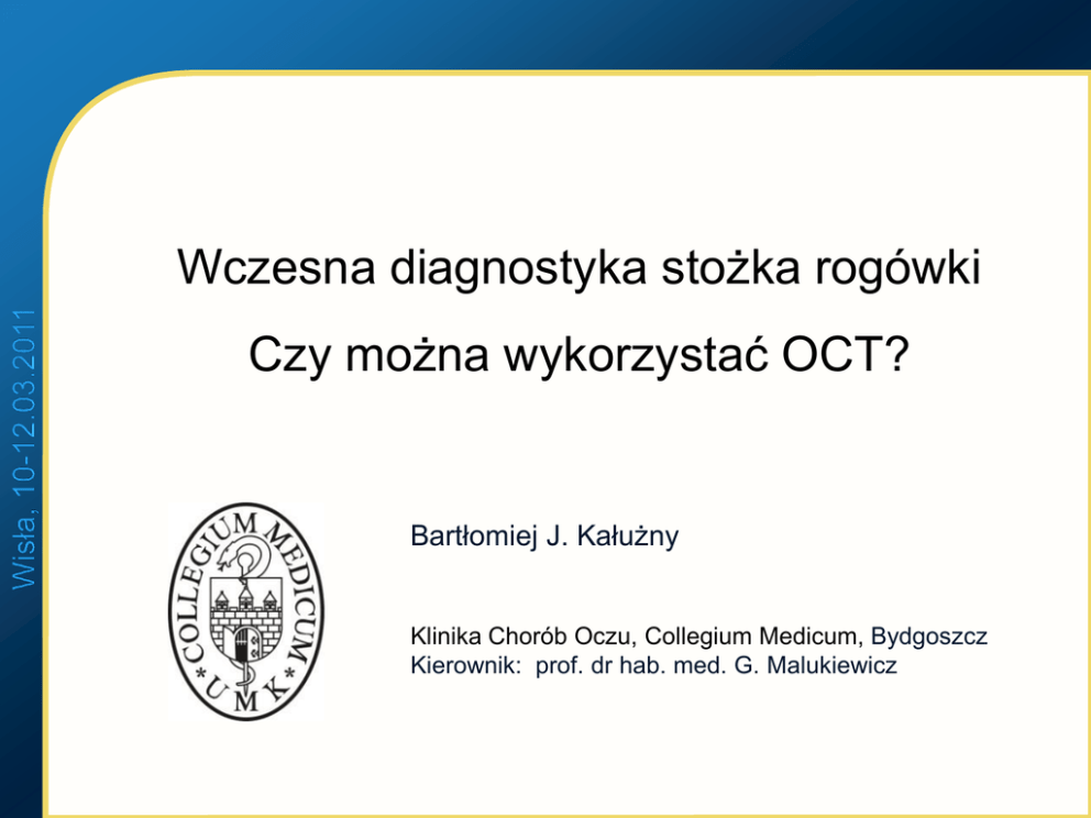 Wczesna diagnostyka stożka rogówki Czy można wykorzystać OCT? Bartłomiej J. Kałużny Klinika Chorób Oczu, Collegium Medicum, Bydgoszcz Kierownik: prof. dr hab. med. G. Malukiewicz Po co ? - prawidłowa kwalifikacja do rogówkowej chirurgii refrakcyjnej - wczesna kwalifikacja do cross-linking Keratometria pomiar centralnych krzywizn rogówki, wykorzystuje fakt, że przednia powierzchnia rogówki odbija światło jak zwierciadło wypukłe pozwala na ocenę około 6% przedniej powierzchni rogówki podejrzenie: > 45,00 D różnica > 1,00 D Topografia – w oparciu o krążki Placido koncentryczne podświetlone okręgi są rzutowane na rogówkę, następnie ich odbicia są rejestrowane za pomocą kamery, zniekształcone odbicia są analizowane komputerowo i przedstawiane w postaci map Teoretycznie do analizy może być użyte nawet 6 000 do 11 000 punktów, a dokładność tej metody w optymalnych warunkach w centralnej części wynosi ±0,25 D lub 2-3 µm, ale w klinicznych często przekracza ±1,00 D lub 8-12µm Roberts C. Corneal topography: a review of terms and concepts. J Cataract Refract Surg. 1996;22:624-9 Topografia – w oparciu o krążki Placido 1. Pozwala na ocenę tylko około 60% przedniej powierzchni, brak informacji z bardziej obwodowej części rogówki 2. Niemożliwa jest ocena tylnej powierzchni oraz grubości rogówki 3. Pomiar wymaga prawidłowego nabłonka i filmu łzowego 4. Dane z samego centrum i obwodu rogówki są ekstrapolowane Topografia – w oparciu o krążki Placido Rabinowitz - McDonnell index: K > 47,2 D I-S > 1,4 D KISA% Maeda/Klyce (KPI, KCI) Maloney CLMI Tomografia – szczelinowa skaningowa topografia o wysokiej rozdzielczości - rzeczywisty pomiar wysokości punktów w stosunku do płaszczyzny odniesienia Orbscan, Orbscan II (Bausch & Lomb) - topografia przedniej i tylnej powierzchni rogówki, mapa pachymetryczna - w stożku zmiany kształtu najpierw na tylnej powierzchni rogówki Tomografia – kamera Scheimpfluga Pentacam HR pozwala na analizę topografii przedniej i tylnej powierzchni rogówki od rąbka do rąbka w oparciu o pomiar wysokości z dokładnością od ± 0,1 D Tomografia – kamera Scheimpluga Tomografia – Placido + kamera Scheimpfluga Galilei II (Zimer Ophthalmology) Sirius (CSO, Schwind) Czułość i specyficzność > 95 % Tomografia – optyczna koherentna tomografia Przednia powierzchnia rogówki Keratometria Topografia Placido Tomografia rogówki Orbscan, Scheimpflug, OCT OP OL Aberrometria – badanie czynnościowe, ale informacje oparte na strukturze C3−1 (coma w osi pionowej) > 0,2 µm, 6 mm źrenica Mapa grubości nabłonka Cyfrowa ultrasonografia bardzo wysokiej częstotliwości (VHF DU) Corneal epithelial thickness profile in the diagnosis of keratoconus. Reinstein DZ, Archer TJ, Gobbe M. J Refract Surg. 2009;25:604-10. Badania czynnościowe – ocena biomechaniki rogówki ORA – Ocular Response Analyzer Badania czynnościowe – ocena biomechaniki rogówki Corneal Hysteresis (CH) Corneal Resistance Factor (CRF) CH: Corneal Hysteresis = P1- P2 CRF: Corneal Resistance Factor = P1 – (0.70*P2) - lepiej charakteryzuje właściwości biomechaniczne rogówki - czułość i specyficzność poniżej 80 % Ocular response analyzer measurements in keratoconus with normal central corneal thickness compared with matched normal control eyes. Fontes BM, Ambrósio R Jr, Velarde GC, Nosé W. Refract Surg. 2011;27:209-15 - brak różnic w CH i CRF przed i po CXL ? under p2area Detection of Biomechanical Changes After Corneal Cross-Linking Using Ocular Response Analyzer Software. Spoerl E, Terai N, Scholz F, Raiskup F, Pillunat LE. J Refract Surg. 2011;17:1-6 Badania czynnościowe – biomechanika rogówki, OCT 20 ms Prototyp SS OCT skonstruowany w Instytucie Fizyki UMK w Toruniu Rozdzielczość osiowa: 9 µm Rozdzielczość poprzeczna: 5 µm Szybkość skanowania: do 200 000 lines/s Czułość: 103 dB Źródło światła: laser strojony o centralnej długości światła 1310 nm i zakresie strojenia135 nm Badania czynnościowe – biomechanika rogówki, OCT Badania czynnościowe – biomechanika rogówki, OCT ex vivo Badania czynnościowe – biomechanika rogówki, OCT Badania czynnościowe – biomechanika rogówki, OCT Ciśnienie wewnątrzgałkowe Patologia Niebieska krzywa 8 zdrowa Czerwona krzywa 8 keratoconus Badania genetyczne w większości przypadków występowanie sporadyczne u 5% to 19% występowanie rodzinne podłoże genetyczne nie jest ustalone Przednia powierzchnia rogówki Keratometria Topografia Placido Tomografia rogówki Orbscan, Scheimpflug, OCT Aberrometria Shack-Hartmann Tscheringa Mapa nabłonka VHF DU OCT Biomechanika ORA OCT Genetyka Dziękuję za uwagę