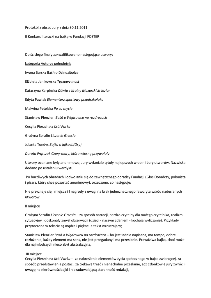 Protokół z obrad Jury z dnia 30.11.2011 II Konkurs literacki na bajkę w Fundacji FOSTER Do ścisłego finały zakwalifikowano następujące utwory: kategoria Autorzy pełnoletni: Iwona Barska Baśń o Dzindzibołce Elżbieta Janikowska Tęczowy most Katarzyna Karpińska Oliwia z Krainy Mazurskich Jezior Edyta Pawlak Elementarz sportowy przedszkolaka Malwina Petelska Po co mycie Stanisław Plenzler Baśń o Wędrowcu na rozdrożach Cecylia Pierzchała Król Parku Grażyna Serafin Liczenie Grzesia Jolanta Tondys Bajka o jajkach(Osy) Dorota Frątczak Czary-mary, które wiosnę przywołały Utwory oceniane były anonimowo, Jury wyłaniało tytuły najlepszych w opinii Jury utworów. Nazwiska dodano po ustaleniu werdyktu. Po burzliwych obradach i odwołaniu się do zewnętrznego doradcy Fundacji (Głos Doradczy, polonista i pisarz, który chce pozostać anonimowy), orzeczono, co następuje: Nie przyznaje się I miejsca i I nagrody z uwagi na brak jednoznacznego faworyta wśród nadesłanych utworów. II miejsce Grażyna Serafin Liczenie Grzesia – za sposób narracji, bardzo czytelny dla małego czytelnika, realizm sytuacyjny i doskonały zmysł obserwacji (dzieci - naszym zdaniem - kochają wyliczanie). Przykłady przytoczone w tekście są mądre i piękne, a tekst wzruszający; Stanisław Plenzler Baśń o Wędrowcu na rozdrożach – bo jest ładnie napisana, ma tempo, dobre rozłożenie, każdy element ma sens, nie jest przegadany i ma przesłanie. Prawdziwa bajka, choć może dla najmłodszych nieco zbyt abstrakcyjna, III miejsce Cecylia Pierzchała Król Parku – za nakreślenie elementów życia społecznego w bajce zwierzęcej, za sposób przedstawienia postaci, za ciekawą treść i nienachalne przesłanie, acz członkowie jury zwrócili uwagę na nierówność bajki i niezadowalającą staranność redakcji, Jolanta Tondys Bajka o jajkach(Osy) – za sprawność w rymowaniu i jednocześnie edukacyjną oraz bardzo poznawczą treść. Wyróżnienia Elżbieta Janikowska Tęczowy most – za walory literackie, acz nie wszyscy członkowie jury przyjęli z aprobatą utrwalanie stereotypów, niekoniecznie zresztą zamierzone. Podział na Pracowite Elfy i Artystyczne Elfy nie wszystkim przypadł do gustu, bo nie jest to podział rozłączny: artyści też wykonują pracę, Katarzyna Karpińska Oliwia z Krainy Mazurskich Jezior – za bezpretensjonalność i zmysł obserwacji oraz wrażenie, że historia rozwija się naturalnie. Lekkość stylu, swoboda wyrażania myśli zasługuje na wyróżnienie. Kategoria Autorzy niepełnoletni I miejsce Agata Słomska Wyspa na opak – za pomysł i jego realizację, sprawne pióro i edukacyjną treść, II miejsce Anna Starczewska Czerwony Płaszczyk – za współczesną wersję Czerwonego Kapturka, w sam raz dla odbiorcy nastoletniego, ale najmłodsi dojrzewają teraz szybciej. Pouczające! III miejsca nie przyznano Wyróżnienia Antonina Mańkowska, Michał Szymański Encyklopedia Podróżnika – za bogactwo języka, twórczą wyobraźnię i zabawny pomysł, choć absolutnie utwór nie mieści się w przewodnim „objaśnianiu świata”, chyba, że świata nie stąd, tylko z wyobraźni. Protokół sporządziła Anna Gołębiowska Główny skład Jury: Lucyna Sawa Koziołowska Anna Pietrzak Głos Doradczy Fundacji Skład Jury pomocniczego pozostaje znany Fundacji Utwory Autorów Niepełnoletnich oceniali przedstawiciele i pracownicy Fundacji