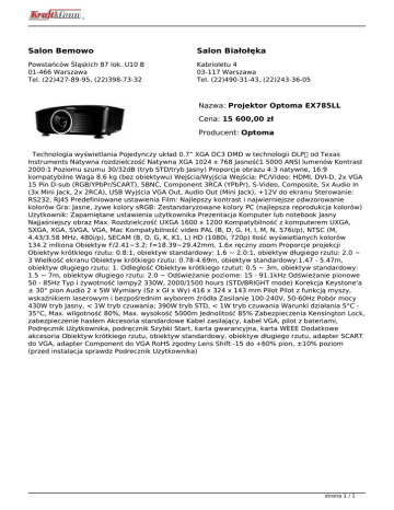 Salon Bemowo Salon Białołęka Powstańców Śląskich 87 lok. U10 B 01-466 Warszawa Tel. (22)427-89-95, (22)398-73-32 Kabrioletu 4 03-117 Warszawa Tel. (22)490-31-43, (22)243-36-05 Nazwa: Projektor Optoma EX785LL Cena: 15 600,00 zł Producent: Optoma Technologia wyświetlania Pojedynczy układ 0.7” XGA DC3 DMD w technologii DLP od Texas Instruments Natywna rozdzielczość Natywna XGA 1024 x 768 Jasność1 5000 ANSI lumenów Kontrast 2000:1 Poziomu szumu 30/32dB (tryb STD/tryb Jasny) Proporcje obrazu 4:3 natywne, 16:9 kompatybilne Waga 8.6 kg (bez obiektywu) Wejścia/Wyjścia Wejścia: PC/Video: HDMI, DVI-D, 2x VGA 15 Pin D-sub (RGB/YPbPr/SCART), 5BNC, Component 3RCA (YPbPr), S-Video, Composite, 5x Audio In (3x Mini Jack, 2x 2RCA), USB Wyjścia VGA Out, Audio Out (Mini Jack), +12V do ekranu Sterowanie: RS232, RJ45 Predefiniowane ustawienia Film: Najlepszy kontrast i najwierniejsze odwzorowanie kolorów Gra: Jasne, żywe kolory sRGB: Zestandaryzowane kolory PC (najlepsza reprodukcja kolorów) Użytkownik: Zapamiętane ustawienia użytkownika Prezentacja Komputer lub notebook Jasny Najjaśniejszy obraz Max. Rozdzielczość UXGA 1600 x 1200 Kompatybilność z komputerem UXGA, SXGA, XGA, SVGA, VGA, Mac Kompatybilność video PAL (B, D, G, H, I, M, N, 576i/p), NTSC (M, 4.43/3.58 MHz, 480i/p), SECAM (B, D, G, K, K1, L) HD (1080i, 720p) Ilość wyświetlanych kolorów 134.2 mlliona Obiektyw F/2.41~3.2; f=18.39~29.42mm, 1.6x ręczny zoom Proporcje projekcji Obiektyw krótkiego rzutu: 0.8:1, obiektyw standardowy: 1.6 ~ 2.0:1, obiektyw długiego rzutu: 2.0 ~ 3 Wielkość ekranu Obiektyw krótkiego rzutu: 0.78-4.69m, obiektyw standardowy:1.47 - 5.47m, obiektyw długiego rzutu: 1. Odległość Obiektyw krótkiego rzutut: 0.5 ~ 3m, obiektyw standardowy: 1.5 ~ 7m, obiektyw długiego rzutu: 2.0 ~ Odświeżanie poziome: 15 - 91.1kHz Odświeżanie pionowe 50 - 85Hz Typ i żywotność lampy2 330W, 2000/1500 hours (STD/BRIGHT mode) Korekcja Keystone'a ± 30° pion Audio 2 x 5W Wymiary (Sz x Gł x Wy) 416 x 324 x 143 mm Pilot Pilot z funkcją myszy, wskaźnikiem laserowym i bezpośrednim wyborem źródła Zasilanie 100-240V, 50-60Hz Pobór mocy 430W tryb Jasny, < 1W tryb czuwania; 390W tryb STD, < 1W tryb czuwania Warunki działania 5°C 35°C, Max. wilgotność 80%, Max. wysokość 5000m Jednolitość 85% Zabezpieczenia Kensington Lock, zabezpieczenie hasłem Akcesoria standardowe Kabel zasilający, kabel VGA, pilot z bateriami, Podręcznik Użytkownika, podręcznik Szybki Start, karta gwarancyjna, karta WEEE Dodatkowe akcesoria Obiektyw krótkiego rzutu, obiektyw standardowy, obiektyw długiego rzutu, adapter SCART do VGA, adapter Component do VGA RoHS zgodny Lens Shift -15 do +60% pion, ±10% poziom (przed instalacja sprawdz Podrecznik Uzytkownika) strona 1 / 1 Powered by TCPDF (www.tcpdf.org)