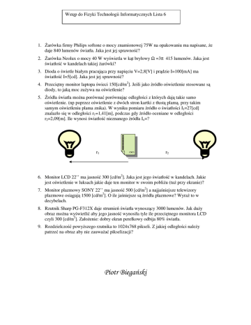 Wstęp do Fizyki Technologii Informatycznych Lista 6 1. Żarówka firmy Philips softone o mocy znamionowej 75W na opakowaniu ma napisane, że daje 840 lumenów światła. Jaka jest jej sprawność? 2. Żarówka Neolux o mocy 40 W wyświetla w kąt bryłowy Ω =3π 415 lumenów. Jaka jest światłość w kandelach takiej żarówki? 3. Dioda o świetle białym pracująca przy napięciu V=2,8[V] i prądzie I=100[mA] ma światłość I=5[cd]. Jaka jest jej sprawność? 4. Przeciętny monitor laptopa świeci 150[cd/m2]. Jeśli jako źródło oświetlenie stosowane są diody, to jaką moc zużywa na oświetlenie? 5. Źródła światła można porównać porównując odległości z których dają takie samo oświetlenie. (np poprzez oświetlenie z dwóch stron kartki z tłustą plamą. przy takim samym oświetleniu plama znika). W wyniku pomiaru źródło o światłości I1=27[cd] znalazło się w odległości r1=1,41[m], podczas gdy źródło oceniane w odległości r2=2,09[m]. Ile wynosi światłość nieznanego źródła Ix=? r1 r2 6. Monitor LCD 22’’ ma jasność 300 [cd/m2]. Jaka jest jego światłość w kandelach. Jakie jest oświetlenie w luksach jakie daje ten monitor w swoim pobliżu (tuż przy ekranie)? 7. Monitor plazmowy SONY 22’’ ma jasność 500 [cd/m2] a najjaśniejsze telewizory plazmowe osiągają 1500 [cd/m2]. O ile jaśniejsze są źródła plazmowe? Wyraź to w decybelach. 8. Rzutnik Sharp PG-F312X daje strumień światła wynoszący 3000 lumenów. Jak duży obraz można wyświetlić aby jego jasność wynosiła tyle ile przeciętnego monitora LCD czyli 300 [cd/m2]. Założenie: dobry ekran perełkowy odbija 80% światła. 9. Rozdzielczość powyższego rzutnika to 1024x768 pikseli. Z jakiej odległości należy patrzeć na obraz aby nie zauważać pikselizacji? Piotr Biegański