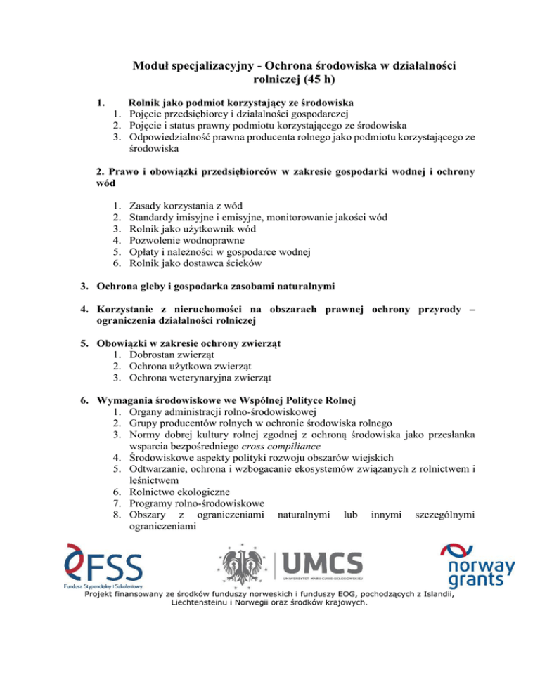 Moduł specjalizacyjny - Ochrona środowiska w działalności rolniczej (45 h) 1. Rolnik jako podmiot korzystający ze środowiska 1. Pojęcie przedsiębiorcy i działalności gospodarczej 2. Pojęcie i status prawny podmiotu korzystającego ze środowiska 3. Odpowiedzialność prawna producenta rolnego jako podmiotu korzystającego ze środowiska 2. Prawo i obowiązki przedsiębiorców w zakresie gospodarki wodnej i ochrony wód 1. 2. 3. 4. 5. 6. Zasady korzystania z wód Standardy imisyjne i emisyjne, monitorowanie jakości wód Rolnik jako użytkownik wód Pozwolenie wodnoprawne Opłaty i należności w gospodarce wodnej Rolnik jako dostawca ścieków 3. Ochrona gleby i gospodarka zasobami naturalnymi 4. Korzystanie z nieruchomości na obszarach prawnej ochrony przyrody – ograniczenia działalności rolniczej 5. Obowiązki w zakresie ochrony zwierząt 1. Dobrostan zwierząt 2. Ochrona użytkowa zwierząt 3. Ochrona weterynaryjna zwierząt 6. Wymagania środowiskowe we Wspólnej Polityce Rolnej 1. Organy administracji rolno-środowiskowej 2. Grupy producentów rolnych w ochronie środowiska rolnego 3. Normy dobrej kultury rolnej zgodnej z ochroną środowiska jako przesłanka wsparcia bezpośredniego cross compiliance 4. Środowiskowe aspekty polityki rozwoju obszarów wiejskich 5. Odtwarzanie, ochrona i wzbogacanie ekosystemów związanych z rolnictwem i leśnictwem 6. Rolnictwo ekologiczne 7. Programy rolno-środowiskowe 8. Obszary z ograniczeniami naturalnymi lub innymi szczególnymi ograniczeniami Projekt finansowany ze środków funduszy norweskich i funduszy EOG, pochodzących z Islandii, Liechtensteinu i Norwegii oraz środków krajowych. 7. Ochrona bioróżnorodności 8. Zrównoważony rozwój rolnictwa i obszarów wiejskich 9. Użytkowa ochrona różnorodności biologicznej w rybołówstwie i rybactwie 1. Ochrona różnorodności biologicznej w zakresie żywych zasobów morza 2. Ochrona różnorodności w gospodarce rybackiej 3. Gospodarka rybacka na obszarach chronionych 10. Ochrona i gospodarka leśna 1. Użytkowa ochrona różnorodności biologicznej w lasach 2. Zrównoważona gospodarka leśna 3. Ochrona lasów 4. Powiększanie zasobów leśnych 5. Ochrona różnorodności biologicznej w gospodarce łowieckiej 6. Zasady wykonywania polowania 11. Obszary o wysokich wartościach przyrodniczych (HNV) i ich znaczenie w ochronie różnorodności biologicznej na obszarach wiejskich 1. Pojęcie i geneza wyznaczenia obszarów o wysokiej wartości przyrodniczej 2. Obszary o wysokich wartościach przyrodniczych a obszary cenne pod względem przyrodniczym w ustawie o ochronie przyrody 3. Wyznaczenie obszarów o wysokich walorach przyrodniczych HNV 4. Wsparcie dla rolnictwa prowadzonego na obszarach HNV Projekt finansowany ze środków funduszy norweskich i funduszy EOG, pochodzących z Islandii, Liechtensteinu i Norwegii oraz środków krajowych.