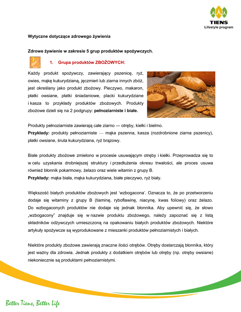Wytyczne dotyczące zdrowego żywienia Zdrowe żywienie w zakresie 5 grup produktów spożywczych. 1. Grupa produktów ZBOŻOWYCH: Każdy produkt spożywczy, zawierający pszenicę, ryż, owies, mąkę kukurydzianą, jęczmień lub ziarna innych zbóż, jest określany jako produkt zbożowy. Pieczywo, makaron, płatki owsiane, płatki śniadaniowe, placki kukurydziane i kasza to przykłady produktów zbożowych. Produkty zbożowe dzieli się na 2 podgrupy: pełnoziarniste i białe. Produkty pełnoziarniste zawierają całe ziarno ― otręby, kiełki i bielmo. Przykłady: produkty pełnoziarniste — mąka pszenna, kasza (rozdrobnione ziarna pszenicy), płatki owsiane, śruta kukurydziana, ryż brązowy. Białe produkty zbożowe zmielono w procesie usuwającym otręby i kiełki. Przeprowadza się to w celu uzyskania drobniejszej struktury i przedłużenia okresu trwałości, ale proces usuwa również błonnik pokarmowy, żelazo oraz wiele witamin z grupy B. Przykłady: mąka biała, mąka kukurydziana, białe pieczywo, ryż biały. Większość białych produktów zbożowych jest ‘wzbogacona’. Oznacza to, że po przetworzeniu dodaje się witaminy z grupy B (tiaminę, ryboflawinę, niacynę, kwas foliowy) oraz żelazo. Do wzbogaconych produktów nie dodaje się jednak błonnika. Aby upewnić się, że słowo „wzbogacony” znajduje się w nazwie produktu zbożowego, należy zapoznać się z listą składników odżywczych umieszczoną na opakowaniu białych produktów zbożowych. Niektóre artykuły spożywcze są wyprodukowane z mieszanki produktów pełnoziarnistych i białych. Niektóre produkty zbożowe zawierają znaczne ilości otrębów. Otręby dostarczają błonnika, który jest ważny dla zdrowia. Jednak produkty z dodatkiem otrębów lub otręby (np. otręby owsiane) niekoniecznie są produktami pełnoziarnistymi. TIENS Europe Region: TLP flyer WSKAZÓWKA: Co najmniej połowę produktów zbożowych powinny stanowić produkty pełnoziarniste. Wskazówki pomagające spożywać produkty pełnoziarniste: Aby spożywać więcej produktów pełnoziarnistych, należy zastępować białe produkty zbożowe produktami pełnoziarnistymi, czyli przykładowo spożywać pieczywo pełnoziarniste zamiast białego lub ryż brązowy zamiast ryżu białego. Ważne jest całościowe zastępowanie białych produktów zbożowych pełnoziarnistymi, a nie dodawanie produktów pełnoziarnistych. Dla odmiany trzeba spożywać ryż brązowy lub makaron pełnoziarnisty. Można urozmaicić codzienne menu i przygotować nadzienie z ryżu brązowego, które zapiekamy w zielonej papryce albo w pomidorach, lub z pełnoziarnistego makaronu przyrządzić makaron z serem. Można poeksperymentować, dodając połowę pełnoziarnistej mąki pszennej lub owsianej podczas przygotowywania naleśników, gofrów, babeczek lub innych potraw mącznych. Mogą wymagać dodania niewielkiej ilości zakwasu. Mąkę pełnoziarnistą lub płatki owsiane można dodać do pieczenia ciastek lub innych wypieków. Prażona kukurydza przygotowana z całych ziaren może stanowić zdrową przekąskę, jeżeli zawiera niewielką ilość lub nie zawiera w ogóle soli i masła. Pozwólmy dzieciom wybrać pełnoziarniste dodatki, a następnie pomóc w ich przygotowaniu. Nauczmy starsze dzieci czytać listę składników na opakowaniach produktów zbożowych oraz przekąsek i zwracajmy uwagę, aby wybierały te, które posiadają składniki pełnoziarniste. TIENS Europe Region: TLP flyer 2. Grupa WARZYW: Każde warzywo lub 100% sok warzywny należą do grupy warzyw. Warzywa mogą być surowe lub gotowane, świeże, zamrożone, puszkowane lub suszone/odwodnione i mogą być całe, pocięte lub w postaci puree. Na podstawie zawartości składników odżywczych warzywa zostały podzielone na 5 podgrup. Do często spożywanych warzyw z każdej podgrupy należą: Warzywa zielone: brokuły, szpinak, jarmuż, kapusta warzywna pastewna, kapusta pekińska, sałata rzymska Warzywa czerwone i pomarańczowe: marchew, słodkie ziemniaki, pomidory, sok pomidorowy, papryka czerwona, dynia Warzywa bogate w skrobię: kukurydza, ziemniaki, banan Pozostałe warzywa: karczochy, szparagi, awokado, ogórek, bakłażan, cebula, cukinia Warzywa strączkowe: soja, fasola zwykła, fasola różowa plamista, groszek, fasola biała WSKAZÓWKA: Połowę posiłku powinny stanowić owoce i warzywa. Wskazówki pomagające spożywać warzywa: Należy kupować świeże warzywa sezonowe. Kosztują mniej i prawdopodobnie będą miały najlepszy smak. TIENS Europe Region: TLP flyer Przy wyborze warzyw zwróćmy uwagę na to, czy można przyrządzić z nich szybki posiłek. Istotne jest, aby warzywa liściaste były zapakowane, tj. w torebkach. Jeśli chcemy przyrządzić sałatkę w kilka minut, wystarczy do warzyw liściastych dodać małe marchewki lub pomidory koktajlowe. Na przekąski warto wybierać zapakowane w torebkach małe marchewki lub seler naciowy. Należy częściej sięgać po warzywa z większą zawartością potasu, czyli po słodkie ziemniaki, białe ziemniaki, białą fasolę, przetwory pomidorowe (pasty, sosy i soki), liście buraków, soję, szpinak, soczewicę i fasolę czerwoną. Aby zmniejszyć spożycie sodu, należy przygotowywać posiłki ze świeżych składników. Większość sodu z produktów spożywczych pochodzi z pakowanej lub przetwarzanej żywności. Należy zaplanować posiłek składający się główne z warzyw, na przykład warzywa na patelnię lub zupę. Takie dania można uzupełnić innymi produktami spożywczymi. Codziennie wieczorem należy spożywać zieloną sałatę. W czasie lunchu należy spożywać sałatkę jako danie główne. Do sałatki można dodać lekki sos. Dania z grilla powinno się uzupełniać warzywami. Odpowiednie są pomidory, grzyby, zielona papryka i cebula. Wiele warzyw smakuje lepiej w połączeniu z gęstym sosem do maczania lub z sosem sałatkowym. Sos sałatkowy o niskiej zawartości tłuszczu należ
