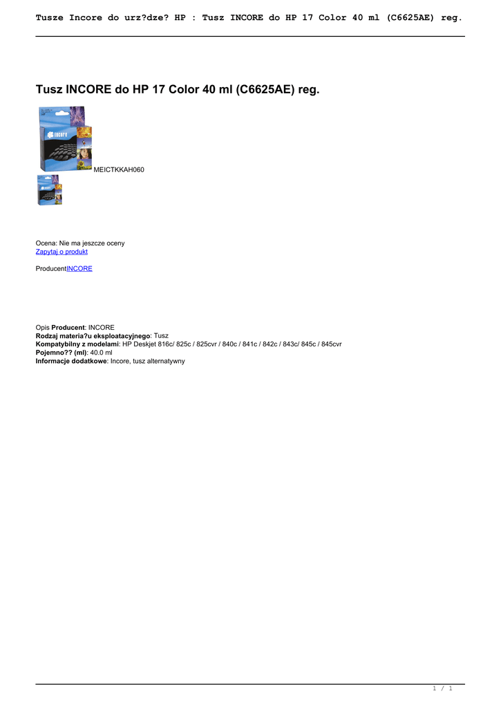 Tusze Incore do urz?dze? HP : Tusz INCORE do HP 17 Color 40 ml (C6625AE) reg. Tusz INCORE do HP 17 Color 40 ml (C6625AE) reg. MEICTKKAH060 Ocena: Nie ma jeszcze oceny Zapytaj o produkt ProducentINCORE Opis Producent: INCORE Rodzaj materia?u eksploatacyjnego: Tusz Kompatybilny z modelami: HP Deskjet 816c/ 825c / 825cvr / 840c / 841c / 842c / 843c/ 845c / 845cvr Pojemno?? (ml): 40.0 ml Informacje dodatkowe: Incore, tusz alternatywny 1 / 1 Powered by TCPDF (www.tcpdf.org)