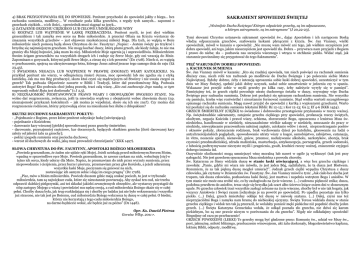 4) BRAK PRZYGOTOWANIA SIĘ DO SPOWIEDZI. Penitent przychodzi do spowiedzi jakby z biegu… bez rachunku sumienia, modlitwy… W rezultacie poda kilka grzechów, z reguły tych samych… zapomni o grzechach ciężkich… o ich ilości… spowiednik musi ciągnąć za język… 5) ZATAJENIE GRZECHU CIĘŻKIEGO LUB CELOWE UMNIEJSZANIE WINY 6) ROZPACZ LUB WĄTPIENIE W ŁASKĘ PRZEBACZENIA. Penitent myśli, że jest zbyt wielkim grzesznikiem i tak zamyka swe serce na Boże miłosierdzie. A przecież Ofiara na Krzyżu wystarczy do zmazania wszystkich grzechów – jest objawem nieskończonej miłości Boga. Dla tych, co wątpią w Boże miłosierdzie niech pomocą będą słowa Chrystusa do św. Faustyny: „Napisz: - Jestem święty po trzykroć i brzydzę się najmniejszym grzechem. Nie mogę kochać duszy, którą plami grzech, ale kiedy żałuje, to nie ma granicy dla Mojej hojności, jaką mam ku niej. Miłosierdzie Moje ogarnia ją i usprawiedliwia. Miłosierdziem Swoim ścigam grzeszników na wszystkich drogach ich i raduje się Serce Moje, gdy oni wracają do Mnie. Zapominam o goryczach, którymi poili Serce Moje, a cieszę się z ich powrotu” (Dz 1728). Niech ci, co wątpią w przebaczenie, spojrzą na ukrzyżowanego łotra, którego Jezus zabrał jeszcze tego samego dnia do raju (Łk 23,43). 7) ŚWIADOMA NEGACJA LUB WĄTPIENIE W PRAWDĘ (DOGMAT) WIARY KATOLICKIEJ. Na przykład penitent nie wierzy, w odkupieńczą śmierć Jezusa, moc spowiedzi lub nie zgadza się z etyką katolicką. Jak ma mu Bóg przebaczyć, skoro ktoś czyni się mądrzejszym od Stwórcy i nie uważa czegoś za grzech? Tak podważa Objawienie zawarte w Biblii i Tradycji, które dał prawdomówny Bóg. Podważa autorytet Boga! Kto podważa choć jedną prawdę, traci całą wiarę. „Kto zaś zachowuje Jego naukę, w tym naprawdę miłość Boża jest doskonała” (1 J 2,5). 8) NIEZNAJOMOŚĆ PODSTAWOWYCH PRAWD WIARY I OBOWIĄZKÓW SWOJEGO STANU. Nie wolno dać rozgrzeszenia, zwłaszcza, jeśli ta niewiedza wypływa z obojętności wobec zbawienia duszy (np. nieznajomość przykazań kościelnych – jak można je wypełniać, skoro się ich nie zna?). Czy można dać rozgrzeszenie rodzicom, którzy przyzwalają córce na mieszkanie bez ślubu z chłopakiem? SKUTKI DUCHOWE SAKRAMENTU POKUTY: - „Pojednanie z Bogiem, przez które penitent odzyskuje łaskę [uświęcającą]; - pojednanie z Kościołem; - darowanie kary wiecznej [piekło] spowodowanej przez grzechy śmiertelne; - darowanie, przynajmniej częściowe, kar doczesnych, będących skutkiem grzechu [ilość darowanej kary zależy od jakości żalu za grzechy]; - pokój i pogoda sumienia oraz pociecha duchowa; - wzrost sił duchowych do walki, jaką musi prowadzić chrześcijanin” (KKK 1497). SŁOWA CHRYSTUSA DO ŚW. FAUSTYNY, APOSTOŁKI BOŻEGO MIŁOSIERDZIA „Powiedz grzesznikom, że żaden nie ujdzie ręki Mojej. Jeżeli uciekają przed miłosiernym Sercem Moim, wpadną w sprawiedliwe ręce Moje. Powiedz grzesznikom, że zawsze czekam na nich, wsłuchuję [się] w tętno ich serca, kiedy uderzy dla Mnie. Napisz, że przemawiam do nich przez wyrzuty sumienia, przez niepowodzenie i cierpienia, przez burze i pioruny, przemawiam przez głos Kościoła, a jeżeli udaremnią wszystkie łaski Moje, poczynam się gniewać na nich, zostawiając ich samym sobie i daję im czego pragną” (Dz 1728). „Pisz, mów o Moim miłosierdziu. Powiedz duszom gdzie mają szukać pociech, to jest w trybunale miłosierdzia, tam są największe cuda, które się nieustannie powtarzają. Aby zyskać ten cud, nie trzeba odprawić dalekiej pielgrzymki, ani też składać jakichś zewnętrznych obrzędów, ale wystarczy przystąpić do stóp zastępcy Mojego z wiarą i powiedzieć mu nędzę swoją, a cud miłosierdzia Bożego okaże się w całej pełni. Choćby dusza była, jak trup rozkładająca się i choćby po ludzku już nie było wskrzeszenia i wszystko już stracone, nie tak jest po Bożemu, cud miłosierdzia Bożego wskrzesza tę duszę w całej pełni. O biedni, którzy nie korzystają z tego cudu miłosierdzia Bożego, na darmo będziecie wołać, ale będzie już za późno” (Dz 1448). Opr. Ks. Dawid Pietras Gorzów Wlkp. 2011 r. SAKRAMENT SPOWIEDZI ŚWIĘTEJ „Weźmijcie Ducha Świętego! Którym odpuścicie grzechy, są im odpuszczone, a którym zatrzymacie, są im zatrzymane” (J 20,22-23). Tymi słowami Chrystus ustanawia sakrament spowiedzi św., dając Apostołom i ich następcom Boską władzę odpuszczania grzechów, szafowania łaskami płynącymi z krzyża. Św. Jan Vianney, wielki spowiednik, mówił w kazaniu o spowiedzi: „Nie muszę wam mówić ani tego, jak wielkim szczęściem jest dobra spowiedź, ani tego, jakim nieszczęściem jest spowiedź zła. Dobra – przywraca nam przyjaźń z Bogiem i prawo do nieba; zła – pozbawia nas szczęścia wiecznego i wtrąca w otchłanie piekła. Widać stąd, jak starannie powinniśmy się przygotować do tego Sakramentu”. PIĘĆ WARUNKÓW DOBREJ SPOWIEDZI: 1. RACHUNEK SUMIENIA Św. Jan Vianney mówił w kazaniu: „Kto się rzadziej spowiada, ten niech poświęci na rachunek sumienia dłuższy czas, niech robi ten rachunek po modlitwie do Ducha Świętego i po poleceniu siebie Matce Najświętszej. Byłoby dobrze, żeby z intencją uproszenia sobie łaski dobrej spowiedzi, uczestniczyć w tym dniu we Mszy Świętej, spełnić jakiś dobry uczynek, zadać sobie umartwienie w jedzeniu czy w spaniu. Wskazane jest przejść sobie w myśli grzechy po kilka razy, żeby należycie wyryły się w pamięci”. Pamiętajmy też, że grzech ciężki powoduje utratę duchowego światła w duszy, wzywajmy więc Ducha Świętego przy rachunku sumienia. Dobrze jest posłużyć się spisanym rachunkiem sumienia. Nie wszystko się pamięta, trzeba więc rozświetlać i nieustannie formować sumienie. Stąd wielka wartość szczegółowego spisanego rachunku sumienia. Mogę nawet przyjść do spowiedzi z kartką