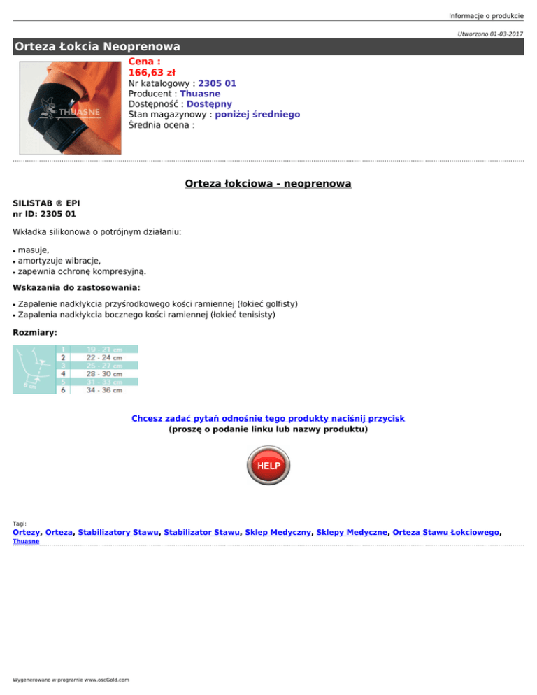 Informacje o produkcie Utworzono 01-03-2017 Orteza Łokcia Neoprenowa Cena : 166,63 zł Nr katalogowy : 2305 01 Producent : Thuasne Dostępność : Dostępny Stan magazynowy : poniżej średniego Średnia ocena : Orteza łokciowa - neoprenowa SILISTAB ® EPI nr ID: 2305 01 Wkładka silikonowa o potrójnym działaniu: ● ● ● masuje, amortyzuje wibracje, zapewnia ochronę kompresyjną. Wskazania do zastosowania: ● ● Zapalenie nadkłykcia przyśrodkowego kości ramiennej (łokieć golfisty) Zapalenia nadkłykcia bocznego kości ramiennej (łokieć tenisisty) Rozmiary: Chcesz zadać pytań odnośnie tego produkty naciśnij przycisk (proszę o podanie linku lub nazwy produktu) Tagi: Ortezy, Orteza, Stabilizatory Stawu, Stabilizator Stawu, Sklep Medyczny, Sklepy Medyczne, Orteza Stawu Łokciowego, Thuasne Wygenerowano w programie www.oscGold.com