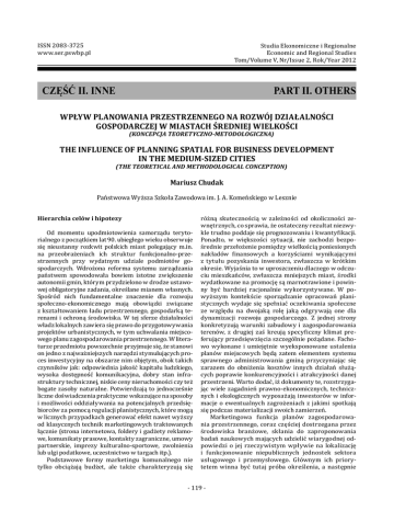ISSN 2083-3725 www.ser.pswbp.pl Studia Ekonomiczne i Regionalne Economic and Regional Studies Tom/Volume V, Nr/Issue 2, Rok/Year 2012 CZĘŚĆ II. INNE PART II. OTHERS WPŁYW PLANOWANIA PRZESTRZENNEGO NA ROZWÓJ DZIAŁALNOŚCI GOSPODARCZEJ W MIASTACH ŚREDNIEJ WIELKOŚCI (KONCEPCJA TEORETYCZNO-METODOLOGICZNA) THE INFLUENCE OF PLANNING SPATIAL FOR BUSINESS DEVELOPMENT IN THE MEDIUM-SIZED CITIES (THE TEORETICAL AND METHODOLOGICAL CONCEPTION) Mariusz Chudak Państwowa Wyższa Szkoła Zawodowa im. J. A. Komeńskiego w Lesznie Hierarchia celów i hipotezy Od momentu upodmiotowienia samorządu terytorialnego z początkiem lat 90. ubiegłego wieku obserwuje się nieustanny rozkwit polskich miast polegający m.in. na przeobrażeniach ich struktur funkcjonalno-przestrzennych przy wydatnym udziale podmiotów gospodarczych. Wdrożona reforma systemu zarządzania państwem spowodowała bowiem istotne zwiększenie autonomii gmin, którym przydzielono w drodze ustawowej obligatoryjne zadania, określane mianem własnych. Spośród nich fundamentalne znaczenie dla rozwoju społeczno-ekonomicznego mają obowiązki związane z kształtowaniem ładu przestrzennego, gospodarką terenami i ochroną środowiska. W tej sferze działalności władz lokalnych zawiera się prawo do przygotowywania projektów urbanistycznych, w tym uchwalania miejscowego planu zagospodarowania przestrzennego. W literaturze przedmiotu powszechnie przyjmuje się, że stanowi on jedno z najważniejszych narzędzi stymulujących proces inwestycyjny na obszarze nim objętym, obok takich czynników jak: odpowiednia jakość kapitału ludzkiego, wysoka dostępność komunikacyjna, dobry stan infrastruktury technicznej, niskie ceny nieruchomości czy też bogate zasoby naturalne. Potwierdzają to jednocześnie liczne doświadczenia praktyczne wskazujące na sposoby i możliwości oddziaływania na potencjalnych przedsiębiorców za pomocą regulacji planistycznych, które mogą w licznych przypadkach generować efekt nawet wyższy od klasycznych technik marketingowych traktowanych łącznie (strona internetowa, foldery i gadżety reklamowe, komunikaty prasowe, kontakty zagraniczne, umowy partnerskie, imprezy kulturalno-sportowe, zwolnienia lub ulgi podatkowe, uczestnictwo w targach itp.). Podstawowe formy marketingu komunalnego nie tylko obciążają budżet, ale także charakteryzują się różną skutecznością w zależności od okoliczności zewnętrznych, co sprawia, że ostateczny rezultat niezwykle trudno poddaje się prognozowaniu i kwanty ikacji. Ponadto, w większości sytuacji, nie zachodzi bezpośrednie przełożenie pomiędzy wielkością poniesionych nakładów inansowych a korzyściami wynikającymi z tytułu pozyskania inwestora, zwłaszcza w krótkim okresie. Wyjaśnia to w uproszczeniu dlaczego w odczuciu mieszkańców, zwłaszcza mniejszych miast, środki wydatkowane na promocję są marnotrawione i powinny być bardziej racjonalnie wykorzystywane. W powyższym kontekście sporządzanie opracowań planistycznych wydaje się spełniać oczekiwania społeczne ze względu na dwojaką rolę jaką odgrywają one dla dynamizacji rozwoju gospodarczego. Z jednej strony konkretyzują warunki zabudowy i zagospodarowania terenów, z drugiej zaś kreują specy iczny klimat preferujący przedsięwzięcia szczególnie pożądane. Fachowo wykonane i umiejętnie wyeksponowane ustalenia planów miejscowych będą zatem elementem systemu sprawnego administrowania gminą przyczyniając się zarazem do obniżenia kosztów innych działań służących poprawie konkurencyjności i atrakcyjności danej przestrzeni. Warto dodać, iż dokumenty te, rozstrzygając wiele zagadnień prawno-ekonomicznych, technicznych i ekologicznych wyposażają inwestorów w informacje o ewentualnych zagrożeniach z jakimi spotkają się podczas materializacji swoich zamierzeń. Marketingowa funkcja planów zagospodarowania przestrzennego, coraz częściej dostrzegana przez środowiska branżowe, skłania do zaproponowania badań naukowych mających udzielić wiarygodnej odpowiedzi o jej rzeczywistym wpływie na lokalizację i funkcjonowanie niepublicznych jednostek sektora usługowego i przemysłowego. Głównym ich priorytetem winna być tutaj próba określenia, a następnie - 119 - Studia Ekonomiczne i Regionalne Nr 2 (V) 2012 Wpływ planowania... wyjaśnienia - przy użyciu metod ilościowych - relacji pomiędzy aktywnością planistyczną gminy a skalą i rodzajem podejmowanych inicjatyw gospodarczych. Wstępnie zakłada się, że osiągnięcie satysfakcjonujących wyników kwerendy nastąpi poprzez realizację czterech celów I rzędu (w postaci teoretycznej) oraz dwóch celów II rzędu (w formie empirycznej). Zadania stawiane na poziomie najniższym wiążą się z koniecznością sprecyzowania podstawowych terminów, dokonaniem klasy ikacji, a przede wszystkim mają przedstawić analizowany problem w świetle aktualnych doniesień literatury ekonomicznej, geogra icznej, urbanistycznej, prawniczej i socjologicznej. Wyższy szczebel celów odnosi się natomiast do pierwszych uogólnień (re leksji) jeszcze w rozłącznym podziale na część poświęconą planowaniu przestrzennemu i gospodarce (rysunek 1). Konstruktywne wnioski mogą zostać jednak dopiero sformułowane na etapie inalnym w rezultacie zwery ikowania następujących hipotez: Rysunek 1. Układ celów i ich hierarchia Figure 1. The system of aims and their hierarchy Źródło: Opracowanie własne 1. Sporządzanie planów zagospodarowania przestrzennego przyspiesza ogólny wzrost poziomu przedsiębiorczości oraz wpływa na wielkość i strukturę zatrudnienia ludności. 2. Wewnętrzne przekształcenia jednostek osadniczych następują z nadmiernym opóźnieniem w stosunku do zrealizowanych prac planistycznych. 3. Związek pomiędzy miejscowym planowaniem przestrzennym a stanem lokalnej gospodarki dodatkowo determinuje liczba mieszkańców, położenie geogra iczno-komunikacyjne, a także p