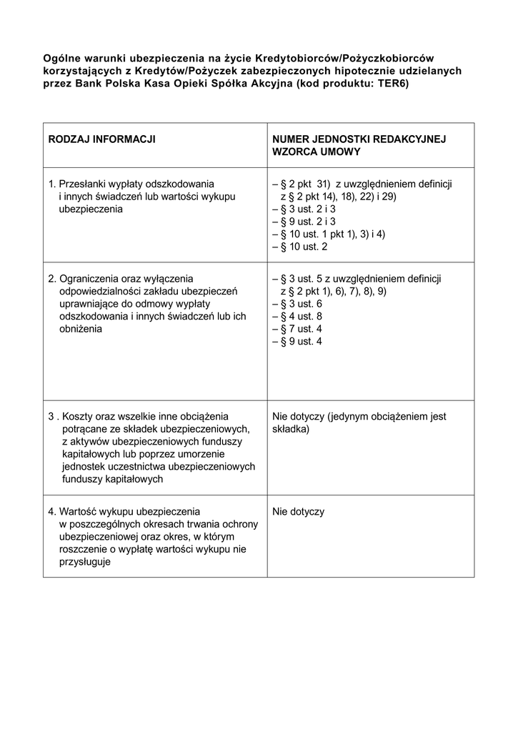 Ogólne warunki ubezpieczenia na życie Kredytobiorców/Pożyczkobiorców korzystających z Kredytów/Pożyczek zabezpieczonych hipotecznie udzielanych przez Bank Polska Kasa Opieki Spółka Akcyjna (kod produktu: TER6) RODZAJ INFORMACJI NUMER JEDNOSTKI REDAKCYJNEJ WZORCA UMOWY 1. P rzesłanki wypłaty odszkodowania i innych świadczeń lub wartości wykupu ubezpieczenia – § 2 pkt 31) z uwzględnieniem definicji z § 2 pkt 14), 18), 22) i 29) – § 3 ust. 2 i 3 – § 9 ust. 2 i 3 – § 10 ust. 1 pkt 1), 3) i 4) – § 10 ust. 2 2. O graniczenia oraz wyłączenia odpowiedzialności zakładu ubezpieczeń uprawniające do odmowy wypłaty odszkodowania i innych świadczeń lub ich obniżenia –§ 3 ust. 5 z uwzględnieniem definicji z § 2 pkt 1), 6), 7), 8), 9) – § 3 ust. 6 – § 4 ust. 8 – § 7 ust. 4 – § 9 ust. 4 3.K oszty oraz wszelkie inne obciążenia potrącane ze składek ubezpieczeniowych, z aktywów ubezpieczeniowych funduszy kapitałowych lub poprzez umorzenie jednostek uczestnictwa ubezpieczeniowych funduszy kapitałowych Nie dotyczy (jedynym obciążeniem jest składka) 4. W artość wykupu ubezpieczenia w poszczególnych okresach trwania ochrony ubezpieczeniowej oraz okres, w którym roszczenie o wypłatę wartości wykupu nie przysługuje Nie dotyczy –1– §1 Niniejsze ogólne warunki ubezpieczenia (zwane dalej o.w.u.) stosuje się w umowach indywidualnego ubezpieczenia na życie Kredytobiorców/ Pożyczkobiorców korzystających z Kredytów/Pożyczek zabezpieczonych hipotecznie udzielanych przez Bank Polska Kasa Opieki Spółka Akcyjna, zawieranych przez TU Allianz Życie Polska S.A., zwane dalej „Allianz”. Postanowienia ogólne §2 Terminom używanym zarówno w o.w.u., załącznikach do o.w.u., wniosku o zawarcie Umowy ubezpieczenia, Polisie oraz wszelkich innych dokumentach stanowiących integralną część Umowy ubezpieczenia nadaje się następujące znaczenia: 1) Akt terroru – nielegalne akcje organizowane z pobudek ideologicznych lub politycznych, indywidualne lub grupowe, skierowane przeciwko osobom lub obiektom w celu wprowadzenia chaosu, zastraszenia ludności lub dezorganizacji życia publicznego przy użyciu przemocy lub skierowane przeciw społeczeństwu z zamiarem jego zastraszenia dla osiągnięcia celów politycznych lub społecznych. 2) Aktualne zadłużenie – pozostająca do spłaty na dzień śmierci Ubezpieczonego kwota kapitału Kredytu/Pożyczki oraz kwota odsetek bieżących bez należności wynikających z nieterminowej spłaty Kredytu/ Pożyczki. 3) Bank – Bank Polska Kasa Opieki Spółka Akcyjna. 4) Centrala Allianz – podstawowa jednostka organizacyjna Allianz powołana do inicjowania, organizowania i nadzorowania realizacji zadań Allianz. Adresem Centrali Allianz jest adres siedziby Allianz wskazany w Polisie. 5) Czynności życia codziennego: 1) poruszanie się w domu – przemieszczanie się z/do łóżka lub z/na krzesło samodzielnie lub z użyciem laski, chodzika, 2) kontrolowanie czynności fizjologicznych – samokontrola w zakresie oddawania kału i moczu przy utrzymaniu zadowalającej higieny osobistej, 3) mycie – samodzielne wykonywanie czynności związanych z myciem w stopniu umożliwiającym utrzymanie higieny osobistej, 4) ubieranie się – samodzielne ubieranie i rozbieranie się – bez konieczności pomocy innej osoby, 5) jedzenie – wykonywanie wszystkich czynności związanych z samodzielnym spożywaniem przygotowanych posiłków (jedzenie i picie), 6) korzystanie z toalety – samodzielne przemieszczanie się do toalety i korzystanie z niej przy utrzymaniu higieny osobistej. 6) Czynny i niezgodny z prawem udział Ubezpieczonego w aktach przemocy – czynne i niezgodne z prawem skierowanie przez Ubezpieczonego czynności fizycznej bezpośrednio przeciwko osobie w celu zmuszenia jej do poddania się woli Ubezpieczonego lub do określonego zachowania zgodnego z wolą Ubezpieczonego, przez co swoboda woli tej osoby zostaje ograniczona. 7) Czynny i niezgodny z prawem udział Ubezpieczonego w rozruchach lub zamieszkach – czynny i niezgodny z prawem udział Ubezpieczonego w wydarzeniach zaistniałych na terenach objętych rozruchami lub zamieszkami w charakterze strony konfliktu bądź działalność Ubezpieczonego polegająca na dostarczaniu, przewożeniu systemów, wyposażenia, urządzeń, pojazdów, broni lub innych materiałów wykorzystywanych podczas rozruchów lub zamieszek. 8) Czynny udział Ubezpieczonego w działaniach wojennych lub aktach stanu wojennego – czynny udział Ubezpieczonego w ruchach wojsk, walkach zbrojnych (lądowych, morskich lub powietrznych) toczących się na terytorium, na którym trwa zorganizowana walka między państwami, narodami lub grupami społecznymi, religijnymi lub etnicznymi. 9) Działanie Ubezpieczonego pod wpływem alkoholu – działanie Ubezpieczonego w stanie, gdy zawartość alkoholu w jego organizmie wynosi lub prowadzi do: 1) stężenia we krwi powyżej 0,2‰ alkoholu lub 2) obecności w wydychanym powietrzu powyżej 0,1 mg alkoholu w 1 dm3. –1– 10) Dzień rozpoczęcia ochrony ubezpieczeniowej – dzień wskazany w Polisie, w którym Allianz zaczyna świadczyć ochronę ubezpieczeniową z tytułu Umowy ubezpieczenia, pod warunkiem opłacenia Składki. 11) Kredyt – złotowy kredyt mieszkaniowy (hipoteczny, budowlano-hipoteczny, kredyt mieszkaniowy MdM z finansowym wsparciem ze środków Funduszu Dopłat, kredyt hipoteczny w Eurokoncie Hipotecznym Plus), udzielony na podstawie umowy Kredytu zawartej pomiędzy Bankiem a Kredytobiorcą. 12)Kredytobiorca – osoba fizyczna, z którą Bank zawarł umowę Kredytu. 13) Lekarz uprawniony – lekarz wskazany przez Allianz i upoważniony do występowania wobec placówek medycznych z wnioskiem o udostępnienie dokumentacji medycznej osoby objętej ubezpieczeniem, do weryfikacji stanu zdrowia tej osoby na podstawie zgromadzonej dokumentacji medycznej oraz do przeprowadzania na koszt Allianz dodatkowych b
