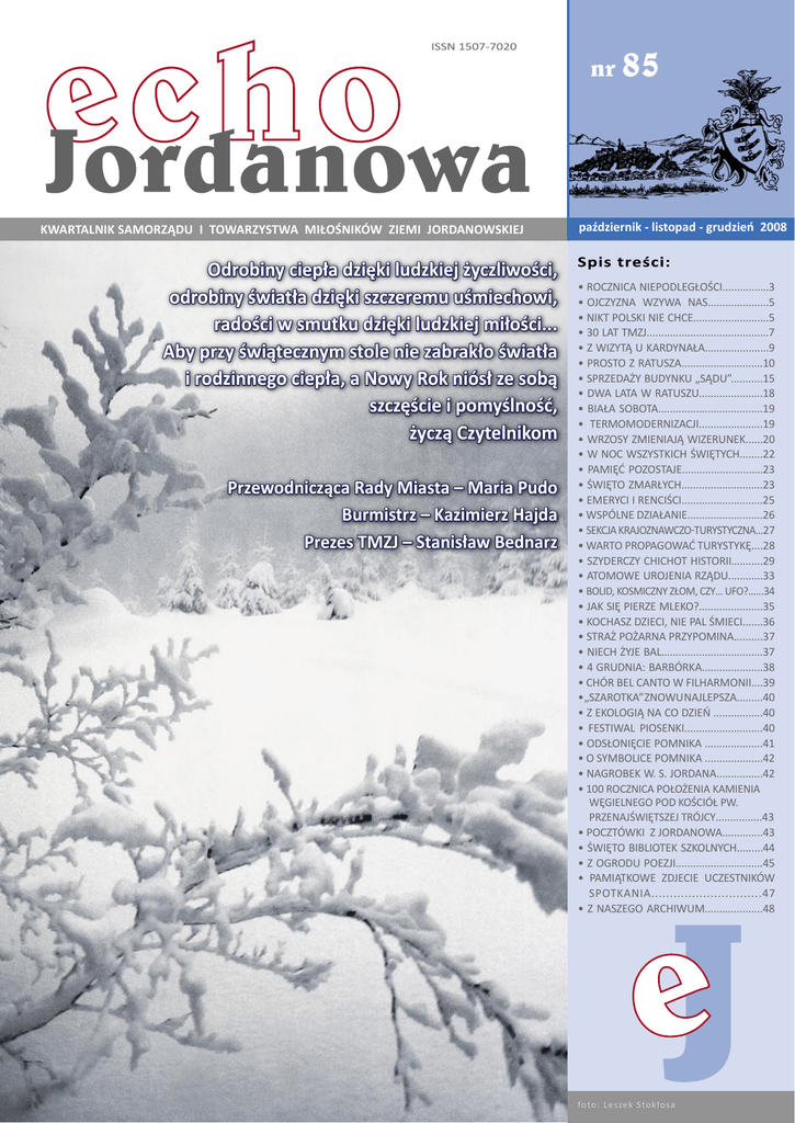 ISSN 1507-7020 nr KWARTALNIK SAMORZĄDU I TOWARZYSTWA MIŁOŚNIKÓW ZIEMI JORDANOWSKIEJ Odrobiny ciepła dzięki ludzkiej życzliwości, odrobiny światła dzięki szczeremu uśmiechowi, radości w smutku dzięki ludzkiej miłości... Aby przy świątecznym stole nie zabrakło światła i rodzinnego ciepła, a Nowy Rok niósł ze sobą szczęście i pomyślność, życzą Czytelnikom Przewodnicząca Rady Miasta – Maria Pudo Burmistrz – Kazimierz Hajda Prezes TMZJ – Stanisław Bednarz 85 październik - listopad - grudzień 2008 • ROCZNICA NIEPODLEGŁOŚCI................3 • OJCZYZNA WZYWA NAS.....................5 • NIKT POLSKI NIE CHCE..........................5 • 30 LAT TMZJ..........................................7 • Z WIZYTĄ U KARDYNAŁA......................9 • PROSTO Z RATUSZA............................10 • SPRZEDAŻY BUDYNKU „SĄDU”...........15 • DWA LATA W RATUSZU......................18 • BIAŁA SOBOTA....................................19 • TERMOMODERNIZACJI......................19 • WRZOSY ZMIENIAJĄ WIZERUNEK......20 • W NOC WSZYSTKICH ŚWIĘTYCH........22 • PAMIĘĆ POZOSTAJE.........................…23 • ŚWIĘTO ZMARŁYCH............................23 • EMERYCI I RENCIŚCI............................25 • WSPÓLNE DZIAŁANIE..........................26 • SEKCJA KRAJOZNAWCZO�TURYSTYCZNA...27 • WARTO PROPAGOWAĆ TURYSTYKĘ....28 • SZYDERCZY CHICHOT HISTORII…........29 • ATOMOWE UROJENIA RZĄDU............33 • BOLID, KOSMICZNY ZŁOM, CZY… UFO?......34 • JAK SIĘ PIERZE MLEKO?......................35 • KOCHASZ DZIECI, NIE PAL ŚMIECI.......36 • STRAŻ POŻARNA PRZYPOMINA..........37 • NIECH ŻYJE BAL…................................37 • 4 GRUDNIA: BARBÓRKA.....................38 • CHÓR BEL CANTO W FILHARMONII....39 • „SZAROTKA” ZNOWU NAJLEPSZA.........40 • Z EKOLOGIĄ NA CO DZIEŃ .................40 • FESTIWAL PIOSENKI...........................40 • ODSŁONIĘCIE POMNIKA ....................41 • O SYMBOLICE POMNIKA ....................42 • NAGROBEK W. S. JORDANA................42 • 100 ROCZNICA POŁOŻENIA KAMIENIA WĘGIELNEGO POD KOŚCIÓŁ PW. PRZENAJŚWIĘTSZEJ TRÓJCY................43 • POCZTÓWKI Z JORDANOWA..............43 • ŚWIĘTO BIBLIOTEK SZKOLNYCH.........44 • Z OGRODU POEZJI..............................45 • PAMIĄTKOWE ZDJECIE UCZESTNIKÓW SPOTKANIA..............................47 • Z NASZEGO ARCHIWUM....................48 fo to : Leszek S to kłosa echo Jordanowa 11 L ISTOPADA Panowie - Starosta, Burmistrz i Prezes TMZJ dokonują odsłonięcia Tablicy Pamiątkowej Świeżo odsłonięta i poświęcona Tablica 30� LECIE TMZJ Uczestnicy spotkania z okazji 30-lecia Towarzystwa Miłośników Ziemi Jordanowskiej 2 echo Jordanowa OBCHODY 90. ROCZNICY ODZYSKANIA NIEPODLEGŁOŚCI W JORDANOWIE Dzień 11 listopada bieżącego roku był pogodny. Przed Ratuszem naszego miasta o rannej porze ustawiły się poczty sztandarowe, a przed nimi orkiestra jordanowskiej straży pożarnej. Złotem i srebrem lśniły instrumenty dęte, muzykanci w granatowych mundurach i takiegoż koloru pelerynach i góralskich kapeluszach prezentowali się pięknie. O godz. 845 w poranną ciszę rynku uderzył potężny dźwięk trąb, klarnetów i saksofonów. Zabrzmiała pieśń patriotyczna: „ Walecznych tysiąc opuszcza Warszawę”. Przygotowana znakomicie przez kapelmistrza Pana Andrzeja Sandulskiego i kierowana przez Pana Władysława Zarembę orkiestra wykazywała wysoki stopień opanowania sztuki muzycznej. W doskonale sformowanym szyku, zachowując równy krok zgodny z rytmem marsza, zmierzała w kierunku Kościoła. Za nią maszerowały poczty sztandarowe i harcerze, podążały władze miasta. Kościół zapełnił się wiernymi. O godz. 900 rozpoczęła się uroczysta Masz Św. Odprawił ją w intencji Ojczyzny ks. Proboszcz Dziekan Bolesław Wawak. Modlono się o pomyślność ojczystego Kraju, a także o spokój duszy poległych na polu chwały polskich żołnierzy. Po słowach Ewangelii ks. Proboszcz wygłosił piękną homilię, w której wspomniał o dniach krwi i chwały i o cenie jaką zapłacił nasz naród za wolność. Podkreślił, że żołnierzowi polskiemu towarzyszyła w trudach bitewnych modlitwa i wiara zwycięstwo. Od pamiętnego dnia 11 listopada 1918 roku minęło 90 lat. Naród polski przeszedł w tym długim okresie wiele ciężkich prób, przeżył okrutną II wojnę światową i okupację. Dziś nareszcie wolny, stoi wobec nowych wyzwań. Sytuacja kraju komplikuje się na skutek ciągłych waśni wśród przywódców, szerzy się przestępczość, korupcja, utrzy- muje bezrobocie, a wśród młodzieży daje się zauważyć bankructwo ideałów i zagubienie drogowskazów życiowych. Z goryczą mówił ksiądz Proboszcz o pogoni za pieniądzem, który dla wielu naszych rodaków stał się sprawą najważniejszą. Ubolewał też nad tym, że tak mało dzieci i młodzieży przybyło na tą Mszę Św. Nad Polską zawisnął mroczny cień, ale za nim kryje się jasna toń. Odsłonić ją może modlitwa i prawdziwa mądrość, na którą powinni się zdobyć Polacy. – Takim akcentem zakończył kazanie ksiądz Proboszcz. Nabożeństwo trwało. Pod sklepienie świątyni niosły się słowa modlitwy, potężne tony organów i śpiewy nabożne za nasz wspólny dom – Polskę. Grała 3 echo Jordanowa też orkiestra straży pożarnej. Po zakończonej Mszy Św. wyruszył sprzed kościoła pochód, udając się przez rynek na teren przylegający do budynku Banku Spółdzielczego. Tutaj miało miejsce uroczyste odsłonięcie i poświęcenie tablicy pamiątkowej umieszczonej na ścianie budynku bankowego. Na tablicy widnieją nazwiska 21 członków Na temat Polowych Drużyn Sokolich i działalności Powiatowego Komitetu Narodowego w Jordanowie wygłosił referat p. Paweł Matejko. Z trzecim referatem pt. „Ślady wielkiej wojny na ziemi jordanowskiej” wystąpił p