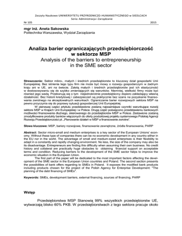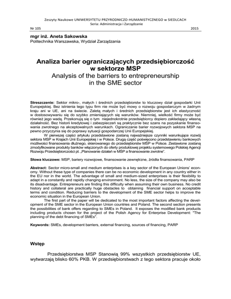 Zeszyty Naukowe UNIWERSYTETU PRZYRODNICZO-HUMANISTYCZNEGO w SIEDLCACH Seria: Administracja i Zarządzanie Nr 105 2015 mgr inż. Aneta Sakowska Politechnika Warszawska, Wydział Zarządzania Analiza barier ograniczających przedsiębiorczość w sektorze MSP Analysis of the barriers to entrepreneurship in the SME sector Streszczenie: Sektor mikro-, małych i średnich przedsiębiorstw to kluczowy dział gospodarki Unii Europejskiej. Bez istnienia tego typu firm nie może być mowy o rozwoju gospodarczym w żadnym kraju ani w UE, ani na świecie. Zaletą małych i średnich przedsiębiorstw jest ich elastyczność w dostosowywaniu się do szybko zmieniających się warunków. Niemniej, wielkość firmy może być również jego wadą. Przekonują się o tym niejednokrotnie przedsiębiorcy dopiero zakładający własną działalność. Bez historii kredytowej i zabezpieczeń są praktycznie bez szans na pozyskanie finansowania zwrotnego na akceptowalnych warunkach. Ograniczanie barier rozwojowych sektora MSP na pewno przyczynia się do poprawy sytuacji gospodarczej Unii Europejskiej. W pierwszej części artykułu przedstawione zostaną najważniejsze czynniki warunkujące rozwój sektora MSP w Krajach Unii Europejskiej i w Polsce. Drugą część poświęcono przedstawieniu bankowych możliwości finansowania dłużnego, skierowanego do przedsiębiorstw MŚP w Polsce. Zestawione zostaną zmodyfikowane produkty banków włączonych do oferty produktowej projektu systemowego Polskiej Agencji Rozwoju Przedsiębiorczości pt. „Planowanie działań w MŚP a finansowanie zwrotne”. Słowa kluczowe: MSP, bariery rozwojowe, finansowanie zewnętrzne, źródła finansowania, PARP Abstract: Sector micro-small and medium enterprises is a key sector of the European Unions’ economy. Without these type of companies there can be no economic development in any country either in the EU nor in the world. The advantage of small and medium-sized enterprises is their flexibility to adapt in a constantly and rapidly changing environment. No less, the size of the company may also be its disadvantage. Entrepreneurs are finding this difficulty when assuming their own business. No credit history and collateral are practically huge obstacles to obtaining financial support on acceptable terms and condition. Reducing barriers to the development of the SME sector helps to improve the economic situation in the European Union. The first part of the paper will be dedicated to the most important factors affecting the development of the SME sector in the European Union countries and Poland. The second section presents the possibilities of bank offers regarding to SMEs in Poland. It exposes the modified bank products including products chosen for the project of the Polish Agency for Enterprise Development: "The planning of the debt financing of SMEs". Keywords: SMEs, development barriers, external financing, sources of financing, PARP Wstęp Przedsiębiorstwa MSP Stanowią 99% wszystkich przedsiębiorstw UE, wytwarzają blisko 60% PKB. W przedsiębiorstwach z tego sektora pracuje około 192 A. Sakowska 1 880 mln osób (ok. 70% wszystkich zatrudnionych) . Zatem sukces gospodarczy Europy jest ściśle związany z ciągłym rozwojem MSP. Niestety z uwagi na ogra2 niczony dostęp do kapitału zewnętrznego rozwój ten jest istotnie ograniczony . Wprawdzie w Unii Europejskiej występuje wiele rodzajów źródeł kapitału ukierunkowanych na finansowanie działalności gospodarczej, ale na ograniczony do nich dostęp, jako jedną z podstawowych barier rozwoju, wskazuje jeden na siedmiu przedstawicieli europejskiego sektora MSP. Największym zaufaniem instytucji finansujących cieszą się nadal firmy duże, o ugruntowanej pozycji na rynku. Ostatnie badania pokazują, że firm, które uważają dostęp do środków zewnętrznych, jako czynnik ograniczający rozwój jest nieznacznie mniej. Jest jednak jeszcze wiele do zrobienia. Celem artykułu jest analiza barier, na jakie napotykają przedsiębiorstwa sektora MSP ze szczególnym uwzględnieniem dostępu do finansowania jako czynnika istotnie ograniczającego rozwój mikro-, małych i średnich przedsiębiorstw oraz próba zniwelowania ograniczeń poprzez dostosowanie oferty finansowania zwrotnego z wykorzystaniem funduszy europejskich w ramach projektu systemowego Polskiej Agencji Rozwoju Przedsiębiorczości. Rodzaje finansowania działalności mikro-, małych i średnich przedsiębiorstw Skrót MSP odnosi się do mikro-, małych i średnich przedsiębiorstw. Unia 3 Europejska zdefiniowała to pojęcie w swoim zaleceniu 2003/361/WE . Podstawowe czynniki decydujące o tym, czy dana firma może zostać uznana za MSP, to: liczba pracowników, roczny obrót albo całkowity bilans roczny. Tabela 1. Podział przedsiębiorstw sektora MSP według zalecenia 2003/361/WE Kategoria przedsiębiorstwa Liczba pracowników średnie małe mikro- < 250 < 50 < 10 Roczny obrót ≤ 50 mln euro ≤ 10 mln euro ≤ 2 mln euro albo Całkowity bilans roczny ≤ 43 mln euro ≤ 10 mln euro ≤ 2 mln euro Źródło: http://ec.europa.eu/enterprise/policies/sme/files/sme_definition/sme_report_2009_ en. pdf, s. 3. Wskazane progi odnoszą się wyłącznie do wyników indywidualnych firm. Przedsiębiorstwo, które stanowi część większej grupy przedsiębiorstw, może być zmuszone dodać niektóre dane dotyczące pracowników/obrotu/bilansu takiej grupy do własnych danych. 1 Annual Report on European SMEs 2013/2014 – A Partial and Fragile Recovery Final Report – European Commission, July 2014. 2 Mikita M., Wpływ nowych regulacji rynku finansowego w Unii Europejskiej na finansowanie małych i średnich przedsiębiorstw przez banki, Studia BAS nr 1/2014. 3 COMMISSION STAFF WORKING DOCUMENT on the implementation of Commission Recommendation of 6 May 2003 concerning the definition of micro, small and medium-sized enterprises, Brussels 7.10.2009. Seria: Administracja i Zarządzanie (32) 2015 ZN nr 105 