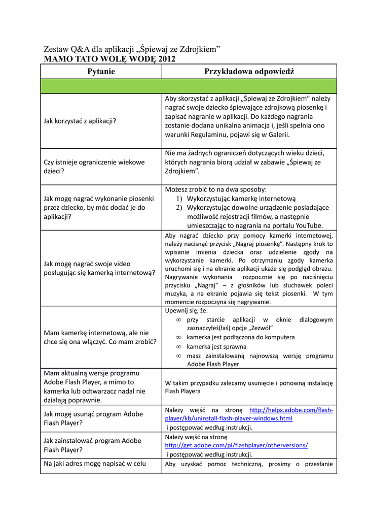 Zestaw Q&A dla aplikacji „Śpiewaj ze Zdrojkiem” MAMO TATO WOLĘ WODĘ 2012 Pytanie Przykładowa odpowiedź Jak korzystać z aplikacji? Czy istnieje ograniczenie wiekowe dzieci? Jak mogę nagrać wykonanie piosenki przez dziecko, by móc dodać je do aplikacji? Jak mogę nagrać swoje video posługując się kamerką internetową? Mam kamerkę internetową, ale nie chce się ona włączyć. Co mam zrobić? Mam aktualną wersje programu Adobe Flash Player, a mimo to kamerka lub odtwarzacz nadal nie działają poprawnie. Jak mogę usunąć program Adobe Flash Player? Jak zainstalować program Adobe Flash Player? Na jaki adres mogę napisać w celu Aby skorzystać z aplikacji „Śpiewaj ze Zdrojkiem” należy nagrać swoje dziecko śpiewające zdrojkową piosenkę i zapisać nagranie w aplikacji. Do każdego nagrania zostanie dodana unikalna animacja i, jeśli spełnia ono warunki Regulaminu, pojawi się w Galerii. Nie ma żadnych ograniczeń dotyczących wieku dzieci, których nagrania biorą udział w zabawie „Śpiewaj ze Zdrojkiem”. Możesz zrobić to na dwa sposoby: 1) Wykorzystując kamerkę internetową 2) Wykorzystując dowolne urządzenie posiadające możliwość rejestracji filmów, a następnie umieszczając to nagrania na portalu YouTube. Aby nagrać dziecko przy pomocy kamerki internetowej, należy nacisnąć przycisk „Nagraj piosenkę”. Następny krok to wpisanie imienia dziecka oraz udzielenie zgody na wykorzystanie kamerki. Po otrzymaniu zgody kamerka uruchomi się i na ekranie aplikacji ukaże się podgląd obrazu. Nagrywanie wykonania rozpocznie się po naciśnięciu przycisku „Nagraj” – z głośników lub słuchawek poleci muzyka, a na ekranie pojawia się tekst piosenki. W tym momencie rozpoczyna się nagrywanie. Upewnij się, że: • przy starcie aplikacji w oknie dialogowym zaznaczyłeś(łaś) opcje „Zezwól” • kamerka jest podłączona do komputera • kamerka jest sprawna • masz zainstalowaną najnowszą wersję programu Adobe Flash Player W takim przypadku zalecamy usunięcie i ponowną instalację Flash Playera Należy wejść na stronę http://helpx.adobe.com/flashplayer/kb/uninstall-flash-player-windows.html i postępować według instrukcji. Należy wejść na stronę http://get.adobe.com/pl/flashplayer/otherversions/ i postępować według instrukcji. Aby uzyskać pomoc techniczną, prosimy o przesłanie uzyskania pomocy technicznej? Nie posiadam kamerki internetowej. Czy istnieje inny sposób na przesłanie nagrania? wiadomości mailowej na adres: [email protected] Będziemy wdzięczni za możliwie szczegółowe opisanie napotkanego problemu. Oczywiście. Wystarczy, że Uczestnik dokona nagrania innym urządzeniem (np. telefonem komórkowym), a następnie umieści je na serwisie YouTube. Zgłoszeniem będzie wtedy dodanie w aplikacji internetowego linku do owego nagrania. Należy – korzystając z własnego konta – zamieścić nagranie w serwisie YouTube. Następnie wystarczy Jak mogę przesłać nagranie za zamieścić jego link w aplikacji konkursowej i nacisnąć pomocą serwisu YouTube? przycisk „Nagraj piosenkę”. Do nagrania dodana zostanie zdrojkowa animacja i w ten sposób powstanie unikalny teledysk. Po wejściu na stronę youtube.com należy w górnym Nie posiadam konta w serwisie prawym rogu ekranu kliknąć w przycisk „Załóż konto”. YouTube. Jak je założyć? W ten sposób rozpocznie się proces rejestracji, która jest prosta i zajmuje tylko kilka minut. Tak, istnieje taka możliwość. Dodając film na YouTubie masz Nie chcę żeby mój film mógł zobaczyć możliwość wyboru 1 z 2 opcji wyświetlania się filmu: każdy na portalu YouTube. Czy istnieje • publiczny (film może oglądać każdy) sposób by dodać go, ale by był • niepubliczny (film może oglądać osoba posiadająca niewidoczny dla innych osób? Chcę zapisać nagranie na dysku, ale nie wiem jak. Czy mogę zgłosić więcej niż jedno nagranie? link) Postępuj zgodnie z poniższą instrukcją: • Gdy klikniesz „Zapisz” w galerii na ekranie pojawi się okno z opcją otwarcia pliku lub zapisu pliku .rar na dysku. Należy wybrać opcję „Zapisz” • Kliknij prawym przyciskiem myszy na ikonę pliku (w miejscu, w którym plik został zapisany) i wypakuj pliki: txt, flv i exe (flash) • Po kliknięciu w plik flash pojawi się zapisany teledysk UWAGA! Aby prawidłowo odtworzyć film należy zainstalować program do obsługi technologii Flash (polecany: Adobe Flash Player) Tak, z aplikacji „Śpiewaj ze Zdrojkiem” można korzystać wielokrotnie. Czy w teledysku może wystąpić więcej Tak, w teledysku może wystąpić dowolna liczba dzieci. niż jedno dziecko? Jeśli nagranie spełnia warunki Regulaminu, w ciągu 48 Kiedy i gdzie pojawi się moje godzin pojawi się w Galerii na stronie nagranie? www.wolewode.pl Nagrałem video i wgrałem je do Wszystkie zgłoszenia są weryfikowane pod kątem aplikacji, ale teledysk nie ukazał się w poprawności ich treści zgodnie z § 3.6 Regulaminu. galerii. Dlaczego? Przewidywany czas opublikowania zgłoszenia w galerii nie powinien przekraczać 48 h od chwili dodania wykonania do aplikacji. Upewnij się także, czy po nagraniu filmu kliknąłeś(łaś) na guzik „Zapisz”, masz aktywne połączenie z Minęło już 48 godzin od dodania mojego teledysku, a nadal nie ukazał się on w galerii. Czy aplikacja „Śpiewaj ze Zdrojkiem” jest tym samym co „Śpiewający Konkurs Zdrojka”? Czy moje nagranie bierze udział w konkursie? Internetem lub czy podczas nagrywania i zapisu połączenie z Internetem nie zostało przerwane. O publikacji Użytkownik zostanie powiadomiony mailem na podany adres. Prosimy, upewnij się, czy Twoje nagranie jest zgodne z Regulaminem. Jeśli tak – nagranie na pewno zostanie opublikowane wkrótce. Nie, aplikacja „Śpiewaj ze Zdrojkiem” nie jest aplikacją konkursową i nie gwarantuje wygrania żadnych nagród.