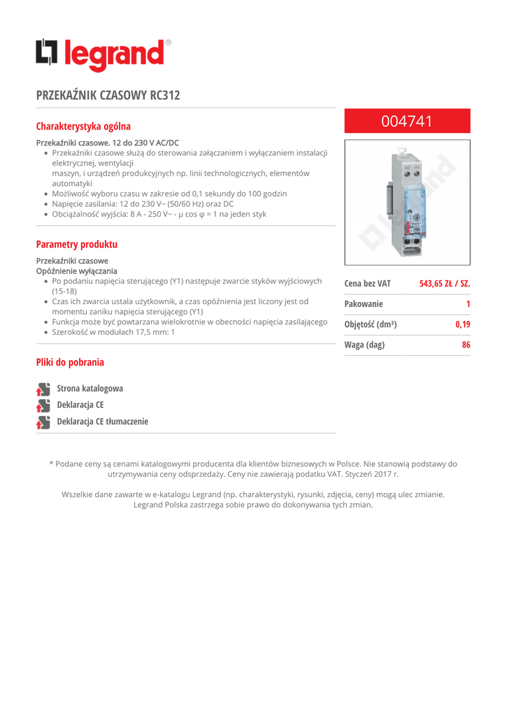 PRZEKAŹNIK CZASOWY RC312 Charakterystyka ogólna 004741 Przekaźniki czasowe. 12 do 230 V AC/DC Przekaźniki czasowe służą do sterowania załączaniem i wyłączaniem instalacji elektrycznej, wentylacji maszyn, i urządzeń produkcyjnych np. linii technologicznych, elementów automatyki Możliwość wyboru czasu w zakresie od 0,1 sekundy do 100 godzin Napięcie zasilania: 12 do 230 V~ (50/60 Hz) oraz DC Obciążalność wyjścia: 8 A - 250 V~ - μ cos φ = 1 na jeden styk Parametry produktu Przekaźniki czasowe Opóźnienie wyłączania Po podaniu napięcia sterującego (Y1) następuje zwarcie styków wyjściowych (15-18) Czas ich zwarcia ustala użytkownik, a czas opóźnienia jest liczony jest od momentu zaniku napięcia sterującego (Y1) Funkcja może być powtarzana wielokrotnie w obecności napięcia zasilającego Szerokość w modułach 17,5 mm: 1 Cena bez VAT 543,65 ZŁ / SZ. 1 Pakowanie Objętość (dm³) 0,19 Waga (dag) Pliki do pobrania Strona katalogowa Deklaracja CE Deklaracja CE tłumaczenie * Podane ceny są cenami katalogowymi producenta dla klientów biznesowych w Polsce. Nie stanowią podstawy do utrzymywania ceny odsprzedaży. Ceny nie zawierają podatku VAT. Styczeń 2017 r. Wszelkie dane zawarte w e-katalogu Legrand (np. charakterystyki, rysunki, zdjęcia, ceny) mogą ulec zmianie. Legrand Polska zastrzega sobie prawo do dokonywania tych zmian. 86