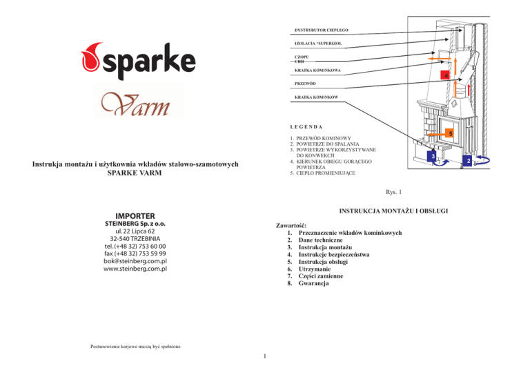 DYSTRYBUTOR CIEP£EGO IZOLACIA “SUPERIZOL CZOPU CHH 1 KRATKA KOMINKOWA 4 PRZEWÓD KRATKA KOMINKOW LE GENDA 5 1. PRZEWÓD KOMINOWY 2. POWIETRZE DO SPALANIA 3. POWIETRZE WYKORZYSTYWANE DO KONWEKCJI 4. KIERUNEK OBIEGU GOR¥CEGO POWIETRZA 5. CIEP£O PROMIENIUJ¥CE Instrukja monta¿u i u¿ytkownia wk³adów stalowo-szamotowych SPARKE VARM 3 Rys. 1 INSTRUKCJA MONTA¯U I OBS£UGI IMPORTER STEINBERG Sp. z o.o. ul. 22 Lipca 62 32-540 TRZEBINIA tel. (+48 32) 753 60 00 fax (+48 32) 753 59 99 [email protected] www.steinberg.com.pl Zawartoœæ: 1. Przeznaczenie wk³adów kominkowych 2. Dane techniczne 3. Instrukcja monta¿u 4. Instrukcje bezpieczeñstwa 5. Instrukcja obs³ugi 6. Utrzymanie 7. Czêœci zamienne 8. Gwarancja Postanowienie karjowe musz¹ byæ spe³nione 1 2 1. Przeznaczenie wk³adów kominkowych: 3. Instrukcja monta¿u: Celem wk³adu kominkowego jest zwiêkszenie zdolnoœci grzewczej urz¹dzenia, ekonomi obs³ugi, jak równie¿ bezpieczeñstwa obs³ugi w momencie palenia otwartym ogniem. Wk³ad posiada komorê spalania pokryt¹ materia³em izolacyjnym odpornym na sta³e oddzia³ywanie p³omieni we wnêtrzu kominka. Drewno opa³owe lub brykiet drzewny s¹ spalane wewn¹trz. Wk³ad jest zaprojektowany do wbudowania go w œcianê i po³¹czenia z kominem przy u¿yciu „czarnego”, metalowego przewodu kominowego. U W A G A !!! Aby zapobiec ryzyku powstania ognia, urz¹dzenie musi zostaæ zainstalowane w zgodzie z lokalnymi przepisami, europejskimi standardami. Producent odpowiada tylko i wy³¹cznie za urz¹dzenie. Dlatego te¿, przypominamy, ¿e ka¿dy materia³ u¿yty do monta¿u (izolacja, ³¹czniki, itp.) musi byæ zgodny z obowi¹zuj¹cymi standardami. Przy instalowaniu i obs³udze urz¹dzeñ grzewczych nale¿y stosowaæ siê do wszystkich niezbêdnych norm krajowych i europejskich jak i lokalnych przepisów, których nale¿y przestrzegaæ przy instalowaniu i obs³udze kominka w tym: Monta¿ wk³adu powinien byæ wykonany przez wykwalifikowanego instalatora posiadaj¹cego stosowne uprawnienia i doœwiadczenie w wykonywaniu tego rodzaju instalacji, a nastêpnie powinno siê dokonaæ odbioru ca³ej instalacji grzewczej. Przy instalowaniu i obs³udze urz¹dzeñ grzewczych nale¿y stosowaæ siê do wszystkich niezbêdnych norm krajowych i europejskich jak i lokalnych przepisów, których nale¿y przestrzegaæ przy instalowaniu i obs³udze kominka w tym: Prawo Budowlane Dz.U. Nr 89 z 1994r. poz. 414 z póŸniejszymi zmianami Ustawa z dn. 16.04.2004 o wyrobach budowlanych (Dz.U.Nr 92 poz.881 z 2004) Rozporz¹dzenie Ministra Infrastruktury z dn. 12 kwietnia 2002 Dz.U. Nr 75, poz. 690 z póŸniejszymi zmianami Rozporz¹dzenie Ministra Spraw Wewnêtrznych i Administracji z dn. 16 Dz.U. Nr 12 poz. 1138 z dn. 11 lipca 2003 z póŸniejszymi zmianami Normy krajowe: m.in.: PN-EN 13229:2002/A2: 2005: „Wk³ady kominkowe wraz z kominkami otwartymi na paliwa sta³e. Wymagania i badania” Prawo Budowlane Dz.U. Nr 89 z 1994r. poz. 414 z póŸniejszymi zmiana mi Rozporz¹dzenie Ministra Infrastruktury w sprawie warunków technicznym jakim powinny odpowiadaæ budynki i ich usytuowanie z dn. 12 kwietnia 2002 Dz.U. Nr 75, poz. 690 z póŸniejszymi zmianami w tym zapis: Kominki opalane drewnem z otwartym paleniskiem lub zamkniêtym wk³adem kominkowym mog¹ byæ instalowane wy³¹cznie w budynkach jednorodzinnych, mieszkalnych w zabudowie zagrodowej i rekreacji indywidualnej oraz niskich budynkach wielorodzinnych, w pomieszczeniach: 1) o kubaturze wynikaj¹cej ze wskaŸnika 4 m3/kW nominalnej mocy cieplnej kominka, lecz nie mniejszej ni¿ 30 m3, 2) spe³niaj¹cych wymagania dotycz¹ce wentylacji, o których mowa w § 150 ust. 9, 3) posiadaj¹cych przewody kominowe okreœlone w § 140 ust. 1 i 2 oraz § 145 ust. 1, 4) w których mo¿liwy jest dop³yw powietrza do paleniska kominka w iloœci: a) co najmniej 10 m3/h na 1 kW nominalnej mocy cieplnej kominka - dla kominków o obudowie zamkniêtej, b) zapewniaj¹cej nie mniejsz¹ prêdkoœæ przep³ywu powietrza w otworze komory spalania ni¿ 0,2 m/s - dla kominków o obudowie otwartej. Rozporz¹dzenie Ministra Spraw Wewnêtrznych i Administracji z dn. 16 Dz.U. Nr 12 poz. 1138 z dn. 11 l ipca 2003 z póŸniejszymi zmianami Norma PN-EN 13229:2002/A2: 2005: „Wk³ady kominkowe wraz z kominkami otwartymi na paliwa sta³e. Wymagania i badania” Ustawa z dn. 16.04.2004 o wyrobach budowlanych (Dz.U.Nr 92 poz.881 z 2004) 2. Dane techniczne: Wk³ady kominkowe SPARKE VARM , produkowane s¹ z ogniotrwa³ych stalowych elementów, których powierzchnia pokryta jest emali¹ odporn¹ na wysok¹ temperaturê. Komora spalania wy³o¿ona jest p³ytami szamotowymi, które zwiêkszaj¹ izolacjê termiczn¹, a tak¿e wyd³u¿aj¹ ¿ywotnoœæ wk³ad, a jednoczeœnie poprawiaj¹ jakoœæ spalania w palenisku. Szklane drzwiczki odporne na wysokie temperatury, zawsze umo¿liwiaj¹ obserwacjê p³omieni jednoczeœnie zapewniaj¹c bezpieczeñstwo i ekonomiczn¹ pracê. Regulacja nap³ywu powietrza niezbêdnego do spalania pozwala na ustawienie czasu spalania wk³adu. Pozwala równie¿ na ograniczenie szybkiego spalania i s³u¿y zapewnieniu wydajnoœci. Wartoœæ ciep³a produkowanego przez wk³ady kominkowe jest nieporównywalnie wiêksza od tego produkowanego w tradycyjny sposób, umo¿liwiaj¹c pracê z otwartymi drzwiczkami z racjonalnym zu¿yciem drewna. Górna czêœæ kominka jest zaprojektowana w sposób aby zapewniæ efektywn¹ wymianê powietrza. Strumieñ ch³odniejszego powietrza pobieranego z pod³ogi wp³ywa od do³u, powraca poprzez przewody wentylacyjne do pomieszczenia po wczeœniejszym przejœciu przez dystrybutor ciep³ego powietrza. Ka¿dy wk³ad kominkowy powinien posiadaæ swój oddzielny komin (Do jednego komina mo¿na tylko pod³¹czyæ jeden wk³ad). Kratka powietrzna powinna byæ tak zaprojektowana aby nie mog³a siê zapchaæ Nale¿y zapewniæ miejsce do oczyszczenia kominka i dostêp do przewodu stalowgo ³¹cz¹cego koinke z kominem. Powierzchnia monta