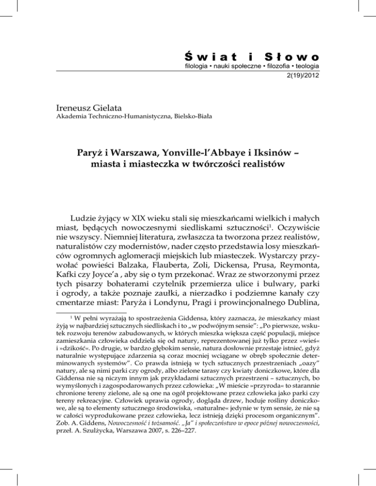 Świat i Słowo filologia • nauki społeczne • filozofia • teologia 2(19)/2012 Ireneusz Gielata Akademia Techniczno-Humanistyczna, Bielsko-Biała Paryż i Warszawa, Yonville-l’Abbaye i Iksinów – miasta i miasteczka w twórczości realistów Ludzie żyjący w XIX wieku stali się mieszkańcami wielkich i małych miast, będących nowoczesnymi siedliskami sztuczności1. Oczywiście nie wszyscy. Niemniej literatura, zwłaszcza ta tworzona przez realistów, naturalistów czy modernistów, nader często przedstawia losy mieszkańców ogromnych aglomeracji miejskich lub miasteczek. Wystarczy przywołać powieści Balzaka, Flauberta, Zoli, Dickensa, Prusa, Reymonta, Kafki czy Joyce’a , aby się o tym przekonać. Wraz ze stworzonymi przez tych pisarzy bohaterami czytelnik przemierza ulice i bulwary, parki i ogrody, a także poznaje zaułki, a nierzadko i podziemne kanały czy cmentarze miast: Paryża i Londynu, Pragi i prowincjonalnego Dublina, 1 W pełni wyrażają to spostrzeżenia Giddensa, który zaznacza, że mieszkańcy miast żyją w najbardziej sztucznych siedliskach i to „w podwójnym sensie”: „Po pierwsze, wskutek rozwoju terenów zabudowanych, w których mieszka większa część populacji, miejsce zamieszkania człowieka oddziela się od natury, reprezentowanej już tylko przez »wieś« i »dzikość«. Po drugie, w bardzo głębokim sensie, natura dosłownie przestaje istnieć, gdyż naturalnie występujące zdarzenia są coraz mocniej wciągane w obręb społecznie determinowanych systemów”. Co prawda istnieją w tych sztucznych przestrzeniach „oazy” natury, ale są nimi parki czy ogrody, albo zielone tarasy czy kwiaty doniczkowe, które dla Giddensa nie są niczym innym jak przykładami sztucznych przestrzeni – sztucznych, bo wymyślonych i zagospodarowanych przez człowieka: „W mieście »przyroda« to starannie chronione tereny zielone, ale są one na ogół projektowane przez człowieka jako parki czy tereny rekreacyjne. Człowiek uprawia ogrody, dogląda drzew, hoduje rośliny doniczkowe, ale są to elementy sztucznego środowiska, »naturalne« jedynie w tym sensie, że nie są w całości wyprodukowane przez człowieka, lecz istnieją dzięki procesom organicznym”. Zob. A. Giddens, Nowoczesność i tożsamość. „Ja” i społeczeństwo w epoce późnej nowoczesności, przeł. A. Szulżycka, Warszawa 2007, s. 226–227. 162 Ireneusz Gielata Rouen i odległego od niego o osiem mil fikcyjnego miasteczka Yonville-l’Abbaye, Warszawy i powiatowego miasta Iksinów, wielkoprzemysłowej Łodzi i nienazwanego przez Dickensa „wielkiego przemysłowego miasta”, będącego potężną aglomeracją z tysiącami fabryk2. Miasto jest w tych utworach wszechobecne. Nawet gdy bohaterowie owych powieści są mieszkańcami wsi lub ziemskich majątków, a niekiedy maleńkich miasteczek, które nierzadko bardziej przypominają społeczności wiejskie niż miejskie, to często marzą o życiu w nowoczesnych metropoliach. Tak dzieje się chociażby w utworze Flauberta, gdzie Emma Bovary, nim wpadnie w ramiona kolejnych kochanków, ucieka od nudy wiejskiego życia i banalnej codzienności małego miasteczka do wyobrażonego Paryża, o którym wciąż roi w swoich myślach „przechadzając się” palcem po mapie pośród jego rozlicznych ulic. „Sprawiła sobie plan Paryża i koniuszkiem palca przemierzała na mapie stolicę. Szła bulwarami, zatrzymując się na każdym rogu między kreskami ulic, przed każdym białym prostokątem wyobrażającym budynek. W końcu zaczynały ją boleć oczy, przymykała powieki i w ciemnościach widziała zmagające się z wiatrem płomyki gazowych latarni, stopnie powozów spadały z trzaskiem przed portykami teatrów”3. Emma Bovary w marzeniach przemieszcza się do Paryża, który jak „mglisty ocean” migotał przed jej oczyma kipiąc „gwarnym i tłumnym życiem”4, zaś w rzeczywistości przenosi się z miejsca na miejsce; przy czym za każdym razem jest to ruch z mniejszej do większej miejscowości. Gdy poślubia Karola, opuszcza rodzinną wioskę Bertaux i trafia do maleńkiego Tostes, w którym życie właściwie toczy się tak jak na wsi, by po jakimś czasie osiąść – jak pisze nie bez ironii Flaubert – w „sporym miasteczku” Yonville-l’Abbaye5. Owo miasteczko zastyga w lenistwie i „patrzącemu z oddali przypomina pastucha”, drzemiącego przy krowach. Yonville-l’Abbaye nie rozwija się ani ekonomicznie, ani kulturalnie, chociaż od jakiegoś czasu połączono je z drogą łączącą z „traktem rządowym” zmierzającym z Rouen do Flandrii. Jedynie przybywa w nim nowych domów, skoro miasteczko „rozrasta się nadal w stronę rzeki”. Nowe miejsce zamieszkania Emmy Bovary nie odznacza się też niczym szczególnym. Domostwa są tu małe, 2 Takie miasto bez imienia pojawia się w powieści Magazyn osobliwości. Zob. K. Dickens, Magazyn osobliwości, przekł. A. Przedpełska-Trzeciakowska, Warszawa 1988. 3 G. Flaubert, Pani Bovary. Z obyczajów prowincji, przekł. i posł. R. Engelking, Gdańsk 2005, s. 58–59. 4 Zob. G. Flaubert, Pani Bovary…, s. 59; choć trzeba zaznaczyć, że Emma Bovary, pod wpływem lektur powieści Waltera Scotta równie chętnie marzy o życiu w starych zamczyskach. Zob. tamże, s. 40. 5 Zob. G. Flaubert, Pani Bovary…, s. 67. Paryż i Warszawa, Yonville-l’Abbaye i Iksinów… 163 a ich dachy zakrywają „trzecią część niskich okien” z wypukłymi i grubymi szybami. Spośród nich wyróżnia się jedynie biały domek notariusza z błyszczącymi tabliczkami i klombem zdobnym w amorka z palcem na ustach oraz apteka pana Homais ze złotym szyldem, cała oblepiona reklamowymi afiszami. Na podwórkach domostw znajdują się jeszcze inne zabudowania. Narrator skrupulatnie wylicza ich rodzaje: tłocznie, wozownie i destylarnie; są one bezwładnie porozrzucane pośród drzew, z których „zwisają drabiny, tyki i kosy”. W centrum miasteczka, nieopodal rynk