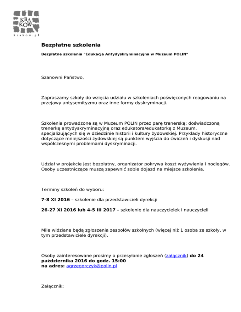 Bezpłatne szkolenia Bezpłatne szkolenia "Edukacja Antydyskryminacyjna w Muzeum POLIN" Szanowni Państwo, Zapraszamy szkoły do wzięcia udziału w szkoleniach poświęconych reagowaniu na przejawy antysemityzmu oraz inne formy dyskryminacji. Szkolenia prowadzone są w Muzeum POLIN przez parę trenerską: doświadczoną trenerkę antydyskryminacyjną oraz edukatora/edukatorkę z Muzeum, specjalizujących się w dziedzinie historii i kultury żydowskiej. Przykłady historyczne dotyczące mniejszości żydowskiej są punktem wyjścia do ćwiczeń i dyskusji nad współczesnymi problemami dyskryminacji. Udział w projekcie jest bezpłatny, organizator pokrywa koszt wyżywienia i noclegów. Osoby uczestniczące muszą zapewnić sobie dojazd na miejsce szkolenia. Terminy szkoleń do wyboru: 7-8 XI 2016 – szkolenie dla przedstawicieli dyrekcji 26-27 XI 2016 lub 4-5 III 2017 – szkolenie dla nauczycielek i nauczycieli Mile widziane będą zgłoszenia zespołów szkolnych (więcej niż 1 osoba ze szkoły, w tym przedstawiciele dyrekcji). Osoby zainteresowane prosimy o przesyłanie zgłoszeń (załącznik) do 24 października 2016 do godz. 15:00 na adres: [email protected] Załącznik: 1)Formularz zgłoszeniowy Powered by TCPDF (www.tcpdf.org)