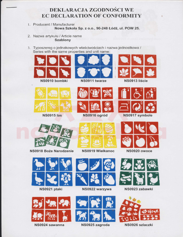 DEKLARACJ A ZGODNOSCI WE EC DECLARATION OF CONFORMITY 1. Producent/ Manufacturer Nowa SzkołaSp. z o.o.,90-248Łódź,u|.PoW 25' 2. Nazwaańykułu / Ańicle name Szablony właściwościach i nazwajednostkowa 3. Typoszerego jednakowych / and unitname: Serieswiththe same properties trtrEI trEIEI MtrEI trtrH MEE [IEffi NEIffiEffiffi NS0910 bombki NS0915las NS0911twarze l I I NS0916ogród NS0913|iście tr NS0917 symbole E EE ffiffiEI trHtsNE//E Ns0918BożeNarodzenie NS0919Wielkanoc NS0920 owoce EEEETEEHEI H trtrEEffiI NS0921ptaki N50922warzlrua EMEEXHtr N50924sawanna NS0925zagroda N50923zabawki NS0926 szlaczki ETE NS0927ramki NS0966 maski karnawałowe N50963dinozaury N50965maski zwierzatzoo N50967 maski zwieŻąt |eśnych N53020kwiaty 4. opisane powyzejprzedmiotyniniejszejdek|aracjisą zgodne z odnośnymi wymaganiamiprzepisów wspó|notowychdotyczącychharmonizacji wymienionymiponizej/ The objectsof the declarationdescribedabove is in conformitywiththe relevantCommunityharmonizationlegislationbellow mentioned: EN-7l-l :2005'EN-7l-2:200ó' EN-71-3: l 994+Al:2000 Ę Niniejszadek|aracjaWydanazostaje na wyłącznąodpowiedzia|ność oroducenta. This declarationis issuedunderthe sole responsibility of the manufacturer. 6 . Data i miejscewydania/ Date and place of issue Ł ó d z ' d n . ' . 0 9 . 0 8 . 2 0 1r1. . . . . . . . Nazwisko / Name Stanowisko/ Title Podpis/ Signature Grzybowski Roman