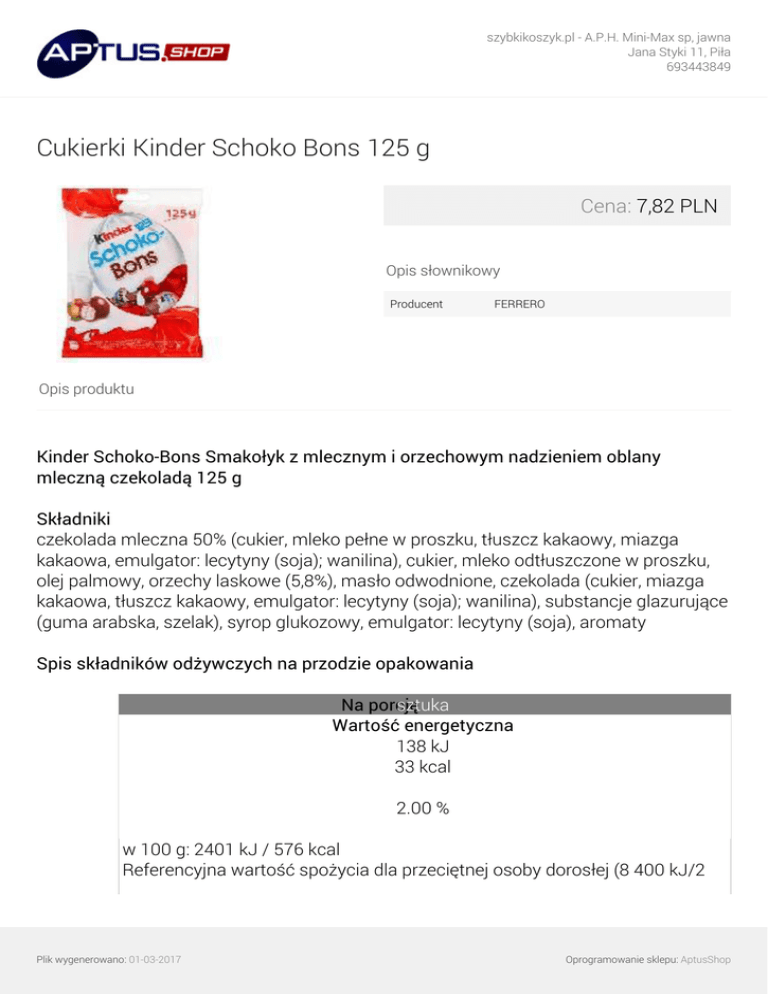 szybkikoszyk.pl - A.P.H. Mini-Max sp, jawna Jana Styki 11, Piła 693443849 Cukierki Kinder Schoko Bons 125 g Cena: 7,82 PLN Opis słownikowy Producent FERRERO Opis produktu Kinder Schoko-Bons Smakołyk z mlecznym i orzechowym nadzieniem oblany mleczną czekoladą 125 g Składniki czekolada mleczna 50% (cukier, mleko pełne w proszku, tłuszcz kakaowy, miazga kakaowa, emulgator: lecytyny (soja); wanilina), cukier, mleko odtłuszczone w proszku, olej palmowy, orzechy laskowe (5,8%), masło odwodnione, czekolada (cukier, miazga kakaowa, tłuszcz kakaowy, emulgator: lecytyny (soja); wanilina), substancje glazurujące (guma arabska, szelak), syrop glukozowy, emulgator: lecytyny (soja), aromaty Spis składników odżywczych na przodzie opakowania Na porcję sztuka Wartość energetyczna 138 kJ 33 kcal 2.00 % w 100 g: 2401 kJ / 576 kcal Referencyjna wartość spożycia dla przeciętnej osoby dorosłej (8 400 kJ/2 Plik wygenerowano: 01-03-2017 Oprogramowanie sklepu: AptusShop szybkikoszyk.pl - A.P.H. Mini-Max sp, jawna Jana Styki 11, Piła 693443849 000 kcal) Wartości odżywcze Średnia wartość Sztuka 5,8 g odżywcza 100 g Wartość energetyczna Sztuka %* Tłuszcz w tym kwasy tłuszczowe nasycone Węglowodany w tym cukry Białko Sól *Referencyjna wartość spożycia dla przeciętnej osoby dorosłej (8 400 kJ/2 000 kcal). Nazwa produktu uregulowana prawnie Smakołyk z mlecznym i orzechowym nadzieniem oblany mleczną czekoladą. Plik wygenerowano: 01-03-2017 Oprogramowanie sklepu: AptusShop szybkikoszyk.pl - A.P.H. Mini-Max sp, jawna Jana Styki 11, Piła 693443849 Marka Kinder Cechy +mleko -kakao Marka standaryzowana Marka: Kinder Adres firmy ul. Wiertnicza 126 02-952 Warszawa Pozostałe informacje sztuka: 138 kJ 33 kcal 2%* 100 g: 2401 kJ / 576 kcal Składniki mleka: 28% - Składniki kakao: 16%. *Referencyjna wartość spożycia dla przeciętnej osoby dorosłej (8 400 kJ/2 000 kcal). Company Name Ferrero Polska Commercial Sp. z o.o. Zalecenia dla alergików Mleko: Zawiera Orzechy laskowe: Zawiera Soja: Zawiera Przechowywanie Przechowywać w suchym i chłodnym miejscu. Rodzaj przechowywania Typ: Przechowywać w temperaturze otoczenia Rozmiar opakowania 125 Jednostka (tekst opisowy) g Pozostały tekst dotyczący ilości porcji/użyć Plik wygenerowano: 01-03-2017 Oprogramowanie sklepu: AptusShop szybkikoszyk.pl - A.P.H. Mini-Max sp, jawna Jana Styki 11, Piła 693443849 Zawiera ≈ 21 sztuk Średnia miara Średnia miara (e) Jednostka (specyficzna) Jednostka (specyficzna): Gramów Rodzaj opakowania Typ: Zgrzewane Wymiar liczbowy Wymiar liczbowy: 125 Wymiar Wymagana wysokość na półce: 171 Wymagana szerokość na półce: 132 Wymagana głębokość na półce: 32 Waga Waga brutto: 134 Sprzedaż jednostkowa Wysokość: 171 Szerokość: 132 Głębokość: 32 Adres producenta Ferrero Polska Commercial Sp. z o.o. ul. Wiertnicza 126 02-952 Warszawa Adres zwrotny Ferrero Polska Commercial Sp. z o.o. ul. Wiertnicza 126 02-952 Warszawa Infolinia Ferrero Polska 801 550 550 Opłata według stawek operatora www.ferrero.pl Telefon/Fax kontaktowy 801 550 550 Adres internetowy Plik wygenerowano: 01-03-2017 Oprogramowanie sklepu: AptusShop szybkikoszyk.pl - A.P.H. Mini-Max sp, jawna Jana Styki 11, Piła 693443849 www.ferrero.pl Języki na opakowaniu polski, inne Język produktu Główny język opisu: polski Język danych: polski Plik wygenerowano: 01-03-2017 Powered by TCPDF (www.tcpdf.org) Oprogramowanie sklepu: AptusShop