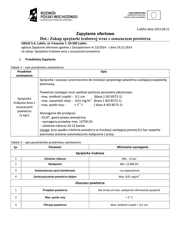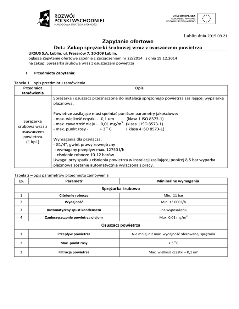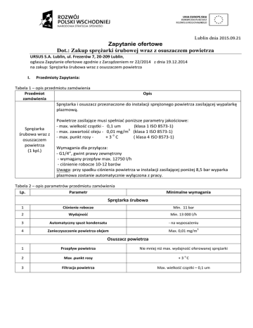 Lublin dnia 2015.09.21 Zapytanie ofertowe Dot.: Zakup sprężarki śrubowej wraz z osuszaczem powietrza URSUS S.A. Lublin, ul. Frezerów 7, 20-209 Lublin, ogłasza Zapytanie ofertowe zgodnie z Zarządzeniem nr 22/2014 z dnia 19.12.2014 na zakup: Sprężarka śrubowa wraz z osuszaczem powietrza I. Przedmioty Zapytania: Tabela 1 – opis przedmiotu zamówienia Przedmiot Opis zamówienia Sprężarka i osuszacz przeznaczone do instalacji sprężonego powietrza zasilającej wypalarkę plazmową. Sprężarka śrubowa wraz z osuszaczem powietrza (1 kpl.) Powietrze zasilające musi spełniać poniższe parametry jakościowe: - max. wielkość cząstki - 0,1 um (klasa 1 ISO 8573-1) 3 - max. zawartość oleju - 0,01 mg/m (klasa 1 ISO 8573-1) - max. punkt rosy +3oC ( klasa 4 ISO 8573-1) Wymagania dla przyłącza: - G1/4”, gwint prawy zewnętrzny - wymagany przepływ max. 12750 l/h - ciśnienie robocze 10-12 barów Uwaga: przy spadku ciśnienia powietrza w instalacji zasilającej poniżej 8,5 bar wyparka plazmowa zostanie automatycznie wyłączona z pracy. Tabela 2 – opis parametrów przedmiotu zamówienia Lp. Parametr Minimalne wymagania Sprężarka śrubowa 1 Ciśnienie robocze Min. 11 bar 2 Wydajność Min. 13 000 l/h 3 Automatyczny spust kondensatu - na wyposażeniu 4 Zanieczyszczenie powietrza olejem Max. 0,01 mg/m 3 Osuszacz powietrza 1 Przepływ powietrza Nie mniej niż max. wydajność oferowanej sprężarki 2 Max .punkt rosy +3 C 3 Filtracja powietrza Max. wielkość cząstki – 0,1 um o II. Miejsce składania i otwierania ofert Oferty na załączonym formularzu należy składać do dnia 06.10.2015 r do godz. 16.00 mailowo na adres: [email protected] lub osobiście w Sekretariacie Zamawiającego, ul. Frezerów 7, 20-209 Lublin. Ogłoszenie zaproponowanych cen oraz nazw oferentów będzie dostępne dla zainteresowanych 15 minut po terminie złożenia. III. Kryterium wyboru 100% cena Złożone oferty muszą spełniać wszystkie parametry minimalne opisane w zapytaniu Przedmiot zamówienia musi być przekazany protokolarnie Płatność będzie dokonana przelewem IV. Dane kontaktowe Pracownikiem upoważnionym do kontaktów jest: Anna Skałecka Tel: kom: 728 804 638 lub, email: [email protected] Mirosław Wójcik, tel. Kom. 725 445 105 V. Ważność oferty Oferta jest ważna przez 30 dni VI. Zamawiający zastrzega sobie prawo odwołania Zapytania bez podania przyczyny zamknięcia Zapytania bez wyboru jakiejkolwiek z ofert unieważnienia Zapytania bez podania przyczyny FORMULARZ OFERTOWY1 dot. Zakup sprężarki śrubowej wraz z osuszaczem powietrza …………………………………… /Pieczęć Oferenta/ składa ofertę na: Sprzedaż sprężarki śrubowej wraz z osuszaczem powietrza Marka/Typ Sprężarki………………………………………………………………..……………………………………… Marka/Typ osuszacza powietrza …………………………………………………………………………………….. zgodnie z poniższą tabelą w cenie netto ……………………..……………………………………..………….., VAT ……………………….………………………………………………………. brutto ……………………………………………………………………………. Tabela – opis parametrów przedmiotu zamówienia Lp. Parametr Minimalne wymagania Spełnia Nie spełnia Sprężarka śrubowa 1 2 3 Ciśnienie robocze Wydajność Automatyczny spust kondensatu Min. 11 bar Min. 13 000 l/h - na wyposażeniu 4 Zanieczyszczenie powietrza olejem Max. 0,01 mg/m 3 Osuszacz powietrza 1 2 3 Przepływ powietrza Max .punkt rosy Filtracja powietrza Nie mniej niż max. wydajność oferowanej sprężarki o +3 C Max. wielkość cząstki – 0,1 um OŚWIADCZENIE Ja niżej podpisany …………………………………………………………..………………… świadomy odpowiedzialności karnej na podstawie art. 233 Kodeksu Karnego potwierdzam własnoręcznym podpisem parametry przedstawione w powyższej tabeli jako zgodne ze stanem faktycznym i sporządzone na podstawie danych technicznych możliwe do weryfikacji stronie www………………………………………………………………..………. lub załączonej dokumentacji. Przedmiot zamówienia będzie przekazany protokolarnie. ......................................... (data i podpis osoby uprawnionej do złożenia niniejszej oferty, miejscowość i data) 1 Oferent może złożyć ofertę na własnym formularzu pod warunkiem że będzie zawierał nazwę firmy, cenę, datę oraz podpisane oświadczenie Umowa zawarta w Lublinie, w dniu ………………………………….r. pomiędzy: …………………………………………………………………………………………………………… ……………………………………………………………………………………………………………. reprezentowaną przez: …………………………………………. zwanym dalej Sprzedawcą, a spółką URSUS S.A. z siedzibą w Lublinie, ul. Frezerów 7, 20-209 Lublin, wpisaną do Rejestru Przedsiębiorców Krajowego Rejestru Sądowego przez Sąd Rejonowy Lublin - Wschód w Lublinie z siedzibą w Świdniku, VI Wydział Gospodarczy Krajowego Rejestru Sądowego pod numerem KRS 0000013785, kapitał zakładowy 41.180.000 zł opłacony w całości, REGON: 510481080, NIP: 7392388 088, reprezentowaną przez: …………………………………………. …………………………………………. zwanym dalej Kupującym, o następującej treści: 1. 2. 3. 4. 5. 6. 1. 2. 3. 4. § 1. Na podstawie niniejszej umowy Sprzedawca sprzedaje a Kupujący kupuje …………………….zgodną z ofertą złożoną Kupującemu, stanowiącą załącznik do niniejszej umowy, szczegółowo w niej opisany, za cenę ……………………… ) zł netto powiększoną o należny podatek od towarów i usług
