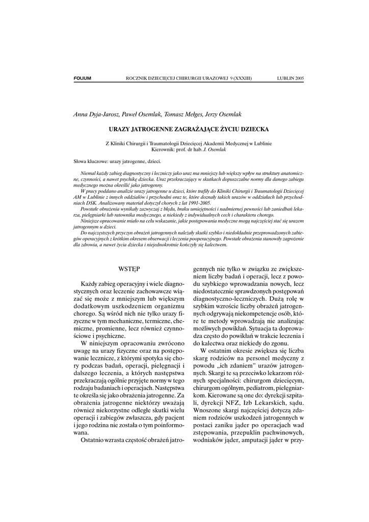 FOLIUM ROCZNIKUrazy DZIECIĘCEJ CHIRURGII jatrogenne zagrażająceURAZOWEJ życiu dziecka9 (XXXIII) LUBLIN 2005 95 Anna Dyja-Jarosz, Paweł Osemlak, Tomasz Mełges, Jerzy Osemlak URAZY JATROGENNE ZAGRAŻAJĄCE ŻYCIU DZIECKA Z Kliniki Chirurgii i Traumatologii Dziecięcej Akademii Medycznej w Lublinie Kierownik: prof. dr hab. J. Osemlak Słowa kluczowe: urazy jatrogenne, dzieci. Niemal każdy zabieg diagnostyczny i leczniczy jako uraz ma mniejszy lub większy wpływ na struktury anatomiczne, czynności, a nawet psychikę dziecka. Uraz przekraczający w skutkach dopuszczalne normy dla danego zabiegu medycznego można określić jako jatrogenny. W pracy poddano analizie urazy jatrogenne u dzieci, które trafiły do Kliniki Chirurgii i Traumatologii Dziecięcej AM w Lublinie z innych oddziałów i przychodni oraz te, które doznały takich urazów w oddziałach lub przychodniach DSK. Analizowany materiał dotyczył chorych z lat 1991-2005. Powstałe obrażenia wynikały zazwyczaj z błędu, braku umiejętności i nadmiernej pewności lub zaniedbań lekarza, pielęgniarki lub ratownika medycznego, a niekiedy z indywidualnych cech i charakteru chorego. Niniejsze opracowanie miało na celu wskazanie, jakie postępowania medyczne mogą najczęściej stać się urazem jatrogennym u dzieci. Do najczęstszych przyczyn obrażeń jatrogennych należały skutki szybko i niedokładnie przeprowadzonych zabiegów operacyjnych z krótkim okresem obserwacji i leczenia pooperacyjnego. Powstałe obrażenia stanowiły zagrożenie dla zdrowia, a nawet życia dziecka i niejednokrotnie kończyły się kalectwem. WSTĘP Każdy zabieg operacyjny i wiele diagnostycznych oraz leczenie zachowawcze wiązać się może z mniejszym lub większym dodatkowym uszkodzeniem organizmu chorego. Są wśród nich nie tylko urazy fizyczne w tym mechaniczne, termiczne, chemiczne, promienne, lecz również czynnościowe i psychiczne. W niniejszym opracowaniu zwrócono uwagę na urazy fizyczne oraz na postępowanie lecznicze, z którymi spotyka się chory podczas badań, operacji, pielęgnacji i dalszego leczenia, a których następstwa przekraczają ogólnie przyjęte normy w tego rodzaju badaniach i operacjach. Następstwa te określa się jako obrażenia jatrogenne. Za obrażenia jatrogenne niektórzy uważają również niekorzystne odległe skutki wielu operacji i zabiegów zwłaszcza, gdy pacjent i jego rodzina nie została o tym poinformowana. Ostatnio wzrasta częstość obrażeń jatro- gennych nie tylko w związku ze zwiększeniem liczby badań i operacji, lecz z powodu szybkiego wprowadzania nowych, lecz niedostatecznie sprawdzonych postępowań diagnostyczno-leczniczych. Dużą rolę w szybkim wzroście liczby obrażeń jatrogennych odgrywają niekompetencje osób, które te metody wprowadzają nie analizując możliwych powikłań. Sytuacja ta doprowadza często do powikłań w trakcie leczenia i do kalectwa oraz niekiedy do zgonu. W ostatnim okresie zwiększa się liczba skarg rodziców na personel medyczny z powodu „ich zdaniem” urazów jatrogennych. Skargi te są przeciwko lekarzom różnych specjalności: chirurgom dziecięcym, chirurgom ogólnym, pediatrom, pielęgniarkom. Kierowane są one do: dyrekcji szpitali, dyrekcji NFZ, Izb Lekarskich, sądu. Wnoszone skargi najczęściej dotyczą zdaniem rodziców uszkodzeń jatrogennych w postaci zaniku jąder po operacjach wad zstępowania, przepuklin pachwinowych, wodniaków jąder, amputacji jąder w przy- 96 A. Dyja-Jarosz, P. Osemlak, T. Mełges, J. Osemlak padkach późno rozpoznanego skrętu i martwicy, operacji stulejki, powikłań po operacjach usunięcia wyrostka robaczkowego, niepomyślnych repozycji złamanych kości, niepomyślnych wyników leczenia krwiaków, stłuczeń i obrzęku mózgu, powikłań po wstrzyknięciach leków oraz oparzeń zaistniałych w szpitalu z winy personelu, jak również uszkodzeń nerwów, naczyń i innych narządów powodujących zaburzenia ich funkcji [1, 2, 3, 4, 5, 6, 7]. Obserwując wzrost liczby dzieci z obrażeniami jatrogennymi, które trafiły do Kliniki Chirurgii i Traumatologii Dziecięcej w Lublinie przeprowadzono analizę tych przypadków celem określenia rozmiaru problemu i stopnia zagrożeń oraz profilaktyki. MATERIAŁ I METODA Badania dotyczyły chorych leczonych w Klinice Chirurgii i Traumatologii DSK AM w Lublinie od 1991 do 2005 roku. Przedstawiono przykłady obrażeń jatrogennych u dzieci, które zaistniały w szpitalach i przychodniach pozaklinicznych, prywatnych „centrach” i „klinikach”, jak również w Dziecięcym Szpitalu Klinicznym. Zwrócono uwagę na ich okoliczności, leczenie i następstwa celem opracowania wniosków profilaktyczno-leczniczych w stosunku do dziecka oraz lekarzy i pielęgniarek, dyrekcji szpitali i właścicieli prywatnych zakładów medycznych, jak również ubezpieczycieli (NFZ). WYNIKI BADAŃ W ciągu ostatnich piętnastu lat trafiło do kliniki i przychodni przyklinicznej z powodu stanu po urazach jatrogennych 126 dzieci − przeciętnie 8-ro rocznie. W ostatnich latach z powodu urazów jatrogennych obserwuje się wzrost liczby tych przypadków. W DSK do obrażeń jatrogennych doszło w tym okresie przeciętnie 1 raz w roku, z tym że były one mniej groźne niż obrażenia z zewnątrz. W opracowaniu przedstawiono pojedyncze przykłady urazów jatrogennych. W większości były to urazy spowodowane przez lekarzy − 96 przypadków, znacznie rzadziej przez pielęgniarki 25 przypadków i 5 przez innych pracowników medycznych. OPIS PRZYPADKÓW Przypadek 1 Chłopiec 2-letni został przyjęty do Kliniki ze względu na hipoplazję i zanik lewego jądra. Prenatalnie przy pomocy USG i po porodzie stwierdzono, że jądro lewe było prawidłowe, natomiast po stronie prawej rozpoznano wodniaka jądra. Po urodzeniu dziecko było pod obserwacją lekarza rodzinnego i kontrolą USG. Jądro lewe znajdowało się w dalszej części kanału pachwinowego uciśnięte przez wodniaka praweg