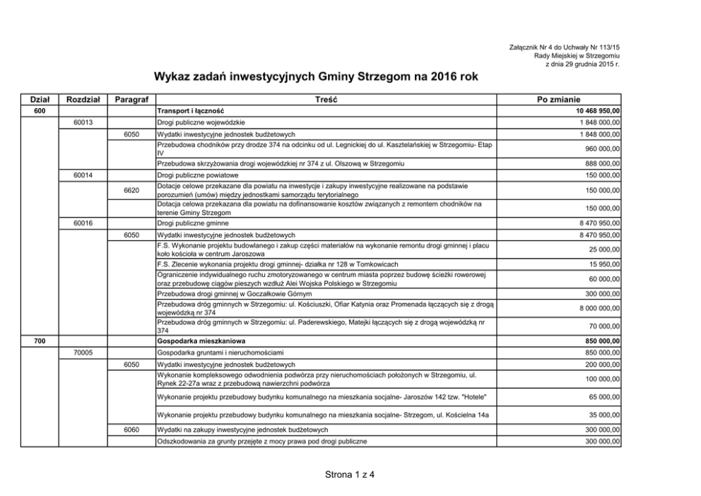 Załącznik Nr 4 do Uchwały Nr 113/15 Rady Miejskiej w Strzegomiu z dnia 29 grudnia 2015 r. Wykaz zadań inwestycyjnych Gminy Strzegom na 2016 rok Dział Rozdział Treść Paragraf Transport i łączność 600 60013 6050 60014 6620 60016 6050 10 468 950,00 Drogi publiczne wojewódzkie 1 848 000,00 Wydatki inwestycyjne jednostek budżetowych 1 848 000,00 Przebudowa chodników przy drodze 374 na odcinku od ul. Legnickiej do ul. Kasztelańskiej w Strzegomiu- Etap IV 960 000,00 Przebudowa skrzyżowania drogi wojewódzkiej nr 374 z ul. Olszową w Strzegomiu 888 000,00 Drogi publiczne powiatowe 150 000,00 Dotacje celowe przekazane dla powiatu na inwestycje i zakupy inwestycyjne realizowane na podstawie porozumień (umów) między jednostkami samorządu terytorialnego Dotacja celowa przekazana dla powiatu na dofinansowanie kosztów związanych z remontem chodników na terenie Gminy Strzegom 6050 6060 150 000,00 8 470 950,00 Wydatki inwestycyjne jednostek budżetowych 8 470 950,00 F.S. Wykonanie projektu budowlanego i zakup części materiałów na wykonanie remontu drogi gminnej i placu koło kościoła w centrum Jaroszowa 25 000,00 F.S. Zlecenie wykonania projektu drogi gminnej- działka nr 128 w Tomkowicach 15 950,00 Ograniczenie indywidualnego ruchu zmotoryzowanego w centrum miasta poprzez budowę ścieżki rowerowej oraz przebudowę ciągów pieszych wzdłuż Alei Wojska Polskiego w Strzegomiu 60 000,00 300 000,00 Przebudowa dróg gminnych w Strzegomiu: ul. Kościuszki, Ofiar Katynia oraz Promenada łączących się z drogą wojewódzką nr 374 Przebudowa dróg gminnych w Strzegomiu: ul. Paderewskiego, Matejki łączących się z drogą wojewódzką nr 374 70005 150 000,00 Drogi publiczne gminne Przebudowa drogi gminnej w Goczałkowie Górnym 700 Po zmianie 8 000 000,00 70 000,00 Gospodarka mieszkaniowa 850 000,00 Gospodarka gruntami i nieruchomościami 850 000,00 Wydatki inwestycyjne jednostek budżetowych 200 000,00 Wykonanie kompleksowego odwodnienia podwórza przy nieruchomościach położonych w Strzegomiu, ul. Rynek 22-27a wraz z przebudową nawierzchni podwórza 100 000,00 Wykonanie projektu przebudowy budynku komunalnego na mieszkania socjalne- Jaroszów 142 tzw. "Hotele" 65 000,00 Wykonanie projektu przebudowy budynku komunalnego na mieszkania socjalne- Strzegom, ul. Kościelna 14a 35 000,00 Wydatki na zakupy inwestycyjne jednostek budżetowych 300 000,00 Odszkodowania za grunty przejęte z mocy prawa pod drogi publiczne 300 000,00 Strona 1 z 4 6660 710 71035 6050 Zwroty dotacji oraz płatności, w tym wykorzystanych niezgodnie z przeznaczeniem lub wykorzystanych z naruszeniem procedur, o których mowa w art. 184 ustawy, pobranych nienależnie lub w nadmiernej wysokości, dotyczące wydatków majątkowych. Zwrot środków z dotacji inwestycyjnej na projekt "Rewitalizacja centrum miasta Strzegomia- Przebudowa ze zmianą sposobu użytkowania budynku poklasztornego przy ul. Kościuszki w Strzegomiu" 210 000,00 Cmentarze 210 000,00 Wydatki inwestycyjne jednostek budżetowych 210 000,00 Modernizacja alejek na cmentarzach komunalnych 6800 801 80101 6050 80104 6050 6060 80110 6050 852 85219 6060 20 000,00 Różne rozliczenia 400 000,00 Rezerwy ogólne i celowe 400 000,00 Rezerwy na inwestycje i zakupy inwestycyjne 400 000,00 Rezerwa celowa na remonty placówek oświatowych 400 000,00 Oświata i wychowanie 329 753,00 Szkoły podstawowe 269 373,00 Wydatki inwestycyjne jednostek budżetowych 269 373,00 Gwiezdne podwórko- centrum rekreacyjno-edukacyjne ul. Mickiewicza w Strzegomiu 269 373,00 Przedszkola 51 880,00 Wydatki inwestycyjne jednostek budżetowych 32 000,00 Budowa przedszkola z oddziałem żłobkowym przy ul. Kościuszki w Strzegomiu 32 000,00 F.S. Zakup urządzeń zabawowych na plac zabaw przy przedszkolu w Stanowicach 0,00 Zakup 2 taboretów gazowych PP nr 3 0,00 Zakup robota wielofunkcyjnego PP nr 2 0,00 Wydatki na zakupy inwestycyjne jednostek budżetowych 19 880,00 F.S. Zakup urządzeń zabawowych na plac zabaw przy przedszkolu w Stanowicach 7 380,00 Zakup 2 taboretów gazowych PP nr 3 7 500,00 Zakup robota wielofunkcyjnego PP nr 2 5 000,00 Gimnazja 8 500,00 Wydatki inwestycyjne jednostek budżetowych 0,00 Zakup kserokopiarki G2 6060 40 000,00 150 000,00 Remont- renowacja muru cmentarza w Strzegomiu przy ul. Świdnickiej 75818 350 000,00 Działalność usługowa Budowa cmentarza komunalnego w Goczałkowie- przygotowanie dokumentacji formalno-prawnej i technicznej 758 350 000,00 0,00 Wydatki na zakupy inwestycyjne jednostek budżetowych 8 500,00 Zakup kserokopiarki G2 8 500,00 Pomoc społeczna 15 000,00 Ośrodki pomocy społecznej 15 000,00 Wydatki na zakupy inwestycyjne jednostek budżetowych 15 000,00 Zakup serwera dla potrzeb Ośrodka Pomocy Społecznej w Strzegomiu 15 000,00 Strona 2 z 4 900 90001 6230 90015 6050 Gospodarka komunalna i ochrona środowiska 478 799,00 Gospodarka ściekowa i ochrona wód 150 000,00 Dotacje celowe z budżetu na finansowanie lub dofinansowanie kosztów realizacji inwestycji i zakupów inwestycyjnych jednostek nie zaliczanych do sektora finansów publicznych 150 000,00 Dotacja celowa na dofinansowanie kosztów podłączeń budynków do zbiorowego systemu kanalizacyjnego 150 000,00 Oświetlenie ulic, placów i dróg 209 000,00 Wydatki inwestycyjne jednostek budżetowych 209 000,00 F.S. Zakup i montaż lampy oświetleniowej w Granicznej 90095 6050 200 000,00 Pozostała działalność 119 799,00 Wydatki inwestycyjne jednostek budżetowych 37 700,00 F.S. Zakup i montaż urządzeń siłowni plenerowej i małej architektury w Strzegomiu 18 000,00 F.S. Zakup i montaż urządzeń siłowni plenerowej w Grochotowie 6060 12 500,00 F.S. Zakup i montaż urządzeń siłowni plenerowej w Rogoźnicy 3 700,00 F.S. Zakup sprzętu i urządzeń na doposażenie placu zabaw w Żelazowie 0,00 F.S. Zakup sprzętu i urządzeń zabawowych na plac zabaw w Modlęcinie 0,00 F.S. Zakup urządzeń zabawowych na plac zabaw w Rusku 0,00 Wydatki na zakupy inwestycyjne jednostek b