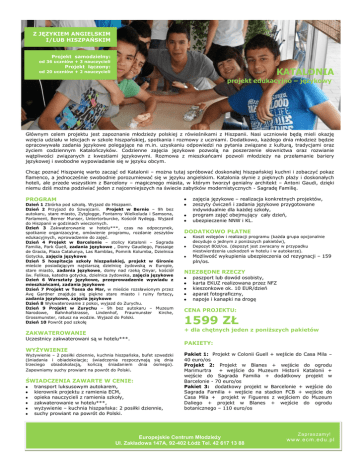 Z JĘZYKIEM ANGIELSKIM I/LUB HISZPAŃSKIM Projekt samodzielny: od 36 uczniów + 3 nauczycieli Projekt łączony: KATALONIA od 20 uczniów + 2 nauczycieli projekt edukacyjno – językowy Głównym celem projektu jest zapoznanie młodzieży polskiej z rówieśnikami z Hiszpanii. Nasi uczniowie będą mieli okazję wzięcia udziału w lekcjach w szkole hiszpańskiej, spotkania i rozmowy z uczniami. Dodatkowo, każdego dnia młodzież będzie opracowywała zadania językowe polegające na m.in. uzyskaniu odpowiedzi na pytania związane z kulturą, tradycjami oraz życiem codziennym Katalończyków. Codzienne zajęcia językowe pozwolą na poszerzenie słownictwa oraz rozwianie wątpliwości związanych z kwestiami językowymi. Rozmowa z mieszkańcami pozwoli młodzieży na przełamanie bariery językowej i swobodne wypowiadanie się w języku obcym. Chcąc poznać Hiszpanię warto zacząć od Katalonii – można tutaj spróbować doskonałej hiszpańskiej kuchni i zobaczyć pokaz flamenco, a jednocześnie swobodnie porozumiewać się w języku angielskim. Katalonia słynie z pięknych plaży i doskonałych hoteli, ale przede wszystkim z Barcelony – magicznego miasta, w którym tworzył genialny architekt – Antoni Gaudi, dzięki niemu dziś można podziwiać jeden z najcenniejszych na świecie zabytków modernistycznych - Sagradę Familię. PROGRAM Dzień 1 Zbiórka pod szkołą. Wyjazd do Hiszpanii. Dzień 2 Przyjazd do Szwajcarii. Projekt w Bernie – 9h bez autokaru, stare miasto, Zytglogge, Fontanny Wielkoluda i Samsona, Parlament, Berner Munser, Untertorburcke, Kościół Nydegg. Wyjazd do Hiszpanii w godzinach wieczornych. Dzień 3 Zakwaterowanie w hotelu***, czas na odpoczynek, spotkanie organizacyjne, omówienie programu, rozdanie zeszytów edukacyjnych, wprowadzenie do zajęć. Dzień 4 Projekt w Barcelonie – stolicy Katalonii – Sagrada Familia, Park Guell, zadania językowe , Domy Gaudiego, Passaige de Gracia, Plaza Catalunya, Las Ramblas, Pomnik Kolumba, Dzielnica Gotycka, zajęcia językowe Dzień 5 hospitacja szkoły hiszpańskiej, projekt w Gironie mieście posiadającym najstarszą dzielnicę żydowską w Europie, stare miasto, zadania językowe, domy nad rzeką Onyar, kościół św. Feliksa, katedra gotycka, dzielnica żydowska, zajęcia językowe Dzień 6 Warsztaty językowe, przeprowadzenie wywiadu z mieszkańcami, zadania językowe Dzień 7 Projekt w Tossa de Mar, w mieście rozsławionym przez Avę Gardner znajduje się piękne stare miasto i ruiny fortecy, zadania językowe, zajęcia językowe Dzień 8 Wykwaterowanie z pokoi, wyjazd do Zurychu. Dzień 9 Projekt w Zurychu – 9h bez autokaru – Muzeum Narodowe, Bahnhofstrasse, Lindenhof, Fraumunster Kirche, Grossmunster, ratusz na wodzie. Wyjazd do Polski. Dzień 10 Powrót pod szkołę zajęcia językowe – realizacja konkretnych projektów, zeszyty ćwiczeń i zadania językowe przygotowane indywidualnie dla każdej szkoły, program zajęć obejmujący cały dzień, ubezpieczenie NNW i KL. DODATKOWO PŁATNE Koszt wstępów i realizacji programu (każda grupa opcjonalnie decyduje o jednym z poniższych pakietów), Depozyt 80zł/os. (depozyt jest zwracany w przypadku niestwierdzenia uszkodzeń w hotelu i w autokarze). Możliwość wykupienia ubezpieczenia od rezygnacji – 159 pln/os. NIEZBĘDNE RZECZY paszport lub dowód osobisty, karta EKUZ realizowana przez NFZ kieszonkowe ok. 10 EUR/dzień aparat fotograficzny, napoje i kanapki na drogę CENA PROJEKTU: 1599 ZŁ + dla chętnych jeden z poniższych pakietów ZAKWATEROWANIE Uczestnicy zakwaterowani są w hotelu***. WYŻYWIENIE Wyżywienie – 2 posiłki dziennie, kuchnia hiszpańska, bufet szwedzki (śniadania i obiadokolacje; świadczenia rozpoczynają się dnia trzeciego obiadokolacją, kończą śniadaniem dnia ósmego). Zapewniamy suchy prowiant na powrót do Polski. ŚWIADCZENIA ZAWARTE W CENIE: transport luksusowym autokarem, kierownik projektu z ramienia ECM, opieka nauczycieli z ramienia szkoły, zakwaterowanie w hotelu***, wyżywienie – kuchnia hiszpańska: 2 posiłki dziennie, suchy prowiant na powrót do Polski. PAKIETY: Pakiet 1: Projekt w Colonii Guell + wejście do Casa Mila – 40 euro/os Projekt 2: Projekt w Blanes + wejście do ogrodu Marimurtra + wejście do Muzeum Historii Katalonii + wejście do Sagrada Familia + dodatkowy projekt w Barcelonie - 70 euro/os Pakiet 3: dodatkowy projekt w Barcelonie + wejście do Sagrada Familia + wejście na stadion FCB + wejście do Casa Mila + projekt w Figueres z wejściem do Muzeum Daliego + projekt w Blanes + wejście do ogrodu botanicznego – 110 euro/os Europejskie Centrum Młodzieży Ul. Zakładowa 147A, 92-402 Łódź Tel. 42 617 13 88 Z apras zam y! www.ecm.edu.pl