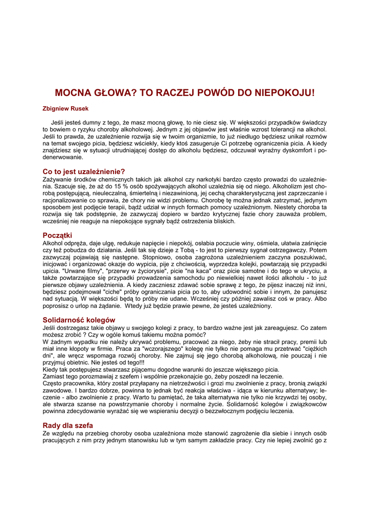 MOCNA GŁOWA? TO RACZEJ POWÓD DO NIEPOKOJU! Zbigniew Rusek Jeśli jesteś dumny z tego, Ŝe masz mocną głowę, to nie ciesz się. W większości przypadków świadczy to bowiem o ryzyku choroby alkoholowej. Jednym z jej objawów jest właśnie wzrost tolerancji na alkohol. Jeśli to prawda, Ŝe uzaleŜnienie rozwija się w twoim organizmie, to juŜ niedługo będziesz unikał rozmów na temat swojego picia, będziesz wściekły, kiedy ktoś zasugeruje Ci potrzebę ograniczenia picia. A kiedy znajdziesz się w sytuacji utrudniającej dostęp do alkoholu będziesz, odczuwał wyraźny dyskomfort i podenerwowanie. Co to jest uzaleŜnienie? ZaŜywanie środków chemicznych takich jak alkohol czy narkotyki bardzo często prowadzi do uzaleŜnienia. Szacuje się, Ŝe aŜ do 15 % osób spoŜywających alkohol uzaleŜnia się od niego. Alkoholizm jest chorobą postępującą, nieuleczalną, śmiertelną i niezawinioną, jej cechą charakterystyczną jest zaprzeczanie i racjonalizowanie co sprawia, Ŝe chory nie widzi problemu. Chorobę tę moŜna jednak zatrzymać, jedynym sposobem jest podjęcie terapii, bądź udział w innych formach pomocy uzaleŜnionym. Niestety choroba ta rozwija się tak podstępnie, Ŝe zazwyczaj dopiero w bardzo krytycznej fazie chory zauwaŜa problem, wcześniej nie reaguje na niepokojące sygnały bądź ostrzeŜenia bliskich. Początki Alkohol odpręŜa, daje ulgę, redukuje napięcie i niepokój, osłabia poczucie winy, ośmiela, ułatwia zaśnięcie czy teŜ pobudza do działania. Jeśli tak się dzieje z Tobą - to jest to pierwszy sygnał ostrzegawczy. Potem zazwyczaj pojawiają się następne. Stopniowo, osoba zagroŜona uzaleŜnieniem zaczyna poszukiwać, inicjować i organizować okazje do wypicia, pije z chciwością, wyprzedza kolejki, powtarzają się przypadki upicia. "Urwane filmy", "przerwy w Ŝyciorysie", picie "na kaca" oraz picie samotne i do tego w ukryciu, a takŜe powtarzające się przypadki prowadzenia samochodu po niewielkiej nawet ilości alkoholu - to juŜ pierwsze objawy uzaleŜnienia. A kiedy zaczniesz zdawać sobie sprawę z tego, Ŝe pijesz inaczej niŜ inni, będziesz podejmował "ciche" próby ograniczania picia po to, aby udowodnić sobie i innym, Ŝe panujesz nad sytuacją. W większości będą to próby nie udane. Wcześniej czy później zawalisz coś w pracy. Albo poprosisz o urlop na Ŝądanie. Wtedy juŜ będzie prawie pewne, Ŝe jesteś uzaleŜniony. Solidarność kolegów Jeśli dostrzegasz takie objawy u swojego kolegi z pracy, to bardzo waŜne jest jak zareagujesz. Co zatem moŜesz zrobić ? Czy w ogóle komuś takiemu moŜna pomóc? W Ŝadnym wypadku nie naleŜy ukrywać problemu, pracować za niego, Ŝeby nie stracił pracy, premii lub miał inne kłopoty w firmie. Praca za "wczorajszego" kolegę nie tylko nie pomaga mu przetrwać "cięŜkich dni", ale wręcz wspomaga rozwój choroby. Nie zajmuj się jego chorobą alkoholową, nie pouczaj i nie przyjmuj obietnic. Nie jesteś od tego!!! Kiedy tak postępujesz stwarzasz pijącemu dogodne warunki do jeszcze większego picia. Zamiast tego porozmawiaj z szefem i wspólnie przekonajcie go, Ŝeby poszedł na leczenie. Często pracownika, który został przyłapany na nietrzeźwości i grozi mu zwolnienie z pracy, bronią związki zawodowe. I bardzo dobrze, powinna to jednak być reakcja właściwa - idąca w kierunku alternatywy; leczenie - albo zwolnienie z pracy. Warto tu pamiętać, Ŝe taka alternatywa nie tylko nie krzywdzi tej osoby, ale stwarza szanse na powstrzymanie choroby i normalne Ŝycie. Solidarność kolegów i związkowców powinna zdecydowanie wyraŜać się we wspieraniu decyzji o bezzwłocznym podjęciu leczenia. Rady dla szefa Ze względu na przebieg choroby osoba uzaleŜniona moŜe stanowić zagroŜenie dla siebie i innych osób pracujących z nim przy jednym stanowisku lub w tym samym zakładzie pracy. Czy nie lepiej zwolnić go z pracy? NIE! Warto wiedzieć, Ŝe chorobę alkoholową moŜna leczyć. Wiele osób podejmujących i kończących terapię oraz utrzymujących kontakt z grupami samopomocowymi utrzymuje trwałą abstynencję. Osoba uzaleŜniona, jeśli jest trzeźwa, jest równie wydajnym i kompetentnym pracownikiem jak ktoś, kto nie jest uzaleŜniony. Szkolenie i przyuczanie nowego pracownika jest droŜsze i bardziej czasochłonne niŜ leczenie uzaleŜnionego. Z drugiej strony ukrywanie problemu moŜe stwarzać zagroŜenie dla innych pracowników i sprzyjać dalszemu rozwojowi choroby alkoholowej. Dlatego niezwykle waŜne są działania mające na celu szybkie reagowanie na sygnały mogące wskazywać na istniejący problem. DuŜą rolę moŜe mieć właściwa reakcja przełoŜonego w pracy. Szef jest bowiem osobą do której ma się duŜe zaufanie. Utrata pracy dla osoby uzaleŜnionej to początek procesu wykluczenia społecznego. To często sprawa Ŝycia i śmierci. Dlatego teŜ w sytuacji, kiedy zauwaŜasz jakieś niepokojące sygnały to powinieneś właściwie zareagować. Ty jako szef zwracaj szczególna uwagę, kiedy Twój pracownik: " " " " " " " " " " często przychodzi do pracy "wczorajszy", często bierze pojedyncze dni wolnego, często korzysta ze zwolnienia lekarskiego, szczególnie po weekendach, spóźnia się do pracy lub wcześniej wychodzi ma trudności z koncentracją, z zapamiętywaniem obowiązków jest nietrzeźwy w pracy, ma okresy, kiedy pracuje efektywnie i okresy tzw. "migania się", przeŜywa zmienne nastroje, pogarsza się jego wygląd trzęsie się, nadmiernie pije napoje To moŜe to oznaczać, Ŝe ma problem z alkoholem !!! Art. 52 Kodeksu Pracy … ale … Zgłoś problem do bezpośredniego przełoŜonego lub do wyspecjalizowanego pracownika działu kadr. Taka osoba moŜe podjąć interwencję związaną z pomocą osobie uzaleŜnionej. Jeśli nie ma w Twoim zakładzie pracy takiej osoby, to warto skonsultować taki przypadek z najbliŜszą poradnią terapii uzaleŜnień. Osoby uzaleŜnionej nie trzeba pozbawiać pracy