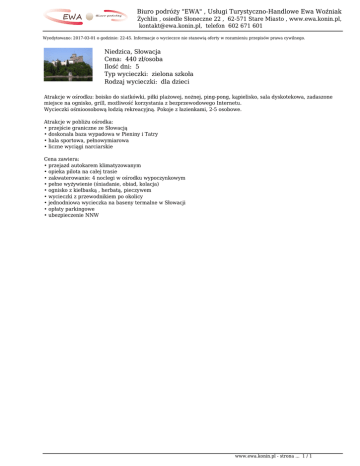 Biuro podróży "EWA" , Usługi Turystyczno-Handlowe Ewa Woźniak Żychlin , osiedle Słoneczne 22 , 62-571 Stare Miasto , www.ewa.konin.pl, [email protected], telefon 602 671 601 Wyedytowano: 2017-03-01 o godzinie: 22-45. Informacje o wycieczce nie stanowią oferty w rozumieniu przepisów prawa cywilnego. Niedzica, Słowacja Cena: 440 zł/osoba Ilość dni: 5 Typ wycieczki: zielona szkoła Rodzaj wycieczki: dla dzieci Atrakcje w ośrodku: boisko do siatkówki, piłki plażowej, nożnej, ping-pong, kąpielisko, sala dyskotekowa, zadaszone miejsce na ognisko, grill, możliwość korzystania z bezprzewodowego Internetu. Wycieczki ośmioosobową łodzią rekreacyjną. Pokoje z łazienkami, 2-5 osobowe. Atrakcje w pobliżu ośrodka: • przejście graniczne ze Słowacją • doskonała baza wypadowa w Pieniny i Tatry • hala sportowa, pełnowymiarowa • liczne wyciągi narciarskie Cena zawiera: • przejazd autokarem klimatyzowanym • opieka pilota na całej trasie • zakwaterowanie: 4 noclegi w ośrodku wypoczynkowym • pełne wyżywienie (śniadanie, obiad, kolacja) • ognisko z kiełbaską , herbatą, pieczywem • wycieczki z przewodnikiem po okolicy • jednodniowa wycieczka na baseny termalne w Słowacji • opłaty parkingowe • ubezpieczenie NNW www.ewa.konin.pl - strona ... 1 / 1