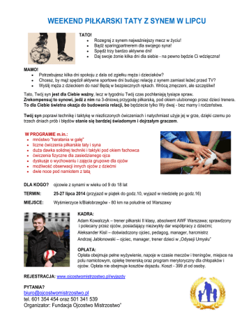 WEEKEND PIŁKARSKI TATY Z SYNEM W LIPCU TATO! MAMO! Rozegraj z synem najważniejszy mecz w życiu! Bądź sparingpartnerem dla swojego syna! Spędź trzy bardzo aktywne dni! Daj swoje żonie kilka dni dla siebie - na pewno będzie Ci wdzięczna! Potrzebujesz kilka dni spokoju z dala od zgiełku męża i dzieciaków? Chcesz, by mąż spędził aktywne sportowe dni budując relację z synem zamiast leżeć przed TV? Wyślij męża z dzieckiem do nas! Będą w bezpiecznych rękach. Wrócą zmęczeni, ale szczęśliwi! Tato, Twój syn jest dla Ciebie ważny, lecz w tygodniu Twój czas pochłaniają tysiące spraw. Zrekompensuj to synowi, jedź z nim na 3-dniową przygodę piłkarską, pod okiem ulubionego przez dzieci trenera. To dla Ciebie świetna okazja do budowania relacji, bo będziecie tylko Wy dwaj - bez mamy i rodzeństwa. Twój syn poprawi technikę i taktykę w niezliczonych ćwiczeniach i natychmiast użyje jej w grze, dzięki czemu po trzech dniach prób i błędów stanie się bardziej świadomym i dojrzałym graczem. W PROGRAMIE m.in.: mnóstwo "haratania w gałę" liczne ćwiczenia piłkarskie taty i syna duża dawka solidnej techniki i taktyki pod okiem fachowca ćwiczenia fizyczne dla zasiedzianego ojca dyskusje o wychowaniu i zajęcia grupowe dla ojców możliwość obserwacji innych ojców z dziećmi dwie noce pod namiotem z tatą DLA KOGO? ojcowie z synami w wieku od 9 do 18 lat TERMIN: 25-27 lipca 2014 (przyjazd w piątek do godz.10, wyjazd w niedzielę po godz.16) MIEJSCE: Wyśmierzyce k/Białobrzegów - 80 km na południe od Warszawy KADRA: Adam Kowalczyk – trener piłkarski II klasy, absolwent AWF Warszawa; sprawdzony i polecany przez ojców, posiadający niezwykły dar współpracy z dziećmi; Aleksander Kisil – doświadczony ojciec, pedagog, manager, harcmistrz Andrzej Jabłonowski – ojciec, manager, trener dzieci w „Odyseji Umysłu” OPŁATA: Opłata obejmuje pełne wyżywienie, napoje w czasie meczów i treningów, miejsce na polu namiotowym, opiekę trenerską oraz program merytoryczny dla chłopaków i ojców. Opłata nie obejmuje kosztów dojazdu. Koszt - 399 zł od osoby. REJESTRACJA: www.ojcostwomistrzostwo.pl/wyjazdy PYTANIA? [email protected] tel. 601 354 454 oraz 501 341 539 Organizator: Fundacja Ojcostwo Mistrzostwo”
