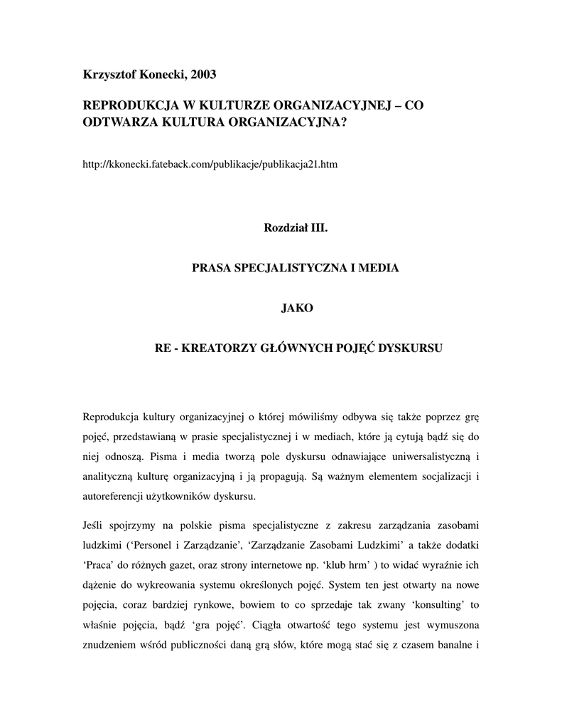 Krzysztof Konecki, 2003 REPRODUKCJA W KULTURZE ORGANIZACYJNEJ – CO ODTWARZA KULTURA ORGANIZACYJNA? http://kkonecki.fateback.com/publikacje/publikacja21.htm Rozdział III. PRASA SPECJALISTYCZNA I MEDIA JAKO RE KREATORZY GŁÓWNYCH POJĘĆ DYSKURSU Reprodukcja kultury organizacyjnej o której mówiliśmy odbywa się także poprzez grę pojęć, przedstawianą w prasie specjalistycznej i w mediach, które ją cytują bądź się do niej odnoszą. Pisma i media tworzą pole dyskursu odnawiające uniwersalistyczną i analityczną kulturę organizacyjną i ją propagują. Są ważnym elementem socjalizacji i autoreferencji użytkowników dyskursu. Jeśli spojrzymy na polskie pisma specjalistyczne z zakresu zarządzania zasobami ludzkimi (‘Personel i Zarządzanie’, ‘Zarządzanie Zasobami Ludzkimi’ a także dodatki ‘Praca’ do różnych gazet, oraz strony internetowe np. ‘klub hrm’ ) to widać wyraźnie ich dążenie do wykreowania systemu określonych pojęć. System ten jest otwarty na nowe pojęcia, coraz bardziej rynkowe, bowiem to co sprzedaje tak zwany ‘konsulting’ to właśnie pojęcia, bądź ‘gra pojęć’. Ciągła otwartość tego systemu jest wymuszona znudzeniem wśród publiczności daną grą słów, które mogą stać się z czasem banalne i wyświechtane. Rynek potrzebuje nowości, a doradcze pisma i konsultanci są przecież kreatywni i mogą w nowy i niekonwencjonalny sposób nazwać stare zjawiska i metody, wytwarzając nowe pojęcia i systemy pojęć, tworząc jednocześnie nowe opakowania dla starych idei. Pisma uczestniczą też w organizacji różnych konkursów propagujących idee ‘proefektywnościowej kultury organizacyjnej’, np. ‘Lider Zarządzania Zasobami Ludzkimi’, posiadają miejsce na wypowiedzi dyrektorów personalnych (patrz pismo ‘Zarządzanie Zasobami Ludzkimi’ dział ‘Forum Liderów’). Te praktyki są forum reprodukcji określonego wzorca kultury organizacyjnej. Pisma, jak i teoretyczne oraz naukowo badawcze prace na temat zarządzania zasobami ludzkimi i kultury organizacyjnej pokazują nam binarne opozycje pomiędzy określonymi pojęciami i współtworzą określony dyskurs (por. Townley 1998, s. 191 – 192, Townley 1994; zob. także Foucault 1998): proefektywnościowa kultura organizacyjna – kultura antyefektywnosciowa, kultura pozytywna – kultura negatywna, kultura zachowawcza – kultura innowacyjna, kultura męska – kultura kobieca, kultura indywidualistyczna – kultura kolektywistyczna, kultura elitarna – kultura egalitarna, wewnątrzsterowna – zewnątrzsterowna, sterowanie – odpowiedzialność, miękki model ZZL – twardy model ZZL, itp. (por. Zbiegień – Maciąg 1999, s. 52 – 76; Mastenbroek 1996). Jedna strona opozycji jest zwykle uprzywilejowana przez autorów tych pojęć. Często typologie służą do diagnozowania kultury, bez wnikania w głąb kultury odpowiednio zdiagnozowanej. Jednak istota kultury organizacyjnej nie tkwi w jej powierzchniowym oglądzie, ale w tym jak głęboko schodzi ona w dół do jednostek, do podmiotowości i działań wynikających z jej charakteru. Zarządzanie ludźmi dokonuje się za pomocą procedur rekrutacji i selekcji, ocen pracowniczych, szkoleń, wartościowania pracy, rankingów, itp. Procedury te im bardziej szczegółowo są opracowane i bardziej kwantyfikowalne tym więcej wydobywają wiedzy o człowieku / pracowniku i zbiorach pracowników. Dzięki tej wiedzy można tworzyć taksonomie i kwalifikować pracowników do określonych typów (np. typy osobowości, typy postaw, typy głównych motywatorów, typy pracowników wg stopnia ich efektywności) a także diagnozować ich nasycenie ilościowe poszczególnymi jednostkami obliczeniowymi. Pracownicy, skonstruowani jako ‘homonkulusy’, stają się w konsekwencji przewidywalni w swoich zachowaniach. ZZL pozwala ‘głęboko sięgać’ do świadomości, cielesności i kontekstu działań, zatrudnionych pracowników (por. Townley 1998, s. 195). Motywy zachowań, zaangażowanie pracowników staje się czytelne, a wiedza o nich jawna i jednocześnie policzalna, umożliwiająca efektywne zarządzanie pracownikami (ich przewidywalność a zatem i kontrolę zachowań). Pragnienie poznania dogłębnego pracowników jest jednym z głównych celów nowoczesnego zarządzania, w tym ZZL. Jest to cel często ukryty, co nie znaczy, że jest tematem tabu. Jest na pewno celem realizowanym (a nawet wartością realizowaną). Dogłębność działań zarządczych ma charakter totalny (całościowy), szczególnie jest to widoczne w tzw. ‘totalnym zarządzaniu jakością’ (TQM), gdzie systematyczny pomiar, proces standaryzacji, procedury benchmarkingu a także rankingów, odgrywają dominującą rolę (tamże, s. 198). Wszystko to ma dyscyplinować pracowników i porządkować ich zachowania en bloc (por. Foucault 1998, s. 129 220). Na poziomie indywidualnym stosowane są ‘technologie ja’. Jednostka poddawana jest egzaminom np. w procesie selekcji lub szkoleń, często w ocenach pracowniczych (assesment centers), oraz uczestniczy w różnego rodzaju spowiedziach (ankiety w sondażach satysfakcji pracowników, badania osobowości, rozmowy oceniające, samoocena; por. także Findlay, Newton 1998; zob. Szybisz 2002). Jednostka odkrywa wtedy samą siebie dla siebie, uzyskuje wiedzę o sobie, ponadto wiedza ta staje się dostępna dla znaczących osób w organizacji. Centrum władzy nie znika tutaj, mimo rozproszenia władzy w wielu procedurach stosowanych wobec pracowników w przestrzeni organizacyjnej. Wiedza jest generowana głównie dla menedżmentu, choć dzięki tym mikro – technologiom jest bardziej rozproszona, a cel jej użycia dokładniej ukryty. Sposób generowania tej wiedzy jest określony i uzasadniony autorytetem nauki, a konkretniej uczelni wyższych. Techniki dyscyplinowania pracowników umożliwiają zarządzanie wielkimi zbiorowościami, w naszym przypadku organizacjami. ‘Dyscypliny winny t