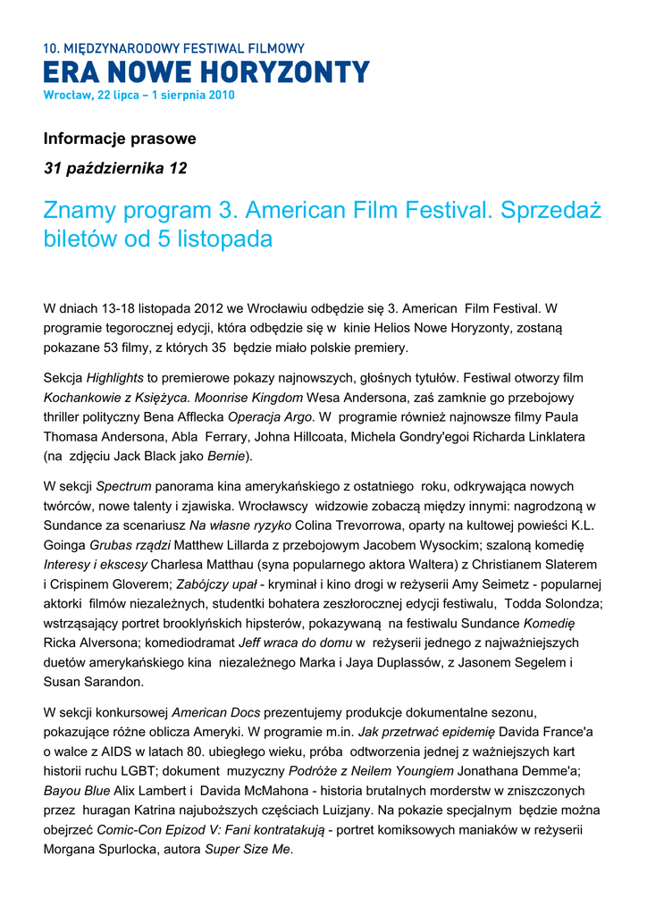 Informacje prasowe 31 października 12 Znamy program 3. American Film Festival. Sprzedaż biletów od 5 listopada W dniach 13-18 listopada 2012 we Wrocławiu odbędzie się 3. American Film Festival. W programie tegorocznej edycji, która odbędzie się w kinie Helios Nowe Horyzonty, zostaną pokazane 53 filmy, z których 35 będzie miało polskie premiery. Sekcja Highlights to premierowe pokazy najnowszych, głośnych tytułów. Festiwal otworzy film Kochankowie z Księżyca. Moonrise Kingdom Wesa Andersona, zaś zamknie go przebojowy thriller polityczny Bena Afflecka Operacja Argo. W programie również najnowsze filmy Paula Thomasa Andersona, Abla Ferrary, Johna Hillcoata, Michela Gondry'egoi Richarda Linklatera (na zdjęciu Jack Black jako Bernie). W sekcji Spectrum panorama kina amerykańskiego z ostatniego roku, odkrywająca nowych twórców, nowe talenty i zjawiska. Wrocławscy widzowie zobaczą między innymi: nagrodzoną w Sundance za scenariusz Na własne ryzyko Colina Trevorrowa, oparty na kultowej powieści K.L. Goinga Grubas rządzi Matthew Lillarda z przebojowym Jacobem Wysockim; szaloną komedię Interesy i ekscesy Charlesa Matthau (syna popularnego aktora Waltera) z Christianem Slaterem i Crispinem Gloverem; Zabójczy upał - kryminał i kino drogi w reżyserii Amy Seimetz - popularnej aktorki filmów niezależnych, studentki bohatera zeszłorocznej edycji festiwalu, Todda Solondza; wstrząsający portret brooklyńskich hipsterów, pokazywaną na festiwalu Sundance Komedię Ricka Alversona; komediodramat Jeff wraca do domu w reżyserii jednego z najważniejszych duetów amerykańskiego kina niezależnego Marka i Jaya Duplassów, z Jasonem Segelem i Susan Sarandon. W sekcji konkursowej American Docs prezentujemy produkcje dokumentalne sezonu, pokazujące różne oblicza Ameryki. W programie m.in. Jak przetrwać epidemię Davida France'a o walce z AIDS w latach 80. ubiegłego wieku, próba odtworzenia jednej z ważniejszych kart historii ruchu LGBT; dokument muzyczny Podróże z Neilem Youngiem Jonathana Demme'a; Bayou Blue Alix Lambert i Davida McMahona - historia brutalnych morderstw w zniszczonych przez huragan Katrina najuboższych częściach Luizjany. Na pokazie specjalnym będzie można obejrzeć Comic-Con Epizod V: Fani kontratakują - portret komiksowych maniaków w reżyserii Morgana Spurlocka, autora Super Size Me. Sekcja filmów eksperymentalnych On the Edge zaprezentuje m.in. V/H/S - pięć nowelek bawiących się konwencją horroru i retro-nostalgicznym urokiem nośnika VHS, których reżyserią zajęli się między innymi znani festiwalowej publiczności Joe Swanberg i Adam Wingard. Gościem festiwalu i bohaterem retrospektywy będzie Jerry Schatzberg - twórca legendarnych filmów z początku lat 70.: Narkomanów z Alem Pacino i Stracha na wróble z Pacino i Genem Hackmanem. Podczas 3. AFF zobaczymy również cztery najważniejsze filmy legendy i outsidera Hollywoodu Nicholasa Raya. Bohaterem retrospektywy będzie Wes Anderson, jeden z najbardziej ekscentrycznych autorów amerykańskiego kina, twórca Genialnego klanu i Pociągu do Darjeeling. Na bezpłatnych seansach zobaczymy pierwsze cztery odcinki cieszącej się coraz większą popularnością produkcji HBO Dziewczyny. Film już stał się manifestem pokolenia młodych Amerykanek. Wydarzeniem specjalnym festiwalu będzie organizowany wspólnie z festiwalem Jazztopad premierowy pokaz Wielkiej powodzi, najnowszego filmu jednego z najważniejszych współczesnych twórców awangardowych Billa Morrisona, z muzyką na żywo w wykonaniu Billa Frisella i zespołu. Karnety filmowe w sprzedaży do 5 listopada (bądź do wyczerpania puli). Sprzedaż biletów od 5 listopada na www.americanfilmfestival.pl i www.heliosnh.pl oraz w kasach kina Helios Nowe Horyzonty. Bilety wielokrotne do kupienia wyłącznie w kasach kina.