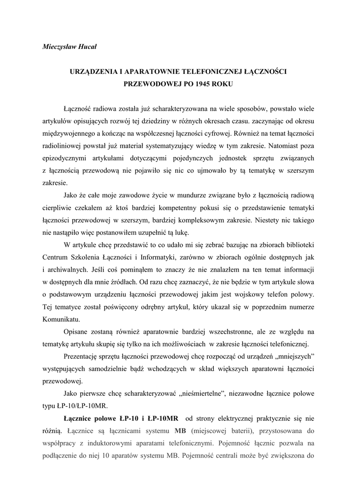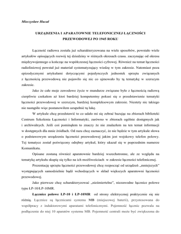 Mieczysław Hucał URZĄDZENIA I APARATOWNIE TELEFONICZNEJ ŁĄCZNOŚCI PRZEWODOWEJ PO 1945 ROKU Łączność radiowa została już scharakteryzowana na wiele sposobów, powstało wiele artykułów opisujących rozwój tej dziedziny w różnych okresach czasu. zaczynając od okresu międzywojennego a kończąc na współczesnej łączności cyfrowej. Również na temat łączności radioliniowej powstał już materiał systematyzujący wiedzę w tym zakresie. Natomiast poza epizodycznymi artykułami dotyczącymi pojedynczych jednostek sprzętu związanych z łącznością przewodową nie pojawiło się nic co ujmowało by tą tematykę w szerszym zakresie. Jako że całe moje zawodowe życie w mundurze związane było z łącznością radiową cierpliwie czekałem aż ktoś bardziej kompetentny pokusi się o przedstawienie tematyki łączności przewodowej w szerszym, bardziej kompleksowym zakresie. Niestety nic takiego nie nastąpiło więc postanowiłem uzupełnić tą lukę. W artykule chcę przedstawić to co udało mi się zebrać bazując na zbiorach biblioteki Centrum Szkolenia Łączności i Informatyki, zarówno w zbiorach ogólnie dostępnych jak i archiwalnych. Jeśli coś pominąłem to znaczy że nie znalazłem na ten temat informacji w dostępnych dla mnie źródłach. Od razu chcę zaznaczyć, że nie będzie w tym artykule słowa o podstawowym urządzeniu łączności przewodowej jakim jest wojskowy telefon polowy. Tej tematyce został poświęcony odrębny artykuł, który ukazał się w poprzednim numerze Komunikatu. Opisane zostaną również aparatownie bardziej wszechstronne, ale ze względu na tematykę artykułu skupię się tylko na ich możliwościach w zakresie łączności telefonicznej. Prezentację sprzętu łączności przewodowej chcę rozpocząć od urządzeń „mniejszych” występujących samodzielnie bądź wchodzących w skład większych aparatowni łączności przewodowej. Jako pierwsze chcę scharakteryzować „nieśmiertelne”, niezawodne łącznice polowe typu ŁP-10/ŁP-10MR. Łącznice polowe ŁP-10 i ŁP-10MR od strony elektrycznej praktycznie się nie różnią. Łącznice są łącznicami systemu MB (miejscowej baterii), przystosowana do współpracy z induktorowymi aparatami telefonicznymi. Pojemność łącznic pozwala na podłączenie do niej 10 aparatów systemu MB. Pojemność centrali może być zwiększona do dwudziestu numerów, przez podłączenie dwóch łącznic, które może obsługiwać jeden telefonista. Łącznica umożliwia: przyjęcie sygnału wywołania; wywołanie abonenta żądanego; zestawienie połączenia między dwoma abonentami; kontrolę trwania rozmowy; realizację połączeń okólnikowych; zdalne sterowanie radiostacją z aparatu TAI-43MR, TA-57, TAP-67; podłączenie aparatu słuchowego; podłączenie dzwonka sygnalizacyjnego; podłączenie drugiej łącznicy dla zwiększenia pojemności; Pierwsze egzemplarze łącznic ŁP-10 były montowane w obudowie drewnianej, później zaczęto stosować obudowy metalowe. Przenoszona była na pasie naramiennym bez dodatkowego opakowania. W łącznicach ŁP-10MR na czas przenoszenia i transportu zastosowano pokrowce brezentowe. Łącznica w obudowie drewnianej(z lewej) i metalowej(z prawej) Rzadko spotykaną była polowa łącznica typu ŁP-30 (PK-30). Pojemność łącznicy wynosiła 30 numerów, tzn. że do łącznicy można było dołączyć 30 induktorowych aparatów telefonicznych MB, lub tez 25 aparatów MB (gniazdka 1 - 25), 3 aparaty „brzęczykowe” (gniazdka 26 - 28) i dwie linie połączeniowe do central systemu CB - ręcznych (gniazdka 29 - 30). Maksymalnie można było jednocześnie realizować 10 połączeń. Przez dostawienie dodatkowych „bloków dodatkowych” można było zwiększyć pojemność łącznicy do 60 lub 90 abonentów. Łącznica PK-30 (ŁP-30)) Łącznice polowe ŁP-40 i ŁP-40MR były łącznicami systemu MB. Były przystosowane do współpracy innymi z łącznicami typu MB, induktorowymi aparatami telefonicznymi oraz centralami systemu CA i CB oraz radiostacjami. Do łącznicy można było podłączyć: 37 obwodów liniowych MB 3 obwody liniowe central CB lub CA, można je było wykorzystywać również jako obwody MB Łącznica umożliwiała m.in.: połączenia z centralami CA, CB lub MB połączenia tranzytowe połączenia dalekosiężne końcowe połączenia dowolnego abonenta łącznicy z innym abonentem połączenie czterech dowolnych abonentów na „okólnik” podłączenie do współpracy przystawki PW-10 obwodów dalekosiężnych podłączenie do współpracy drugiej łącznicy Łącznice te mogły funkcjonować samodzielnie, były również montowane jako wyposażenie większych aparatowni. Takim przykładem może być Aparatownia DUKAT oraz Ruchomy Węzeł Łączności RWŁ-1M. Aparatownie DUKAT funkcjonowały do końca lat 60-tych, była to centrale telefoniczna i telegraficzna wraz z innymi urządzeniami pomocniczymi zamontowana na nadwoziu samochodu „GAZ-63” z jedno-osiową przyczepą. Wyposażenie „części telefonicznej” stanowiła właśnie łącznica telefoniczna ŁP-40, urządzenia telefonii wielokrotnej półkomplecie TFc-1 i TFc-2 oraz 6 szt. aparatów telefonicznych TAI-43. Więcej informacji na temat tej aparatowni można znaleźć w artykule Lecha Kotlińskiego w Komunikacie nr 28. Aparatownia DUKAT (zdjęcie ze zbiorów K. Siebielskiego) W latach późniejszych funkcjonował Ruchomy Węzeł Łączności RWŁ-1M, który wyposażony był m.in. w łącznicę ŁP-40MR. Łącznica ŁP-40MR wewnątrz aparatowni RWŁ-1M Centrala telefoniczna P-198M1 zawierała ręczną łącznicę systemu CA/CB. Ogólna pojemność łącznicy wynosiła 100 numerów, przeznaczona była do uzyskiwania połączeń wewnętrznych i dalekosiężnych. Centrala była dostosowana do współpracy z innymi centralami telefonicznymi systemu MB, CB i automatycznymi. Centrala umożliwiała przyłączenie 100 dwuprzewodowych linii abonenckic