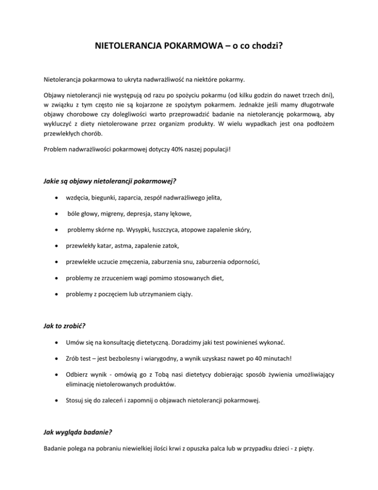 NIETOLERANCJA POKARMOWA – o co chodzi? Nietolerancja pokarmowa to ukryta nadwrażliwość na niektóre pokarmy. Objawy nietolerancji nie występują od razu po spożyciu pokarmu (od kilku godzin do nawet trzech dni), w związku z tym często nie są kojarzone ze spożytym pokarmem. Jednakże jeśli mamy długotrwałe objawy chorobowe czy dolegliwości warto przeprowadzić badanie na nietolerancję pokarmową, aby wykluczyć z diety nietolerowane przez organizm produkty. W wielu wypadkach jest ona podłożem przewlekłych chorób. Problem nadwrażliwości pokarmowej dotyczy 40% naszej populacji! Jakie są objawy nietolerancji pokarmowej? wzdęcia, biegunki, zaparcia, zespół nadwrażliwego jelita, bóle głowy, migreny, depresja, stany lękowe, problemy skórne np. Wysypki, łuszczyca, atopowe zapalenie skóry, przewlekły katar, astma, zapalenie zatok, przewlekłe uczucie zmęczenia, zaburzenia snu, zaburzenia odporności, problemy ze zrzuceniem wagi pomimo stosowanych diet, problemy z poczęciem lub utrzymaniem ciąży. Jak to zrobić? Umów się na konsultację dietetyczną. Doradzimy jaki test powinieneś wykonać. Zrób test – jest bezbolesny i wiarygodny, a wynik uzyskasz nawet po 40 minutach! Odbierz wynik - omówią go z Tobą nasi dietetycy dobierając sposób żywienia umożliwiający eliminację nietolerowanych produktów. Stosuj się do zaleceń i zapomnij o objawach nietolerancji pokarmowej. Jak wygląda badanie? Badanie polega na pobraniu niewielkiej ilości krwi z opuszka palca lub w przypadku dzieci - z pięty. W jakim wieku można przeprowadzić to badanie? Badanie przeprowadzamy u dzieci, które ukończyły 2 rok życia oraz u osób dorosłych. Co to jest Candida (Kandydoza)? To rozrost drożdżaka, obecnego w każdym organizmie, poprzez który rozwija się Kandydoza. Rozrost ten spowodowany jest przez zażywanie antybiotyków, doustnych środków antykoncepcyjnych, leków steroidowych, palenie tytoniu, nadmierne spożycie cukru. Najczęstsze objawy to: zmęczenie, ból głowy, mięśni i stawów, alergie, zaburzenia miesiączkowania i niepłodności, nawracające zapalenia pochwy, brak koncentracji, hipoglikemia i inne. Co to jest Celiakia? Osoby chorujące na Celiakię nie tolerują glutenu. Bardzo ważne jest wczesne wykrycie tej choroby gdyż spożywanie pokarmów zawierających gluten zwiększa ryzyko rozwoju nowotworów przewodu pokarmowego, a także wywołuje inne objawy, takie jak: utrata masy ciała, wymioty, zmęczenie, duszności, owrzodzenia jamy ustnej, niedokrwistość, brak menstruacji, niepłodność i nawracające poronienia, osłabienia mięśni, osteoporoza, depresja itp. Oferta testów na nietolerancję pokarmową: Food Detective – badanie jakościowe badające 48 produktów; Food Test - test rozpoznawczy stwierdzający czy występuje nietolerancja pokarmowa (wynik TAK lub NIE); Food Test 90 – badanie określające stężenie IgG przeciwko 85 antygenom; Food Test VEGETARIAN 90 – badanie skierowane dla osób na diecie wegetariańskiej, określa ilościowo poziom przeciwciał IgG przeciwko 94 antygenom pokarmowym; Food Test 110 – to ilościowe badanie IgG przeciwko 109 antygenom; Food Print – test rozpoznawczy stwierdzający czy występuje nietolerancja pokarmowa (wynik TAK lub NIE); Food Print 200+ - to najbardziej rozszerzone ilościowe badanie IgG przeciwko 220 antygenom pokarmowym; Candida - bada nadmierny rozrost drożdżaka, którego wynikiem jest Kandydoza; Celiakia – bada czy dana osoba choruje na Celiakię.