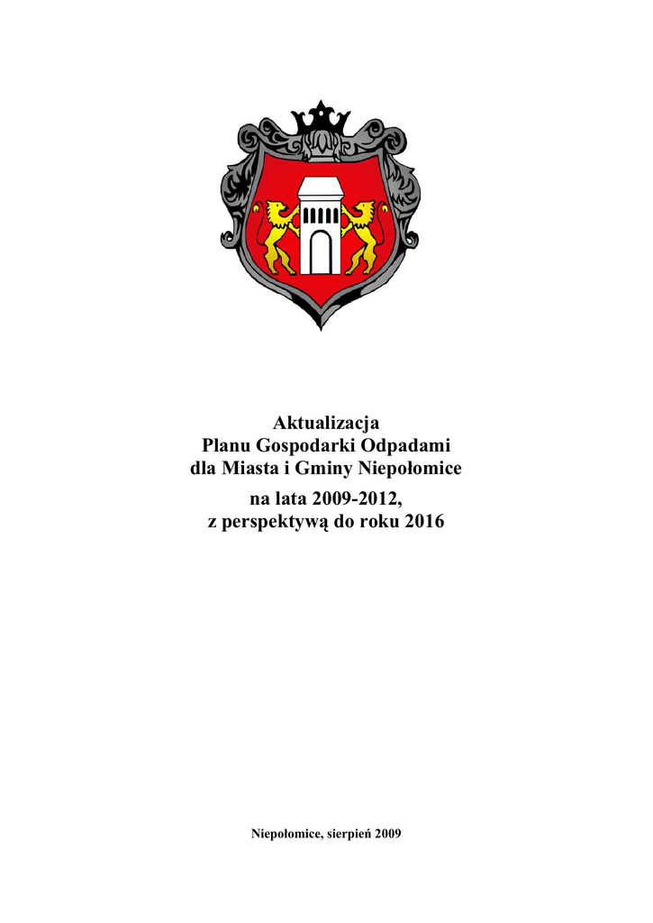 Aktualizacja Planu Gospodarki Odpadami dla Miasta i Gminy Niepołomice na lata 2009-2012, z perspektywą do roku 2016 Niepołomice, sierpień 2009 Spis treści 1. Wstęp ................................................................................................................. 3 1.1 Podstawa opracowania ................................................................................. 3 1.2 Zakres opracowania ..................................................................................... 3 2. Charakterystyka gminy ..................................................................................... 6 2.1 Położenie, ludność ....................................................................................... 6 2.2 Infrastruktura i gospodarka .......................................................................... 7 2.3 Stan środowiska przyrodniczego ................................................................. 8 2.4 Turystyka ..................................................................................................... 9 3. Aktualny stan gospodarki odpadami ............................................................... 10 3.1 Rodzaj, ilość i źródła powstawania odpadów ............................................ 10 3.2 Istniejące systemy zbierania odpadów....................................................... 15 3.3 Rodzaj i ilość odpadów poddawanych poszczególnym procesom odzysku i unieszkodliwiania ............................................................................................ 20 3.4. Rodzaj, rozmieszczenie oraz moc przerobowa instalacji do odzysku i unieszkodliwiania odpadów ............................................................................. 22 3.5 Identyfikacja problemów w zakresie gospodarowania odpadami ............. 25 4. Prognozowane zmiany w zakresie gospodarki odpadami ............................... 26 5. Cele w zakresie gospodarki odpadami ............................................................ 32 6. Zadania strategiczne do roku 2016 ................................................................. 34 7. Harmonogram realizacji przedsięwzięć obejmujących okres 4 - letni i sposób ich finansowania .......................................................................................... 39 8. System monitoringu i oceny realizacji zamierzonych celów .......................... 42 9. Analiza oddziaływania projektu planu gospodarki odpadami na środowisko 45 10. Streszczenie ................................................................................................... 47 11. Materiały źródłowe........................................................................................ 50 Spis tabel ............................................................................................................. 51 Spis rysunków ..................................................................................................... 52 Plan Gospodarki Odpadami dla Miasta i Gminy Niepołomice na lata 2009-2012 z perspektywą do roku 2016 1. Wstęp 1.1 Podstawa opracowania Aktualizacja Planu Gospodarki Odpadami dla Miasta i Gminy Niepołomice na lata 20092012, z perspektywa do roku 2016, powstaje jako realizacja ustawy z dnia 27 kwietnia 2001 r. o odpadach (Dz. U. z 2007, Nr 39, poz. 251 z zm.), która w rozdziale 3, art. 14 – 16 wprowadza obowiązek opracowywania planów na szczeblu krajowym, wojewódzkim, powiatowym i gminnym oraz aktualizacji tych planów nie rzadziej niż co 4 lata. Dokumentem nadrzędnym wobec Planu Gospodarki Odpadami dla Gminy Niepołomice jest Plan Gospodarki Odpadami dla Powiatu Wielickiego, który powinien być opracowany zgodnie z Wojewódzkim Planem Gospodarki Odpadami (WPGO) dla województwa małopolskiego, dla którego dokumentem nadrzędnym jest Krajowy Plan Gospodarki Odpadami (KPGO). Niniejszy dokument jest aktualizacją i kontynuacją Planu Gospodarki Odpadami dla Miasta i Gminy Niepołomice przyjętego przez Radę Miejską w Niepołomicach Niepołomice uchwałą nr XXXIX/547/05 z dnia 27 października 2005 r. w sprawie: Programu Ochrony Środowiska i Planu Gospodarki Odpadami dla Miasta i Gminy Niepołomice. Plan ten został uprzednio pozytywnie zaopiniowany przez Zarząd Województwa Małopolskiego, Zarząd Powiatu Wielickiego oraz Regionalny Zarząd Gospodarki Wodnej w Krakowie. Celem niniejszej aktualizacji Planu … jest dostosowanie zapisów pierwotnego dokumentu do aktualnie obowiązujących przepisów prawa w tym względzie oraz do uwarunkowań aktualnego stanu zarządzania środowiskiem i jego ochroną. Formalną podstawą niniejszego opracowania jest umowa z dnia 9 marca 2009 r. zawarta pomiędzy Gminą Niepołomice reprezentowaną przez Stanisława Kracika – Burmistrza Miasta i Gminy Niepołomice, a Małopolskim Biurem Konsultingowo-Marketingowym – ochrona środowiska s.c. reprezentowanym przez Konrada Pawła Turzańskiego – wspólnika spółki cywilnej.. 1.2 Zakres opracowania Zakres gminnych planów gospodarki odpadami został określony w art. 14 ust. 2 oraz art. 15 ust. 3 i 4 ustawy z dnia 27 kwietnia 2001 r. o odpadach. Uszczegółowienie tych zapisów zostało zawarte w § 4 i § 6 pkt. 2 i 4 rozporządzenia Ministra Środowiska z dnia 9 kwietnia 2003 r. w sprawie sporządzania planów gospodarki odpadami (Dz. U. Nr 66, poz. 620 oraz z 2006 r. Nr 46, poz. 333). W dniu 13 października 2005 r. w sposób znaczący zmienił się porządek prawny w tym zakresie. Weszła w życie ustawa z dnia 29 lipca 2005 r. o zmianie ustawy o odpadach oraz o zmianie niektórych innych ustaw (Dz. U. Nr 175, poz. 1458 oraz z 2006 r. Nr 63, poz. 441), która wprowadziła modyfikacje dotyczące zakresu gminnych planów gospodarki odpadami. Zmiany wprowadzone do ustawy o odpadach ustawy zawęziły zakres gminnego planu gospodarki odpadami tylko do odpadów komunalnych powstających na obszarze danej gminy 3 Plan Gospodarki Odpadami dla Miasta i Gminy Niepołomice na lata 2009