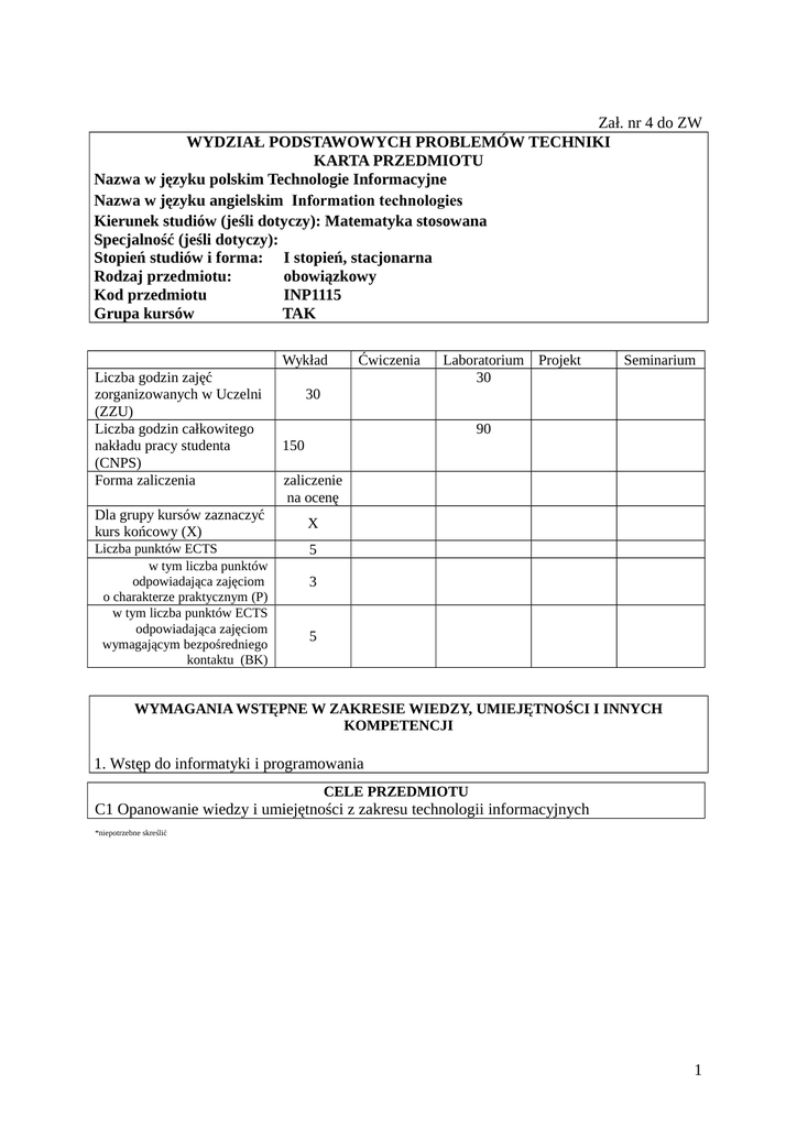 Zał. nr 4 do ZW WYDZIAŁ PODSTAWOWYCH PROBLEMÓW TECHNIKI KARTA PRZEDMIOTU Nazwa w języku polskim Technologie Informacyjne Nazwa w języku angielskim Information technologies Kierunek studiów (jeśli dotyczy): Matematyka stosowana Specjalność (jeśli dotyczy): Stopień studiów i forma: I stopień, stacjonarna Rodzaj przedmiotu: obowiązkowy Kod przedmiotu INP1115 Grupa kursów TAK Wykład Liczba godzin zajęć zorganizowanych w Uczelni (ZZU) Liczba godzin całkowitego nakładu pracy studenta (CNPS) Forma zaliczenia Dla grupy kursów zaznaczyć kurs końcowy (X) Liczba punktów ECTS w tym liczba punktów odpowiadająca zajęciom o charakterze praktycznym (P) w tym liczba punktów ECTS odpowiadająca zajęciom wymagającym bezpośredniego kontaktu (BK) Ćwiczenia Laboratorium Projekt 30 Seminarium 30 90 150 zaliczenie na ocenę X 5 3 5 WYMAGANIA WSTĘPNE W ZAKRESIE WIEDZY, UMIEJĘTNOŚCI I INNYCH KOMPETENCJI 1. Wstęp do informatyki i programowania CELE PRZEDMIOTU C1 Opanowanie wiedzy i umiejętności z zakresu technologii informacyjnych *niepotrzebne skreślić 1 EFEKTY KSZTAŁCENIA DLA PRZEDMIOTU Z zakresu wiedzy: PEK_W1 Posiada ogólną wiedzę na temat technologii informacyjnych. Zna podstawy baz danych oraz ich praktyczne zastosowania Z zakresu umiejętności: PEK_U1 Potrafi konstruować algorytmy, wykorzystywane w różnych problemach techniki i praktyki inżynierskiej Z zakresu kompetencji społecznych: PEK_K1 Jest przygotowany do zdobywania nowych kompetencji i współpracy z przedstawicielami innych zawodów TREŚCI PROGRAMOWE Wy1- Forma zajęć - wykłady Elementy pakietów biurowych. Wy2 Edytory tekstu. Zasady korzystania. Liczba godzin 2 2 Wy3- Arkusze kalkulacyjne. Podstawowe obliczenia. Wprowadzenie do Wy4 programowania w arkuszach kalkulacyjnych. Wy5 Systemy prezentacji multimedialnych. Wy6 Integracja składników pakietów biurowych. Osadzanie obiektów. Wy7- Wprowadzenie do baz danych. Elementy języka SQL. Wy8 Internet i sieci komputerowe. Protokoły TCP/IP. Tworzenie stron Wy9WWW przy użyciu języka HTML. Adres IP. Poczta elektroniczna 10 oraz usługi sieciowe. Wy11 CSS i elementy języka PHP Wy12 Korzystanie w wyszukiwarek internetowych. Wy13 Bezpieczeństwo komputerowe. Hasła, szyfrowanie, wirusy. Wy14 Wy15 Wprowadzenie do systemu TEX i LATEX. Suma godzin Forma zajęć – ćwiczenia La1 4 2 2 4 4 2 2 4 2 30 Liczba godzin Laboratorium ilustrujące materiał przedstawiony na wykładzie. Suma godzin 30 30 STOSOWANE NARZĘDZIA DYDAKTYCZNE 1. Wykład problemowo-informacyjny– metoda tradycyjna, prezentacja multimedialna 2. Laboratorium komputerowe dotyczące materiału przedstawionego na wykładzie. OCENA OSIĄGNIĘCIA PRZEDMIOTOWYCH EFEKTÓW KSZTAŁCENIA Oceny (F – formująca Numer efektu Sposób oceny osiągnięcia efektu kształcenia 2 (w trakcie semestru), P – podsumowująca (na koniec semestru) F1 F2 kształcenia PEK_W1 PEK_K1 PEK_U1 PEK_K1 Zaliczenie wykładu- kolokwia Odpowiedzi ustne, projekty, sprawozdania P=0.5*F1+0.5*F2 LITERATURA PODSTAWOWA I UZUPEŁNIAJĄCA [1]. Włodzimierz Gajda, HTML, XHTML i CSS. Praktyczne projekty, Helion 2007. [2]. Leslie Lamport, LATEX. A document preparation system. User's guide and reference manual, Addison-Wessley, 1994. OPIEKUN PRZEDMIOTU (IMIĘ, NAZWISKO, ADRES E-MAIL) Krzysztof Burnecki ([email protected]) 3 MACIERZ POWIĄZANIA EFEKTÓW KSZTAŁCENIA DLA PRZEDMIOTU Technologie informacyjne Z EFEKTAMI KSZTAŁCENIA NA KIERUNKU MATEMATYKA STOSOWANA Przedmiotowy efekt kształcenia PEK_W1 PEK_U1 PEK_K1 Odniesienie przedmiotowego efektu do efektów kształcenia zdefiniowanych dla kierunku studiów i specjalności (o ile dotyczy) K1MAT_W11 K1MAT_U07 K1MAT_K03 ** - z tabeli powyżej Cele przedmiotu** Treści programowe** Numer narzędzia dydaktycznego** C1 C1 C1 Wy1-Wy15 La1 Wy1-Wy15, La1 1 2 1,2