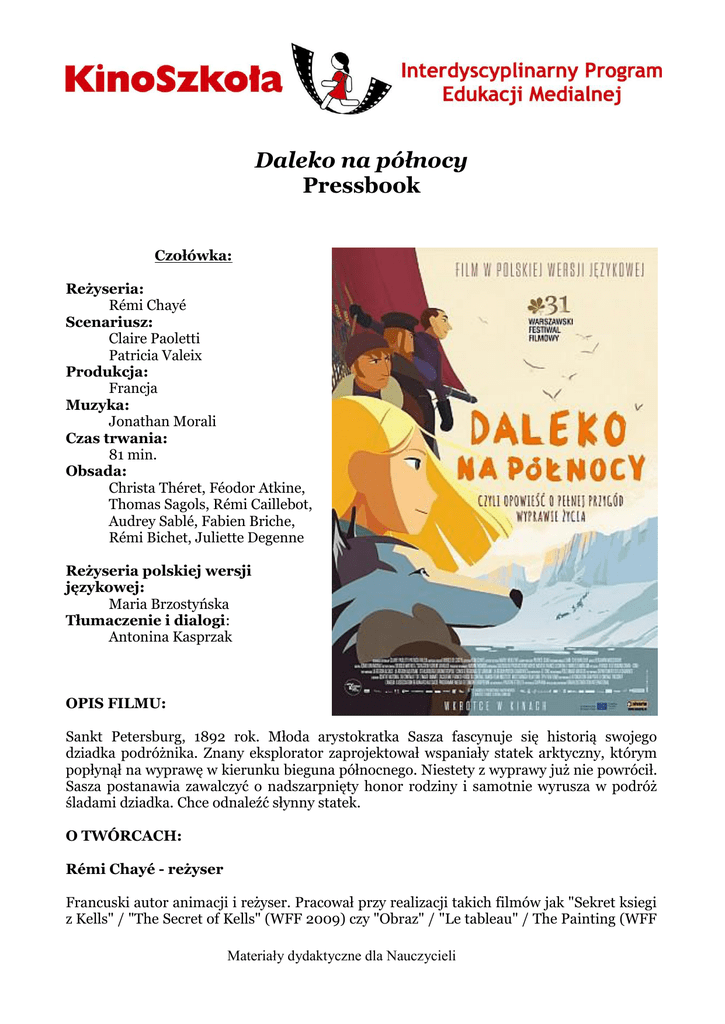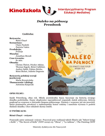 Daleko na północy Pressbook Czołówka: Reżyseria: Rémi Chayé Scenariusz: Claire Paoletti Patricia Valeix Produkcja: Francja Muzyka: Jonathan Morali Czas trwania: 81 min. Obsada: Christa Théret, Féodor Atkine, Thomas Sagols, Rémi Caillebot, Audrey Sablé, Fabien Briche, Rémi Bichet, Juliette Degenne Reżyseria polskiej wersji językowej: Maria Brzostyńska Tłumaczenie i dialogi: Antonina Kasprzak OPIS FILMU: Sankt Petersburg, 1892 rok. Młoda arystokratka Sasza fascynuje się historią swojego dziadka podróżnika. Znany eksplorator zaprojektował wspaniały statek arktyczny, którym popłynął na wyprawę w kierunku bieguna północnego. Niestety z wyprawy już nie powrócił. Sasza postanawia zawalczyć o nadszarpnięty honor rodziny i samotnie wyrusza w podróż śladami dziadka. Chce odnaleźć słynny statek. O TWÓRCACH: Rémi Chayé - reżyser Francuski autor animacji i reżyser. Pracował przy realizacji takich filmów jak "Sekret ksiegi z Kells" / "The Secret of Kells" (WFF 2009) czy "Obraz" / "Le tableau" / The Painting (WFF Materiały dydaktyczne dla Nauczycieli 2012). "Tout en haut du monde", jego debiut jako reżysera, miał premierę na festiwalu w Annecy 2015 PRASA O FILMIE: „Ta francusko-duńska produkcja oferuje wszystko, czego oczekujemy od filmu przygodowego dla dzieci i młodzieży: wartka akcja pełna niebezpieczeństw, pasjonujące podróże, ciekawa bohaterka oraz dobra animacja. To widowiskowa bajka o odwadze i sile, która nie epatuje niepotrzebną agresją.” New York Times Na podstawie materiałów: http://www.vivarto.pl/film/536,daleko-na-polnocy/ http://wff.pl/film/long-way-north http://www.kinoinfo.pl/pressbook/12118_ulotka_dalekonapolnocy.pdf [dostęp: 05.08.2016 r.] Materiały dydaktyczne dla Nauczycieli