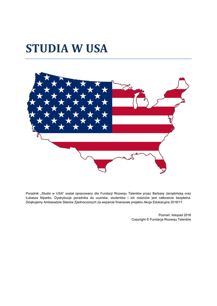 STUDIA W USA Poradnik „Studia w USA” został opracowany dla Fundacji Rozwoju Talentów przez Barbarę Jarzębińską oraz Łukasza Niparko. Dystrybucja poradnika do uczniów, studentów i ich rodziców jest całkowicie bezpłatna. Dziękujemy Ambasadzie Stanów Zjednoczonych za wsparcie finansowe projektu Akcja Edukacyjna 2016/17. Poznań, listopad 2016 Copyright © Fundacja Rozwoju Talentów Spis treści 1. 2. 3. 4. 5. 6. 7. 8. 9. O życiu w USA Struktura studiów w USA Korzyści studiowania w USA Procedura aplikacyjna Wymagane dokumenty Koszty studiowania Finansowanie studiów Co robić po studiach w USA? Bibliografia O życiu w USA USA to jedno państwo, a wydaje się, że znajduje się w nim cały świat! Po pierwsze: wszelakie cuda natury; od jaskiń, jednych z najpiękniejszy na świecie, do niesamowitych kanionów oraz parków narodowych, dolin, skamieniałości, pustyń, czy wodospadów. Nie zapominajmy o cudach zbudowanych przez człowieka, takich jak: Empire State Building, most Golden Gate, czy Statua Wolności. Co więcej – znajdziesz tam klimat, który zadowoli każdego: od mroźnej Alaski, przez umiarkowany klimat Nowego Jorku, po upały takie jak w Miami czy Los Angeles. Oczywiście nie zapominamy o rozrywce. Przecież to właśnie TU, w Stanach, znajduje się jej stolica: Las Vegas, skąd człowiek nigdy jeszcze nie wyjechał niezadowolony. USA to kraj nieskończonych możliwości m.in. biznesowych, które symbolizują Wall Street oraz „rozgrzane highways”. To tu znajdują się jedne z największych przedsiębiorstw na świecie. To tu zaistniały takie firmy jak Microsoft czy Apple. To tu zaczyna się ROZWÓJ. USA to kraj bardzo atrakcyjny także pod względem perspektyw naukowych. Świat dobrej edukacji nie kończy się na Europie. A właściwie, patrząc na wyniki światowych rankingów szkół wyższych, tak naprawdę zaczyna się za oceanem. Podjęcie nauki w USA to proces dość skomplikowany. Żeby go przejść, trzeba umieć zarządzać czasem, być dokładnym i sumiennym. Mnogość spraw do załatwienia, deadline’ów i ilość informacji do przetworzenia niejednego przyprawi o zawrót głowy. Ale jest to do zrobienia. Co roku ok. 1,500 polskich uczniów i studentów rozpoczyna studia na amerykańskich uczelniach. www.FundacjaRozwojuTalentow.pl Struktura studiów w USA W Stanach znajduje się około 5,000 szkół wyższych - od „szkół pomaturalnych”, przez różnego rodzaju college’e, aż po najbardziej prestiżowe uniwersytety, takie jak Harvard University (najbogatszy uniwersytet na świecie), Princeton University, Yale, MIT czy Stanford. Nauka w USA, podobnie jak u nas, dzieli się na 3 poziomy: podstawowy (elementary), średni (secondary) i wyższy (higher education). Studia polskie i amerykańskie różnią się jednak procesem zdobywania kolejnych tytułów i stopni naukowych. Kilka ważnych faktów: Studia na uczelniach amerykańskich polegają na czynnym udziale studentów w zajęciach teoretycznych i praktycznych oraz w dyskusjach między studentami a profesorami. Profesorowie traktują swoich studentów jako równorzędnych partnerów w dyskusji, a na zajęciach ceni się aktywność i kreatywność. Amerykańscy studenci otwarcie przyznają, że jeśli czegoś nie wiedzą albo nie rozumieją, nie jest to odbierane jako nieprzygotowanie do zajęć tylko pożądana w tym kraju dociekliwość. Uczelnie w Stanach różnią się też sposobami egzekwowania i sprawdzania wiedzy. Punkty potrzebne do zaliczenia kursu studenci gromadzą przez cały semestr, mimo że większość przedmiotów kończy się semestralnym egzaminem sprawdzającym, tzw. final exam. W trakcie całego semestru zalicza się materiał na testach, sprawdzianach, prowadzi się projekty badawcze i pisze eseje. Uczelnie wyższe w USA można podzielić w zależności od ich uprawnień do nadawania tytułów naukowych na: UNDERGRADUATE o College lub University (Bachelor Degree) Studia I stopnia (odpowiednik studiów licencjackich) Kończą się uzyskaniem stopnia Bachelor’s Degree. Trwają przeważnie 4 lata. Z tego względu czasami zdarza się, że uczelnie amerykańskie nie uznają naszych polskich studiów licencjackich jako odpowiednika studiów na poziomie bachelor. o Community College (Associate Degree) To dwuletnie uczelnie, będące czymś pomiędzy polskimi szkołami pomaturalnymi, a uczelnią wyższą. Wymogiem dostania się do Community College jest posiadanie świadectwa ukończenia szkoły średniej (polska matura). Szkoły te oferują więcej przedmiotów o charakterze czysto zawodowym, a mniej koncentrują się na przedmiotach akademickich. Nauka w nich jest zazwyczaj dużo tańsza niż w 4-letnich instytucjach. Absolwenci otrzymują dyplom Associate z nauk humanistycznych (A.A. Associate of Arts) albo ścisłych (A.S. - Associate of Science). Istnieją też specjalistyczne stopnie, np. z pielęgniarstwa lub gastronomii. Absolwenci Community Colleges mogą kontynuować naukę na czteroletnich uczelniach w ramach transferu. www.FundacjaRozwojuTalentow.pl GRADUATE Studia II stopnia (odpowiednik studiów magisterskich) Kończą się uzyskaniem Stopnia Master Degree. Dla przykładu absolwenci kierunków humanistycznych otrzymują stopień M.A. (Master of Arts), przyrodniczych i technicznych – M.S. lub M.Sc. (Master of Science), a biznesowych – MBA (Master of Business Administration). Istnieją jednak pewne wyjątki, np. lekarzem można zostać dopiero po ukończeniu 4 lat studiów undergraduate, 4 lat studiów graduate oraz 3-letnim stażu w szpitalu. Dopiero wtedy uzyskuje się stopień M.D. (Medicinae Doctor), wymagany do wykonywania zawodu. Trochę inaczej przebiegają też studia prawnicze, wiodące do uzyskania stopnia J.D. (Juris Doctor), który można uzyskać po 4-latch studiów undergraduate i ukończeniu tzw. law school. Studia doktoranckie Studia doktoranckie umożliwiają uzyskanie najwyższego stopnia akademickiego np. tytuł naukowy PhD (Doctor 