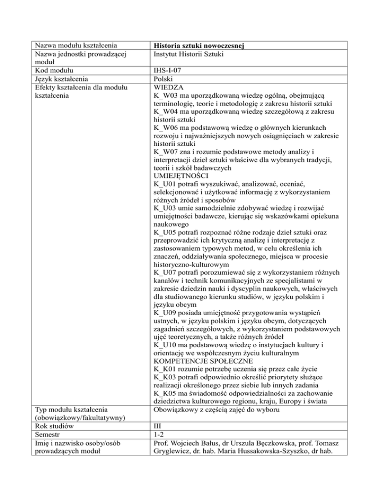 Nazwa modułu kształcenia - Instytut Historii Sztuki UJ