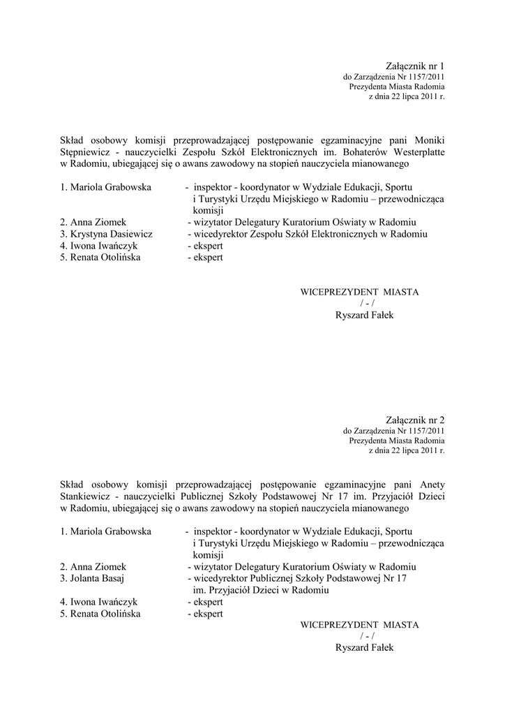 Załącznik nr 1 do Zarządzenia Nr 1157/2011 Prezydenta Miasta Radomia z dnia 22 lipca 2011 r. Skład osobowy komisji przeprowadzającej postępowanie egzaminacyjne pani Moniki Stępniewicz - nauczycielki Zespołu Szkół Elektronicznych im. Bohaterów Westerplatte w Radomiu, ubiegającej się o awans zawodowy na stopień nauczyciela mianowanego 1. Mariola Grabowska 2. Anna Ziomek 3. Krystyna Dasiewicz 4. Iwona Iwańczyk 5. Renata Otolińska - inspektor - koordynator w Wydziale Edukacji, Sportu i Turystyki Urzędu Miejskiego w Radomiu – przewodnicząca komisji - wizytator Delegatury Kuratorium Oświaty w Radomiu - wicedyrektor Zespołu Szkół Elektronicznych w Radomiu - ekspert - ekspert WICEPREZYDENT MIASTA /-/ Ryszard Fałek Załącznik nr 2 do Zarządzenia Nr 1157/2011 Prezydenta Miasta Radomia z dnia 22 lipca 2011 r. Skład osobowy komisji przeprowadzającej postępowanie egzaminacyjne pani Anety Stankiewicz - nauczycielki Publicznej Szkoły Podstawowej Nr 17 im. Przyjaciół Dzieci w Radomiu, ubiegającej się o awans zawodowy na stopień nauczyciela mianowanego 1. Mariola Grabowska 2. Anna Ziomek 3. Jolanta Basaj 4. Iwona Iwańczyk 5. Renata Otolińska - inspektor - koordynator w Wydziale Edukacji, Sportu i Turystyki Urzędu Miejskiego w Radomiu – przewodnicząca komisji - wizytator Delegatury Kuratorium Oświaty w Radomiu - wicedyrektor Publicznej Szkoły Podstawowej Nr 17 im. Przyjaciół Dzieci w Radomiu - ekspert - ekspert WICEPREZYDENT MIASTA /-/ Ryszard Fałek Załącznik nr 3 do Zarządzenia Nr 1157/2011 Prezydenta Miasta Radomia z dnia 22 lipca 2011 r. Skład osobowy komisji przeprowadzającej postępowanie egzaminacyjne pani Katarzyny Kornackiej - nauczycielki Zespołu Szkół Ogólnokształcących Nr 4 z Oddziałami Sportowymi w Radomiu, ubiegającej się o awans zawodowy na stopień nauczyciela mianowanego 1. Mariola Grabowska 2. Anna Ziomek 3. Jolanta Brandt 4. Iwona Iwańczyk 5. Renata Otolińska - inspektor - koordynator w Wydziale Edukacji, Sportu i Turystyki Urzędu Miejskiego w Radomiu – przewodnicząca komisji - wizytator Delegatury Kuratorium Oświaty w Radomiu - wicedyrektor Zespołu Szkół Ogólnokształcących Nr 4 z Oddziałami Sportowymi w Radomiu - ekspert - ekspert WICEPREZYDENT MIASTA /-/ Ryszard Fałek Załącznik nr 4 do Zarządzenia Nr 1157/2011 Prezydenta Miasta Radomia z dnia 22 lipca 2011 r. Skład osobowy komisji przeprowadzającej postępowanie egzaminacyjne pani Edyty Stępniewicz - nauczycielki X Liceum Ogólnokształcącego im. Stanisława Konarskiego w Radomiu, ubiegającej się o awans zawodowy na stopień nauczyciela mianowanego 1. Mariola Grabowska 2. Anna Ziomek 3. Wiktor Karoń 4. Iwona Iwańczyk 5. Renata Otolińska - inspektor - koordynator w Wydziale Edukacji, Sportu i Turystyki Urzędu Miejskiego w Radomiu – przewodnicząca komisji - wizytator Delegatury Kuratorium Oświaty w Radomiu - dyrektor X Liceum Ogólnokształcącego im. Stanisława Konarskiego w Radomiu - ekspert - ekspert WICEPREZYDENT MIASTA /-/ Ryszard Fałek Załącznik nr 5 do Zarządzenia Nr 1157/2011 Prezydenta Miasta Radomia z dnia 22 lipca 2011 r. Skład osobowy komisji przeprowadzającej postępowanie egzaminacyjne pani Eleny Rembiś - nauczycielki Zespołu Szkół Samochodowych w Radomiu, ubiegającej się o awans zawodowy na stopień nauczyciela mianowanego 1. Mariola Grabowska 2. Anna Ziomek 3. Wojciech Bernat 4. Iwona Iwańczyk 5. Dariusz Pronobis - inspektor - koordynator w Wydziale Edukacji, Sportu i Turystyki Urzędu Miejskiego w Radomiu – przewodnicząca komisji - wizytator Delegatury Kuratorium Oświaty w Radomiu - dyrektor Zespołu Szkół Samochodowych w Radomiu - ekspert - ekspert WICEPREZYDENT MIASTA /-/ Ryszard Fałek Załącznik nr 6 do Zarządzenia Nr 1157/2011 Prezydenta Miasta Radomia z dnia 22 lipca 2011 r. Skład osobowy komisji przeprowadzającej postępowanie egzaminacyjne pani Katarzyny Seremak - nauczycielki Zespołu Szkół Integracyjnych im. Jana Pawła II w Radomiu, ubiegającej się o awans zawodowy na stopień nauczyciela mianowanego 1. Mariola Grabowska 2. Anna Ziomek 3. Małgorzata Szewczyk 4. Iwona Iwańczyk 5. Renata Otolińska - inspektor - koordynator w Wydziale Edukacji, Sportu i Turystyki Urzędu Miejskiego w Radomiu – przewodnicząca komisji - wizytator Delegatury Kuratorium Oświaty w Radomiu - wicedyrektor Zesp. Szkół Integracyjnych im. Jana Pawła II w Radomiu - ekspert - ekspert WICEPREZYDENT MIASTA /-/ Ryszard Fałek Załącznik nr 7 do Zarządzenia Nr 1157/2011 Prezydenta Miasta Radomia z dnia 22 lipca 2011 r. Skład osobowy komisji przeprowadzającej postępowanie egzaminacyjne niżej wymienionych nauczycieli Centrum Kształcenia Praktycznego w Radomiu, ubiegających się o awans zawodowy na stopień nauczyciela mianowanego; 1. Andrzej Potocki 2. Michał Oparcik 1. Mariola Grabowska 2. Dariusz Sośnia 3. Marek Wieśniak 4. Krystyna Dasiewicz 5. Tomasz Jagiełło - inspektor - koordynator w Wydziale Edukacji, Sportu i Turystyki Urzędu Miejskiego w Radomiu – przewodnicząca komisji - st. wizytator Delegatury Kuratorium Oświaty w Radomiu - wicedyrektor Centrum Kształcenia Praktycznego w Radomiu - ekspert - ekspert WICEPREZYDENT MIASTA /-/ Ryszard Fałek Załącznik nr 8 do Zarządzenia Nr 1157/2011 Prezydenta Miasta Radomia z dnia 22 lipca 2011 r. Skład osobowy komisji przeprowadzającej postępowanie egzaminacyjne niżej wymienionych nauczycieli Zespołu Szkół Samochodowych w Radomiu, ubiegających się o awans zawodowy na stopień nauczyciela mianowanego: 1. Mirosław Gromski 2. Paweł Maruszak 3. Łukasz Mazur 4. Ireneusz Musiałek 5. Konrad Woźniak 1. Mariola Grabowska 2. Dariusz Sośnia 3. Wojciech Bernat 4. Krystyna Dasiewicz 5. Tomasz Jagiełło - inspektor - koordynator w Wydziale Edukacji, Sportu i Turystyki Urzędu Miejskiego w Radomiu – przewodnicząca komisji - st. wizytator Delegatury Kuratorium Oświaty w Radomiu - dyrektor Zespołu Szkół Samochodowych w Radomiu - ekspert - ekspert