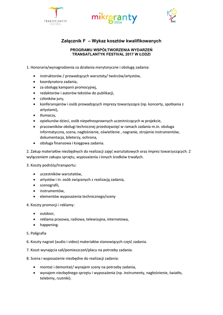 Załącznik F – Wykaz kosztów kwalifikowanych PROGRAMU WSPÓŁTWORZENIA WYDARZEŃ TRANSATLANTYK FESTIVAL 2017 W ŁODZI 1. Honoraria/wynagrodzenia za działania merytoryczne i obsługę zadania: instruktorów / prowadzących warsztaty/ twórców/artystów, koordynatora zadania, za obsługę kampanii promocyjnej, redaktorów i autorów tekstów do publikacji, członków jury, konferansjerów i osób prowadzących imprezy towarzyszące (np. koncerty, spotkania z artystami), tłumaczy, opiekunów dzieci, osób niepełnosprawnych uczestniczących w projekcie, pracowników obsługi technicznej przedsięwzięć w ramach zadania m.in. obsługa informatyczna, scena, nagłośnienie, oświetlenie , nagranie, strojenie instrumentów, dokumentacja, bileterzy, ochrona, obsługa finansowa i księgowa zadania. 2. Zakup materiałów niezbędnych do realizacji zajęć warsztatowych oraz imprez towarzyszących. Z wyłączeniem zakupu sprzętu, wyposażenia i innych środków trwałych. 3. Koszty podróży/transportu: uczestników warsztatów, artystów i in. osób związanych z realizacją zadania, scenografii, instrumentów, elementów wyposażenia technicznego/sceny 4. Koszty promocji i reklamy: outdoor, reklama prasowa, radiowa, telewizyjna, internetowa, happening. 5. Poligrafia 6. Koszty nagrań (audio i video) materiałów stanowiących część zadania. 7. Koszt wynajęcia sali/pomieszczeń/placu na potrzeby zadania. 8. Scena i wyposażenie niezbędne do realizacji zadania: montaż i demontaż/ wynajem sceny na potrzeby zadania, wynajem niezbędnego sprzętu i wyposażenia (np. instrumenty, nagłośnienie, światło, telebimy, rzutniki). 9. Scenografia i stroje: projekt, wykonanie (w tym koszt materiałów), wypożyczenie. 10. Noclegi i wyżywienie dla uczestników przedsięwzięć organizowanych w ramach zadania, w tym artystów i jurorów. 11. Zakup biletów dla uczestników zadania na przedsięwzięcia kulturalne (np. wystawy, spektakle teatralne, koncerty) stanowiące integralną część zadania. 12. Nagrody finansowe i zakup nagród rzeczowych dla uczestników. 13. Projekt i wykonanie statuetek, dyplomów. 14. Dokumentacja/rejestracja realizacji zadania (filmowa, dźwiękowa, zdjęciowa). 15. Projekt i prowadzenie strony internetowej zadania. 16. Niezbędne ubezpieczenia. 17. Koszty związane z dostosowaniem działań i formy przekazu do potrzeb osób z niepełnosprawnościami. 18. Materiały nutowe 19. ZAIKS. 20. Koszty praw autorskich. 21. Koszt przeprowadzenia ewaluacji zadania.