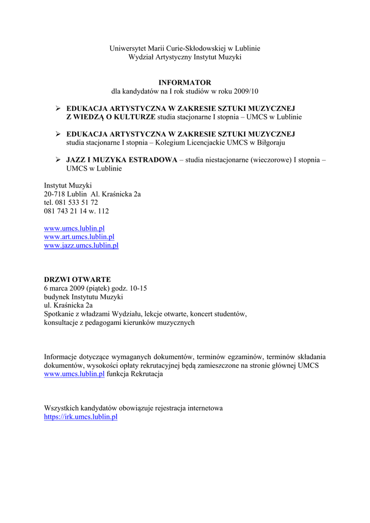Uniwersytet Marii Curie-Skłodowskiej w Lublinie Wydział Artystyczny Instytut Muzyki INFORMATOR dla kandydatów na I rok studiów w roku 2009/10 ¾ EDUKACJA ARTYSTYCZNA W ZAKRESIE SZTUKI MUZYCZNEJ Z WIEDZĄ O KULTURZE studia stacjonarne I stopnia – UMCS w Lublinie ¾ EDUKACJA ARTYSTYCZNA W ZAKRESIE SZTUKI MUZYCZNEJ studia stacjonarne I stopnia – Kolegium Licencjackie UMCS w Biłgoraju ¾ JAZZ I MUZYKA ESTRADOWA – studia niestacjonarne (wieczorowe) I stopnia – UMCS w Lublinie Instytut Muzyki 20-718 Lublin Al. Kraśnicka 2a tel. 081 533 51 72 081 743 21 14 w. 112 www.umcs.lublin.pl www.art.umcs.lublin.pl www.jazz.umcs.lublin.pl DRZWI OTWARTE 6 marca 2009 (piątek) godz. 10-15 budynek Instytutu Muzyki ul. Kraśnicka 2a Spotkanie z władzami Wydziału, lekcje otwarte, koncert studentów, konsultacje z pedagogami kierunków muzycznych Informacje dotyczące wymaganych dokumentów, terminów egzaminów, terminów składania dokumentów, wysokości opłaty rekrutacyjnej będą zamieszczone na stronie głównej UMCS www.umcs.lublin.pl funkcja Rekrutacja Wszystkich kandydatów obowiązuje rejestracja internetowa https://irk.umcs.lublin.pl EDUKACJA ARTYSTYCZNA W ZAKRESIE SZTUKI MUZYCZNEJ Z WIEDZĄ O KULTURZE 3-letnie studia stacjonarne pierwszego stopnia (nauczycielskie) UMCS w Lublinie Trzyletnie studia stacjonarne, które kończą się uzyskaniem tytułu licencjata. Jako studia nauczycielskie, prowadzone są w zakresie dwóch specjalności: głównej i dodatkowej. Na program studiów składają się: przedmioty podstawowe i kierunkowe w zakresie specjalności głównej: m. in. kształcenie słuchu, historia muzyki, harmonia, instrumentacja, fortepian, drugi instrument, dyrygowanie, emisja głosu oraz przedmioty dodatkowe i fakultatywne. Indywidualny tok nauczania niektórych przedmiotów muzycznych zapewnia studentom optymalne doskonalenie umiejętności wykonawczych. przedmioty w zakresie specjalności dodatkowej: m.in. wprowadzenie do wiedzy o kulturze, historia sztuki, wiedza z zakresu syntezy i integracji sztuk oraz roli mediów w komunikacji kulturowej. przedmioty kształcenia nauczycielskiego: psychologia, pedagogika, metodyki przedmiotowe, praktyki pedagogiczne i warsztaty; przedmioty kształcenia ogólnego: filozofia, język obcy, podstawy informatyki. Studia przygotowują do: prowadzenia zajęć dydaktycznych w zakresie przedmiotu muzyka w szkole podstawowej i gimnazjum; prowadzenia zajęć dydaktycznych w zakresie przedmiotu wiedza o kulturze; prowadzenia chórów, zespołów wokalnych i instrumentalnych w szkołach, placówkach pozaszkolnych i amatorskim ruchu muzycznym; prowadzenia zajęć umuzykalniających w przedszkolach i placówkach pozaszkolnych; działalności muzycznej w instytucjach kultury oraz animacji kultury muzycznej w społeczeństwie. Absolwent kierunku jest przygotowany do podjęcia studiów drugiego stopnia. Kandydaci na studia powinni wykazać się wiedzą muzyczną z zakresu szkoły muzycznej I stopnia. EDUKACJA ARTYSTYCZNA W ZAKRESIE SZTUKI MUZYCZNEJ 3-letnie studia stacjonarne pierwszego stopnia specjalizacja: muzykoterapia Kolegium Licencjackie UMCS w Biłgoraju Trzyletnie studia stacjonarne, które kończą się uzyskaniem tytułu licencjata. Na program studiów składają się przedmioty podstawowe i kierunkowe, m. in. kształcenie słuchu, historia muzyki, harmonia, instrumentacja, fortepian, drugi instrument, dyrygowanie, emisja głosu, zespoły. Indywidualny tok nauczania niektórych przedmiotów muzycznych zapewnia studentom optymalne doskonalenie umiejętności wykonawczych; przedmioty dodatkowe i fakultatywne: psychologia, pedagogika, metodyki przedmiotowe, praktyki pedagogiczne, zarys etnomuzykologii, instrumentoznawstwo, technologie informatyczne w edukacji muzycznej i inne; przedmioty specjalizacyjne: m.in. podstawy muzykoterapii, programowanie muzyki do terapii, techniki relaksacyjne i wizualizacja, arteterapia, pedagogika specjalna; przedmioty kształcenia ogólnego: filozofia, język obcy, podstawy informatyki. Studia przygotowują do: prowadzenia zajęć dydaktycznych w zakresie przedmiotu muzyka w szkole podstawowej i gimnazjum; prowadzenia chórów, zespołów wokalnych i instrumentalnych w szkołach, placówkach pozaszkolnych i amatorskim ruchu muzycznym; prowadzenia zajęć umuzykalniających w przedszkolach i placówkach pozaszkolnych; działalności muzycznej w instytucjach o charakterze kulturalnym, edukacyjnym i terapeutycznym oraz animacji kultury muzycznej w społeczeństwie. Kształcą umiejętność świadomego wykorzystywania terapeutycznych walorów wypływających z kontaktu z muzyką. Uzyskana wiedza teoretyczna i praktyczna umożliwia absolwentom prowadzenie zajęć z wykorzystaniem elementów profilaktyki muzycznej i muzykoterapii, poszerzając warsztat pracy nauczyciela, a zarazem dając możliwość zdobycia ciekawej pracy w instytucjach związanych z profilaktyką i terapią. Absolwent kierunku jest przygotowany do podjęcia studiów drugiego stopnia. Kandydaci na studia powinni wykazać się wiedzą muzyczną z zakresu szkoły muzycznej I stopnia. * * * * * Kwalifikacja odbywa się na podstawie wyników uzyskanych na egzaminie praktycznym. Egzamin praktyczny obowiązuje wszystkich kandydatów i obejmuje trzy sprawdziany: 1. predyspozycji manualnych i wokalnych, 2. słuchu muzycznego, 3. umiejętności gry na wybranym instrumencie. Ad 1 - Kandydata obowiązuje wykazanie się umiejętnością taktowania na 2, 3, 4. - Kandydat zobowiązany jest do wykonania jednej pieśni artystycznej lub piosenki z repertuaru szkolnego, popularnego. Ad 2 -Śpiewanie solmizacją lub nazwami literowymi przygotowanego ćwiczenia (Mały solfeż J. K. Lasockiego). -Śpiewanie a vista w kluczu wiolinowym i basowym. -Rozpoznawanie ilości zagranych dźwięków. -Rozpoznawanie trójdźwięków dur, moll, zwiększonych, zmniejszonych. -Rozpoznawanie zmian w zagranej melodii, trójdźwięku i schemacie rytmicznym. -Powtarzanie głosem dźwiękó