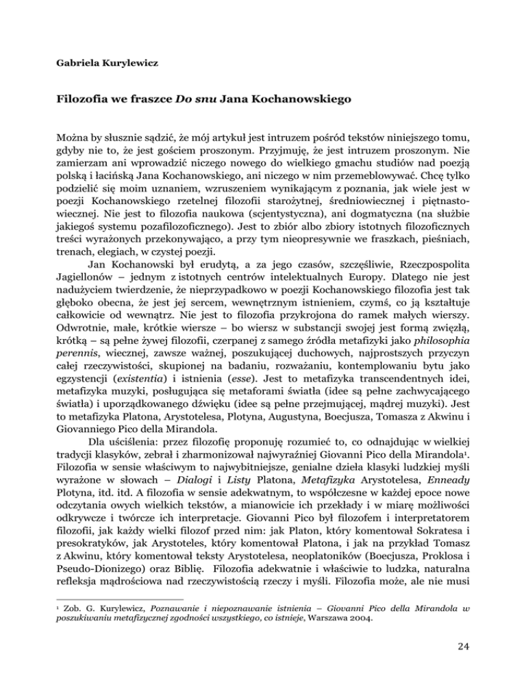 Gabriela Kurylewicz Filozofia we fraszce Do snu Jana Kochanowskiego Można by słusznie sądzić, że mój artykuł jest intruzem pośród tekstów niniejszego tomu, gdyby nie to, że jest gościem proszonym. Przyjmuję, że jest intruzem proszonym. Nie zamierzam ani wprowadzić niczego nowego do wielkiego gmachu studiów nad poezją polską i łacińską Jana Kochanowskiego, ani niczego w nim przemeblowywać. Chcę tylko podzielić się moim uznaniem, wzruszeniem wynikającym z poznania, jak wiele jest w poezji Kochanowskiego rzetelnej filozofii starożytnej, średniowiecznej i piętnastowiecznej. Nie jest to filozofia naukowa (scjentystyczna), ani dogmatyczna (na służbie jakiegoś systemu pozafilozoficznego). Jest to zbiór albo zbiory istotnych filozoficznych treści wyrażonych przekonywająco, a przy tym nieopresywnie we fraszkach, pieśniach, trenach, elegiach, w czystej poezji. Jan Kochanowski był erudytą, a za jego czasów, szczęśliwie, Rzeczpospolita Jagiellonów – jednym z istotnych centrów intelektualnych Europy. Dlatego nie jest nadużyciem twierdzenie, że nieprzypadkowo w poezji Kochanowskiego filozofia jest tak głęboko obecna, że jest jej sercem, wewnętrznym istnieniem, czymś, co ją kształtuje całkowicie od wewnątrz. Nie jest to filozofia przykrojona do ramek małych wierszy. Odwrotnie, małe, krótkie wiersze – bo wiersz w substancji swojej jest formą zwięzłą, krótką – są pełne żywej filozofii, czerpanej z samego źródła metafizyki jako philosophia perennis, wiecznej, zawsze ważnej, poszukującej duchowych, najprostszych przyczyn całej rzeczywistości, skupionej na badaniu, rozważaniu, kontemplowaniu bytu jako egzystencji (existentia) i istnienia (esse). Jest to metafizyka transcendentnych idei, metafizyka muzyki, posługująca się metaforami światła (idee są pełne zachwycającego światła) i uporządkowanego dźwięku (idee są pełne przejmującej, mądrej muzyki). Jest to metafizyka Platona, Arystotelesa, Plotyna, Augustyna, Boecjusza, Tomasza z Akwinu i Giovanniego Pico della Mirandola. Dla uściślenia: przez filozofię proponuję rozumieć to, co odnajdując w wielkiej tradycji klasyków, zebrał i zharmonizował najwyraźniej Giovanni Pico della Mirandola1. Filozofia w sensie właściwym to najwybitniejsze, genialne dzieła klasyki ludzkiej myśli wyrażone w słowach – Dialogi i Listy Platona, Metafizyka Arystotelesa, Enneady Plotyna, itd. itd. A filozofia w sensie adekwatnym, to współczesne w każdej epoce nowe odczytania owych wielkich tekstów, a mianowicie ich przekłady i w miarę możliwości odkrywcze i twórcze ich interpretacje. Giovanni Pico był filozofem i interpretatorem filozofii, jak każdy wielki filozof przed nim: jak Platon, który komentował Sokratesa i presokratyków, jak Arystoteles, który komentował Platona, i jak na przykład Tomasz z Akwinu, który komentował teksty Arystotelesa, neoplatoników (Boecjusza, Proklosa i Pseudo-Dionizego) oraz Biblię. Filozofia adekwatnie i właściwie to ludzka, naturalna refleksja mądrościowa nad rzeczywistością rzeczy i myśli. Filozofia może, ale nie musi 1 Zob. G. Kurylewicz, Poznawanie i niepoznawanie istnienia – Giovanni Pico della Mirandola w poszukiwaniu metafizycznej zgodności wszystkiego, co istnieje, Warszawa 2004. 24 wynikać z wiary w Boga, ale przeważnie do takiej wiary prowadzi. Korzeniem filozofowania jest odpowiednio głęboko pojęty racjonalizm, a więc kultura piękna intelektu i całego stowarzyszonego z nim duchowego życia człowieka. A czym jest poezja? Zdaniem Pica jest muzyką minimalną; minimalną, bo ograniczoną do słów konkretnego języka (greckiego, łacińskiego, włoskiego, hebrajskiego), ale jednak muzyką i to we wszystkich sensach mousike zaproponowanych przez Platona. Poezja rozumiana jako muzyka jest ogromną, twórczą, porządkującą, duchową siłą, mocą. Oznacza równocześnie: a.) uprawianą przez człowieka muzykę instrumentalną, głosową oraz słowną – pieśń; b.) całość wszystkich sztuk rozumianych jako służba Muzom i temu, co boskie, co jest źródłem wszelkiej muzyki; c.) sumę zasad (praw) istotnych dla wszystkich rodzajów twórczości boskiej (wzorczej) i ludzkiej (która w boskiej twórczości uczestniczy)2. Filozofia jest zajęciem intelektualnym, duchowym, całkowicie ludzkim, filozofię uprawia ktoś, kto prawdy nie ma na własność, ale zna jej wagę, piękno, dlatego jej potrzebuje i dlatego szuka3. Poezja natomiast może być ludzka i więcej niż ludzka, może przekraczać ludzkie możliwości poznawcze, jak to się dzieje w przypadku największej twórczości, najdoskonalszej muzyki, jaką jest twórczość, muzyka boska4. U źródeł niesamowitego zdania z fraszki Jana Kochanowskiego Na dom w Czarnolesie (III 37, 1–2): Panie, to moja praca, a zdarzenie Twoje;/ Raczyż błogosławieństwo dać do końca swoje5. jest Platońska teoria twórczości boskiej i ludzkiej, teoria idei i również Tomasza z Akwinu teoria twórczości.6 Jest też ważne dla Giovanniego Pico poznanie uzależnienia wszelkiej twórczości ludzkiej od twórczości w dźwiękach i słowach, czyli poezji, która z kolei niezaprzeczalnie polega na ludzkim, jednostkowym poszukiwaniu dróg uczestnictwa w transcendentnych boskich ideach, boskich, bo obecnych w umyśle Boga, tożsamych z Nim7. Człowiek, poprzez swoją najistotniejszą pracę – poezję, przyjmuje od Boga duchowy dar poznawania rzeczy transcendentnych, który jednak jest tak Zob. G. Kurylewicz, Platońska teoria piękna i muzyki, w: Wizje i re-wizje – Wielka księga estetyki w Polsce, Kraków 2007, s. 311–324 oraz Boecjusz, O pocieszeniu, jakie daje filozofia, przekł. pol. G. Kurylewicz i M. Antczak, Kęty 2006, s. 130–137. 3 Zob. Giovanni Pico della Mirandola, List do Alda Manuzio, Listy, I, 6 – List do Alda Manuzio (z 11 lutego 1492), wyd. Opera Omnia, Hildesheim 1969 (reprint wydania: Basylea 1557), s. 359: „Accinge ad philos