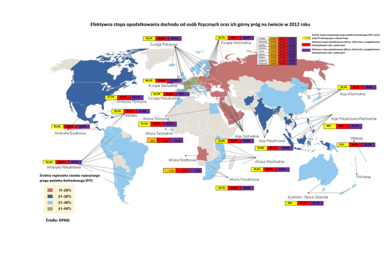 Efektywna stopa opodatkowania dochodu od osób fizycznych oraz ich górny próg na świecie w 2012 roku 36,5% 31,6% 16,7% 36,7% 23% Średnia stawka najwyższego progu podatku dochodowego (PIT) / górny próg PIT obowiązujący w danym kraju 20,9% Efektywna stopa opodatkowania 100 tys. USD brutto z uwzględnieniem obowiązkowych w danym kraju ubez. społecznych Efektywna stopa opodatkowania 300 tys. USD brutto z uwzględnieniem obowiązkowych ubez. społecznych 46,1% 38,4% 47,3% 33,3% 27,7% 28,3% 29,4% 27,4% 33,2% 20,5% 29,1% 35,1% 30% 30,2% 37,8% 15,6% 39,3% 22,9% 24% 31% 33,7% 36,4% 33,7% 17% 20% 30,6% 20% 28,9% 31,2% Średnia regionalna stawka najwyższego progu podatku dochodowego (PIT) 32,7% 27,0% 28,3% 39% Źródło: KPMG 25,7% 23,8% 24,8% 28,1% 25,6% 41,4% 40% 32,4% 18,6% 34% 35,7% 31,5% 25,2% 31,5% 26,4% 37,7% 25,5% 27,2%