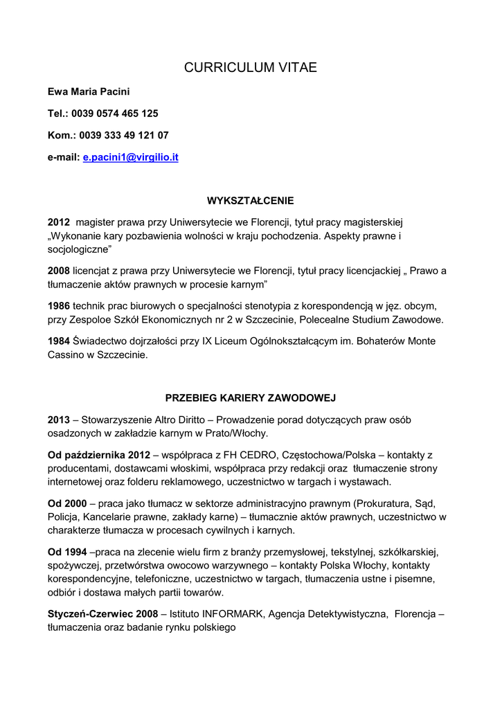 CURRICULUM VITAE Ewa Maria Pacini Tel.: 0039 0574 465 125 Kom.: 0039 333 49 121 07 e-mail: [email protected] WYKSZTAŁCENIE 2012 magister prawa przy Uniwersytecie we Florencji, tytuł pracy magisterskiej „Wykonanie kary pozbawienia wolności w kraju pochodzenia. Aspekty prawne i socjologiczne” 2008 licencjat z prawa przy Uniwersytecie we Florencji, tytuł pracy licencjackiej „ Prawo a tłumaczenie aktów prawnych w procesie karnym” 1986 technik prac biurowych o specjalności stenotypia z korespondencją w jęz. obcym, przy Zespoloe Szkół Ekonomicznych nr 2 w Szczecinie, Polecealne Studium Zawodowe. 1984 Świadectwo dojrzałości przy IX Liceum Ogólnokształcącym im. Bohaterów Monte Cassino w Szczecinie. PRZEBIEG KARIERY ZAWODOWEJ 2013 – Stowarzyszenie Altro Diritto – Prowadzenie porad dotyczących praw osób osadzonych w zakładzie karnym w Prato/Włochy. Od października 2012 – współpraca z FH CEDRO, Częstochowa/Polska – kontakty z producentami, dostawcami włoskimi, współpraca przy redakcji oraz tłumaczenie strony internetowej oraz folderu reklamowego, uczestnictwo w targach i wystawach. Od 2000 – praca jako tłumacz w sektorze administracyjno prawnym (Prokuratura, Sąd, Policja, Kancelarie prawne, zakłady karne) – tłumacznie aktów prawnych, uczestnictwo w charakterze tłumacza w procesach cywilnych i karnych. Od 1994 –praca na zlecenie wielu firm z branży przemysłowej, tekstylnej, szkółkarskiej, spożywczej, przetwórstwa owocowo warzywnego – kontakty Polska Włochy, kontakty korespondencyjne, telefoniczne, uczestnictwo w targach, tłumaczenia ustne i pisemne, odbiór i dostawa małych partii towarów. Styczeń-Czerwiec 2008 – Istituto INFORMARK, Agencja Detektywistyczna, Florencja – tłumaczenia oraz badanie rynku polskiego Grudzień 1990-październik 1992 – własna działalność gospodarcza, Biuro tłumaczeń – tłumaczenia handlowe, techniczne, rozmowy międzynarodowe, oprowadzanie wycieczek, lekcje języka angielskiego i norweskiego dla osób prywatnych, przewodnik turystyczny i opiekun grup kolonijnych w Republice Czeskiej na zlecenie biura podróży „Harctur” w Szczecinie. Kwiecień 1991-Czerwiec 1991 – wice dyrektor „Polish Recycling” Eksport i składowanie materiałów wtórnych w Szczecinie – organizacja spedycji, kontrola, faktury, księgowość. Luty 1991 – Kwiecień 1991 – Zespół Szkół Ekonomicznych nr 2 Szczecin – nauczyciel języka angielskiego. 1988-1991 – Kolbotn/Norwegia – nauka języka norweskiego połączona z pracą „au pair”. Lipiec 1986-Sierpień 1988 – „SPEDRAPID” Sp.z o.o. Spedycja międzynarodowa – korespondencja międzynarodowa, faktury, dokumentacja trnasportu morskiego. KURSY I SEMINARIA Styczeń/luty 2012 – kurs mediacji kulturowo-lingwistycznej i rozstrzyganie konfliktów międzykulturowych organizowane przez stowarzyszenie Women for Immigrants, II edycja Le mafalde, Prato, Włochy. Luty/Marzec 2011 – Kurs podyplomowy „Prawo karne wykonawcze i zasady odbywania kar pozbawienia wolności” przy Uniwersytecie we Florencji, Włochy. Luty/Marzec 2010 – kurs podyplommowy „Prawo immigracyjne” przy Uniwersytecie we Florencji, Włochy. Styczeń/Maj 2009 – kurs podyplomowy „Techniki śledcze” przy Uniwersytecie w Sienie (we współpracy z Uniwersytetem we Florencji), Włochy. ZNAJOMOŚĆ JĘZYKÓW OBCYCH Polski – język ojczysty Włoski – bardzo dobra w mowie i piśmie Angielski – bardzo dobra w mowie i piśmie Niemiecki – dobra w mowie i w piśmie Rosyjski – dobra w mowie i bardzo dobra w piśmie Norweski – dostateczna w mowie, dobra w piśmie Francuski – dostateczna w mowie, dobra w piśmie INFORMACJE DODATKOWE - prawo jazdy kat. B - znajomość informatyki w zakresie podstawowym: obsługa Word, MS Office, Windows, Excell, internet, poczta elektroniczna. - umiejętność nawiązywania kontaktów z klientami, dostawcami. - doskonała znajomość rynku włoskiego i polskiego - umiejętności logistyczno organizacyjne (projektowanie, logistyka, organizacja osób, wydarzeń, aranżacja miejsc) - punktualność, rzeelność. - krótkie doświadczenie w obsłudze grup turystycznych. - działalność w wolontariacie z ramienia stowarzyszenia Altro Diritto przy Uniwersytecie we Florencji – pomoc i doradztwo prawne osadzonym w Zakładzie karnym w Prato. ZAINTERESOWANIA I HOBBY - psychologia – kryminologia – zagadnienia medycyny sądowej. - uprawa roślin zielarskich, cytrusów ozdobnych, ogrodnictwo, zrób-to-sam. - architektura, architektura krajobrazu, wstrój wnętrz. - projektowanie, wykonanie dzianin, dziewiarstwo artystyczne, naprawy dziewiarskie. Zgadzam się na przetwarzanie moich danych osobowych zgodnie z ustawą z dnia 29 sierpnia 1997 r. o ochronie danych osobowych (Dz. U. z 2002 r. Nr 101, poz. 926 ze zm.).