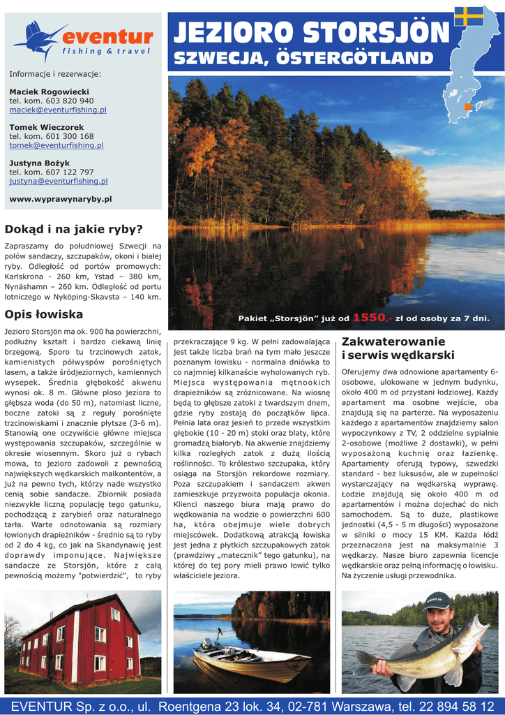 JEZIORO STORSJON SZWECJA, OSTERGOTLAND Informacje i rezerwacje: Maciek Rogowiecki tel. kom. 603 820 940 [email protected] Tomek Wieczorek tel. kom. 601 300 168 [email protected] Justyna Bożyk tel. kom. 607 122 797 [email protected] www.wyprawynaryby.pl Dokąd i na jakie ryby? Zapraszamy do południowej Szwecji na połów sandaczy, szczupaków, okoni i białej ryby. Odległość od portów promowych: Karlskrona - 260 km, Ystad – 380 km, Nynäshamn – 260 km. Odległość od portu lotniczego w Nyköping-Skavsta – 140 km. Opis łowiska Jezioro Storsjön ma ok. 900 ha powierzchni, podłużny kształt i bardzo ciekawą linię brzegową. Sporo tu trzcinowych zatok, kamienistych półwyspów porośniętych lasem, a także śródjeziornych, kamiennych wysepek. Średnia głębokość akwenu wynosi ok. 8 m. Główne ploso jeziora to głębsza woda (do 50 m), natomiast liczne, boczne zatoki są z reguły porośnięte trzcinowiskami i znacznie płytsze (3-6 m). Stanowią one oczywiście główne miejsca występowania szczupaków, szczególnie w okresie wiosennym. Skoro już o rybach mowa, to jezioro zadowoli z pewnością największych wędkarskich malkontentów, a już na pewno tych, którzy nade wszystko cenią sobie sandacze. Zbiornik posiada niezwykle liczną populację tego gatunku, pochodzącą z zarybień oraz naturalnego tarła. Warte odnotowania są rozmiary łowionych drapieżników - średnio są to ryby od 2 do 4 kg, co jak na Skandynawię jest d o p ra w d y i m p o n u j ą c e . N a j w i ę k s z e sandacze ze Storsjön, które z całą pewnością możemy "potwierdzić", to ryby Pakiet „Storsjön” już od przekraczające 9 kg. W pełni zadowalająca jest także liczba brań na tym mało jeszcze poznanym łowisku - normalna dniówka to co najmniej kilkanaście wyholowanych ryb. M i e j s c a w y s t ę p o wa n i a m ę t n o o k i c h drapieżników są zróżnicowane. Na wiosnę będą to głębsze zatoki z twardszym dnem, gdzie ryby zostają do początków lipca. Pełnia lata oraz jesień to przede wszystkim głębokie (10 - 20 m) stoki oraz blaty, które gromadzą białoryb. Na akwenie znajdziemy kilka rozległych zatok z dużą ilością roślinności. To królestwo szczupaka, który osiąga na Storsjön rekordowe rozmiary. Poza szczupakiem i sandaczem akwen zamieszkuje przyzwoita populacja okonia. Klienci naszego biura mają prawo do wędkowania na wodzie o powierzchni 600 ha, która obejmuje wiele dobrych miejscówek. Dodatkową atrakcją łowiska jest jedna z płytkich szczupakowych zatok (prawdziwy „matecznik” tego gatunku), na której do tej pory mieli prawo łowić tylko właściciele jeziora. 1550,- zł od osoby za 7 dni. Zakwaterowanie i serwis wędkarski Oferujemy dwa odnowione apartamenty 6osobowe, ulokowane w jednym budynku, około 400 m od przystani łodziowej. Każdy apartament ma osobne wejście, oba znajdują się na parterze. Na wyposażeniu każdego z apartamentów znajdziemy salon wypoczynkowy z TV, 2 oddzielne sypialnie 2-osobowe (możliwe 2 dostawki), w pełni wyposażoną kuchnię oraz łazienkę. Apartamenty oferują typowy, szwedzki standard - bez luksusów, ale w zupełności wystarczający na wędkarską wyprawę. Łodzie znajdują się około 400 m od apartamentów i można dojechać do nich samochodem. Są to duże, plastikowe jednostki (4,5 - 5 m długości) wyposażone w silniki o mocy 15 KM. Każda łódź przeznaczona jest na maksymalnie 3 wędkarzy. Nasze biuro zapewnia licencje wędkarskie oraz pełną informację o łowisku. Na życzenie usługi przewodnika. EVENTUR Sp. z o.o., ul.. Roentgena 23 lok. 34, 02-781 Warszawa, tel. 22 894 58 12