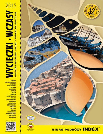 wycieczki autokarowe • wczasy • wypoczynek i zwiedzanie WYCIECZKI • WCZASY 2015 PRAGA CZESKIE ZAMKI WIEDEŃ BUDAPESZT BERLIN BAWARIA PARYŻ RZYM LONDYN AMSTERDAM WILNO S. PETERSBURG RUMUNIA NORWEGIA SZWAJCARIA WŁOCHY SYCYLIA GRECJA CHORWACJA CZARNOGÓRA HISZPANIA BUŁGARIA Rezerwacja on-line www.indexpolska.com.pl BIURO PODRÓŻY Grecja (Kamena Vourla, Thassos - 7 nocl.) Włochy (Tor San Lorenzo) Węgry (Balaton) Grecja (Paralia-9 nocl.) Bułgaria Hiszpania (Lloret de Mar) Hiszpania z Paryżem Chorwacja Włochy (Rimini) Czarnogóra Włochy (Południowe - Neapol) Hiszpania (Andaluzja) Włochy (Liguria) WCZASY Sycylia Amsterdam Bawaria Dania i Szwecja, Szwajc. Norwegia Grecja (Peloponez) Petersburg, Kraje Nadbałt. (Łotwa, Estonia) Rumunia Paryż Londyn Paryż i zamki Rzym, Francja (Lazurowe Wybrzeże) Włochy (Wenecja) Wł. (Toskania) Chorwacja Hiszpania Berlin i Drezno WYCIECZKI oraz WYPOCZYNEK I ZWIEDZANIE Budapeszt i Zakole Dunaju Praga i Czeskie Zamki Wiedeń Budapeszt Lwów ROZKŁAD JAZDY Wilno Berlin Praga miejsca odjazdów BIELSKO BIAŁA dworzec PKS - 03:45 01:45 01:45 01:45 01:45 05:45 03:45 03:45 08:45 10:45 16:45 08:45 17:45 19:45 08:30 17:45 04:45 18:00 16:15 15:20 02:30 16:15 11:45 07:00 04:45 08:45 11:00 07:00 06:15 + 50 zł + 50 zł + 50 zł + 50 zł dolna płyta, ul. Warszawska + 50 zł + 50 zł + 50 zł + 50 zł + 50 zł + 50 zł + 50 zł + 70 zł + 70 zł + 70 zł + 30 zł BOLESŁAWIEC-OSŁA ___ ___ ___ 07:00 ___ ___ ___ 09:00 14:00 ___ ___ 14:00 ___ ___ ___ 23:00 ___ ___ ___ ___ ___ ___ ___ ___ 10:00 14:00 ___ ___ ___ CHRZANÓW 02:15 03:30 02:15 02:15 02:15 04:15 04:15 04:15 09:15 09:15 15:15 09:15 18:15 18:15 ___ 18:15 05:15 16:15 14:45 ___ ___ ___ ___ ___ ___ ___ ___ ___ ___ stacja Shell - ul. Trzebińska + 30 zł CIESZYN 04:15 ___ ___ ___ ___ 06:15 ___ ___ ___ 11:15 17:15 ___ ___ 20:15 09:15 ___ ___ 18:30 16:45 16:00 ___ 16:45 12:15 07:30 ___ ___ 11:30 07:30 06:45 CZĘSTOCHOWA 01:30 01:30 01:30 01:30 04:00 03:30 03:30 03:30 08:30 08:30 14:30 08:30 20:00 17:30 ___ 17:30 07:00 15:30 14:00 12:00 02:15 14:00 09:30 04:30 04:30 08:30 08:30 04:30 03:45 Parking przy KFC, autostrada A4 + 30 zł + 30 zł + 30 zł + 30 zł + 30 zł + 30 zł + 30 zł + 30 zł + 30 zł + 30 zł + 30 zł + 30 zł + 30 zł + 30 zł + 40 zł + 40 zł + 30 zł Boguszowice - przejście graniczne McDonald’s - al. Wojska Polskiego + 50 zł + 50 zł + 50 zł + 50 zł + 50 zł + 50 zł + 50 zł + 50 zł + 50 zł + 50 zł + 50 zł + 50 zł + 50 zł + 70 zł + 70 zł + 80 zł + 70 zł + 70 zł + 70 zł + 70 zł + 70 zł + 70 zł + 90 zł + 70 zł + 60 zł GLIWICE dworzec PKP - zatoczki, 02:00 02:00 03:30 03:30 02:00 04:00 05:30 05:30 10:45 09:00 15:00 10:45 18:00 18:00 05:40 19:45 05:00 16:00 14:30 12:50 04:30 14:30 10:00 05:00 06:45 10:45 08:30 05:00 ___ ul. Bohaterów Getta Warszawskiego + 30 zł + 30 zł + 30 zł + 30 zł + 30 zł + 30 zł + 30 zł + 30 zł + 30 zł + 50 zł + 50 zł + 50 zł + 50 zł + 50 zł + 50 zł + 50 zł + 50 zł KATOWICE McDonald’s/Praktiker, 03:00 03:00 03:00 03:00 03:00 05:00 05:00 05:00 10:00 10:00 16:00 10:00 19:00 19:00 07:00 19:00 06:00 17:00 15:30 14:00 03:45 15:30 11:00 06:00 06:00 10:00 09:45 06:00 05:00 al. Górnośląska w stronę Wrocławia KIELCE dworzec PKP - zatoczki, Plac Niepodległości 23:15* 23:15* 23:15* 23:15* 04:30 01:15 01:15 01:15 06:00 06:00 12:00 06:00 20:30 15:00 ___ 15:00 ___ 13:00 11:30 ___ ___ 11:30 07:00 02:00 02:00 06:00 ___ 02:00 ___ KRAKÓW 01:30 04:00 01:30 01:30 01:30 03:30 03:30 03:30 08:15 08:15 14:15 08:15 17:15 17:15 06:00 17:15 04:30 15:15 13:45 12:00 02:00 13:45 09:15 04:15 04:15 08:15 08:30 04:15 03:30 Hotel Cracovia - ul. Kałuży + 50 zł LESZNO 21:00* 21:00* 04:00 04:00 21:00* 23:00* 06:00 06:00 10:30 04:00 10:00 10:30 ___ 13:00 ___ 19:30 10:00 11:00 09:30 ___ ___ ___ ___ ___ ___ ___ ___ ___ ___ stacja Shell - al. Konstytucji 3 Maja + 90 zł + 90 zł + 60 zł + 60 zł + 90 zł + 90 zł + 60 zł + 60 zł + 60 zł + 90 zł + 90 zł + 60 zł LUBLIN parking, Hala MOSIR 19:15* 19:15* 19:15* 19:15* 03:15 21:15* 21:15* 21:15* 02:00 02:00 08:00 02:00 ___ 11:00 ___ 11:00 ___ 09:00 07:30 ___ ___ 07:30 03:00 22:00* 22:00* 02:00 ___ 22:00* ___ al. Zygmuntowskie + 100 zł + 100 zł + 100 zł + 100 zł + 80 zł + 100 zł + 100 zł + 100 zł + 100 zł + 100 zł + 100 zł + 100 zł ŁÓDŹ Kaliska parking koło 23:15* 23:15* 23:15* 02:45 06:15 01:15 01:15 01:15 06:15 06:15 12:15 06:15 22:15 15:15 ___ 15:15 09:15 13:15 11:45 ___ 23:45 11:45 07:15 02:15 02:15 06:15 ___ 02:15 01:30 poczty, al. Włókniarzy + 90 zł + 90 zł + 90 zł + 90 zł OPOLE dworzec PKP - parking, 00:45 00:45 04:30 04:30 00:45 02:45 06:30 06:30 11:30 07:45 13:45 11:30 16:45 16:45 ___ 20:30 03:45 14:45 13:15 11:30 05:15 13:15 08:45 03:45 07:30 11:30 07:15 03:45 03:30 ul. Krakowska + 70 zł + 70 zł + 70 zł + 70 zł + 70 zł + 70 zł + 70 zł + 70 zł + 70 zł + 70 zł + 70 zł + 70 zł + 70 zł + 70 zł + 50 zł + 50 zł + 50 zł + 50 zł + 50 zł + 50 zł + 50 zł + 50 zł + 50 zł + 50 zł + 50 zł + 50 zł + 50 zł + 50 zł + 90 zł + 100 zł + 90 zł + 90 zł + 90 zł + 90 zł + 90 zł + 90 zł + 90 zł + 50 zł + 50 zł + 50 zł + 50 zł + 90 zł + 70 zł + 90 zł + 90 zł + 50 zł + 50 zł + 60 zł + 60 zł + 90 zł + 90 zł + 90 zł + 90 zł + 90 zł + 60 zł + 60 zł + 60 zł + 60 zł + 60 zł + 60 zł + 90 zł + 60 zł + 50 zł + 60 zł + 60 zł + 120 zł + 120 zł + 100 zł + 120 zł + 120 zł + 90 zł + 50 zł + 50 zł + 110 zł + 110 zł + 120 zł + 120 zł + 120 zł + 120 zł + 120 zł + 110 zł + 110 zł + 110 zł + 110 zł + 110 zł + 110 zł + 50 zł + 80 zł + 80 zł + 70 zł + 80 zł + 80 zł + 80 zł + 120 zł + 110 zł + 80 zł + 80 zł + 80 zł + 50 zł PIOTRKÓW TRYBUNALSKI 00:15 00:15 00:15 00:15 05:15 02:15 02:15 02:15 07:15 07:15 13:15 07:15 21:15 16:15 ___ 16:15 08:15 14:15 12:45 10:50 ___ 12:45 08:15 03:15 03:15 07:15 06:15 03:15 02:30 stacja benz. Huzar - ul. Sikorskiego 52 + 70 zł + 70 zł + 70 zł + 70 zł + 70 zł + 70 zł + 70 zł + 70 