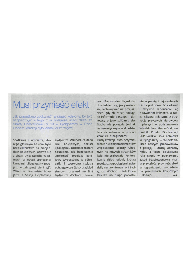 Musi przynieść efekt Jak prawidłowo „pokonać" przejazd kolejowy, by być bezpiecznym - tego m.in. kolejarze uczyli dzieci ze Szkoły Podstawowej nr 19 w Bydgoszczy w Dzień Dziecka. Atrakcji było jednak dużo więcej. Spotkanie z uczniami, któ rego głównym hasłem było bezpieczeństwo na przejaz dach kolejowych, odbyło się z okazji Dnia Dziecka w ra mach VI edycji społecznej kampanii „Bezpieczny prze jazd - zatrzymaj się i żyj". Wzięli w nim udział kole jarze z Sekcji Eksploatacji Bydgoszcz Wschód Zakładu Linii Kolejowych, sokiści i policjanci. Dzieciaki zostały nauczone, jak bezpiecznie „pokonać" przejazd kole jowy wyposażony w półro gatki i czerwone światła ostrzegawcze (jako przykład stanowił przejazd na linii Bydgoszcz Wschód - Kowa lewo Pomorskie). Najmłodsi dowiedzieli się, jak powinni się zachowywać na przejaz dach, gdy zbliża się pociąg, co informuje pieszego i kie rowcę o jego zbliżaniu się. Nauka nie polegała jednak na teoretycznym wykładzie, lecz na zabawie w postaci konkursu z nagrodami. Dużą atrakcją było przymie rzenie niektórych elementów wyposażenia sokisty. Chęt nych na nowych strażników kolei nie brakowało. Po kon kursie dzieci odbyły krótką przejażdżkę pociągiem i zwie dziły nastawnię na stacji Byd goszcz Wschód. - Taki Dzień Dziecka na długo pozosta nie w pamięci najmłodszych i ich opiekunów. To ciekawe i aktywne zapoznanie się z zawodem kolejarza, a tak że zabawa połączona z edu kacją przyszłych kierowców i pieszych - podsumowuje Włodzimierz Kiełczyński, na czelnik Działu Eksploatacji PKP Polskie Linie Kolejowe w Bydgoszczy. - Współdzia łanie naszych pracowników z policją i Strażą Ochrony Kolei, a także edukacyjna rola szkoły w poznawaniu zasad bezpieczeństwa musi w przyszłości przynieść efekt w ograniczeniu wypadków na przejazdach kolejowych - dodaje. red