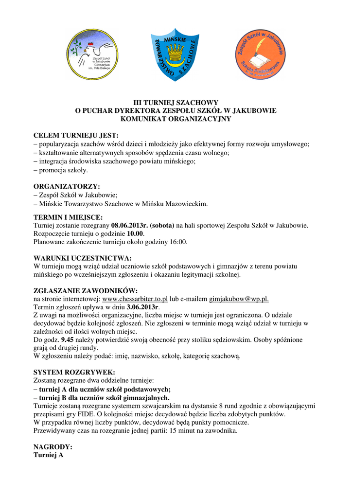 III TURNIEJ SZACHOWY O PUCHAR DYREKTORA ZESPOŁU SZKÓŁ W JAKUBOWIE KOMUNIKAT ORGANIZACYJNY CELEM TURNIEJU JEST: − popularyzacja szachów wśród dzieci i młodzieży jako efektywnej formy rozwoju umysłowego; − kształtowanie alternatywnych sposobów spędzenia czasu wolnego; − integracja środowiska szachowego powiatu mińskiego; − promocja szkoły. ORGANIZATORZY: − Zespół Szkół w Jakubowie; − Mińskie Towarzystwo Szachowe w Mińsku Mazowieckim. TERMIN I MIEJSCE: Turniej zostanie rozegrany 08.06.2013r. (sobota) na hali sportowej Zespołu Szkół w Jakubowie. Rozpoczęcie turnieju o godzinie 10.00. Planowane zakończenie turnieju około godziny 16:00. WARUNKI UCZESTNICTWA: W turnieju mogą wziąć udział uczniowie szkół podstawowych i gimnazjów z terenu powiatu mińskiego po wcześniejszym zgłoszeniu i okazaniu legitymacji szkolnej. ZGŁASZANIE ZAWODNIKÓW: na stronie internetowej: www.chessarbiter.to.pl lub e-mailem [email protected]. Termin zgłoszeń upływa w dniu 3.06.2013r. Z uwagi na możliwości organizacyjne, liczba miejsc w turnieju jest ograniczona. O udziale decydować będzie kolejność zgłoszeń. Nie zgłoszeni w terminie mogą wziąć udział w turnieju w zależności od ilości wolnych miejsc. Do godz. 9.45 należy potwierdzić swoją obecność przy stoliku sędziowskim. Osoby spóźnione grają od drugiej rundy. W zgłoszeniu należy podać: imię, nazwisko, szkołę, kategorię szachową. SYSTEM ROZGRYWEK: Zostaną rozegrane dwa oddzielne turnieje: − turniej A dla uczniów szkół podstawowych; − turniej B dla uczniów szkół gimnazjalnych. Turnieje zostaną rozegrane systemem szwajcarskim na dystansie 8 rund zgodnie z obowiązującymi przepisami gry FIDE. O kolejności miejsc decydować będzie liczba zdobytych punktów. W przypadku równej liczby punktów, decydować będą punkty pomocnicze. Przewidywany czas na rozegranie jednej partii: 15 minut na zawodnika. NAGRODY: Turniej A − puchar za I miejsce w kat. klas I-III; − puchar za I miejsce w kat. klas IV-VI; − medale za I, II i III miejsce w kat. klas I-III; − medale za I, II i III miejsce w kat. klas IV-VI; − puchar dla najlepszej zawodniczki; − puchar dla najlepszego zawodnika ucz. Szkoły Podstawowej w Jakubowie; − nagroda rzeczowa dla najmłodszego zawodnika. Turniej B − puchar za I miejsce; − medale za I, II i III miejsce; − puchar dla najlepszej zawodniczki; − puchar dla najlepszego zawodnika ucz. Gimnazjum w Jakubowie. SEDZIOWANIE: W turnieju obowiązywać będą przepisy Kodeksu Szachowego Polskiego Związku Szachowego. Sędzia głównym Turnieju będzie sędzia szachowy II klasy – Andrzej Koseski. USTALENIA KONCOWE: − organizatorzy zapewniają kawiarenkę bogatą w ciasta i napoje; − w przypadku małej liczby uczestników organizator dopuszcza możliwosc rozegrania jednego turnieju z końcową klasyfikacją oddzielną dla poszczególnych rodzajów szkół; − organizator zastrzega sobie prawo przyznania dodatkowych nagród w dodatkowych kategoriach; − ostateczna interpretacja regulaminu należy do sędziego głównego turnieju; − uczestnicy ubezpieczają się we własnym zakresie; − na terenie szkoły obowiązuje zmiana obuwia. Turniej bez wpisowego! Turniej został sfinansowany ze środków Samorządu Województwa Mazowieckiego